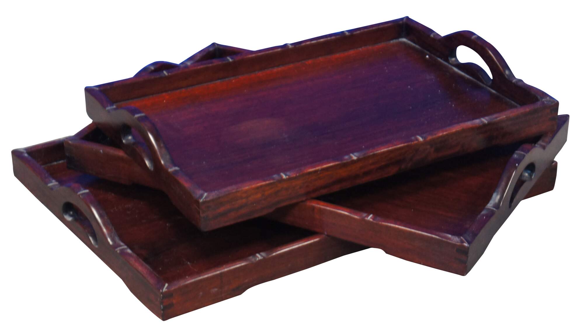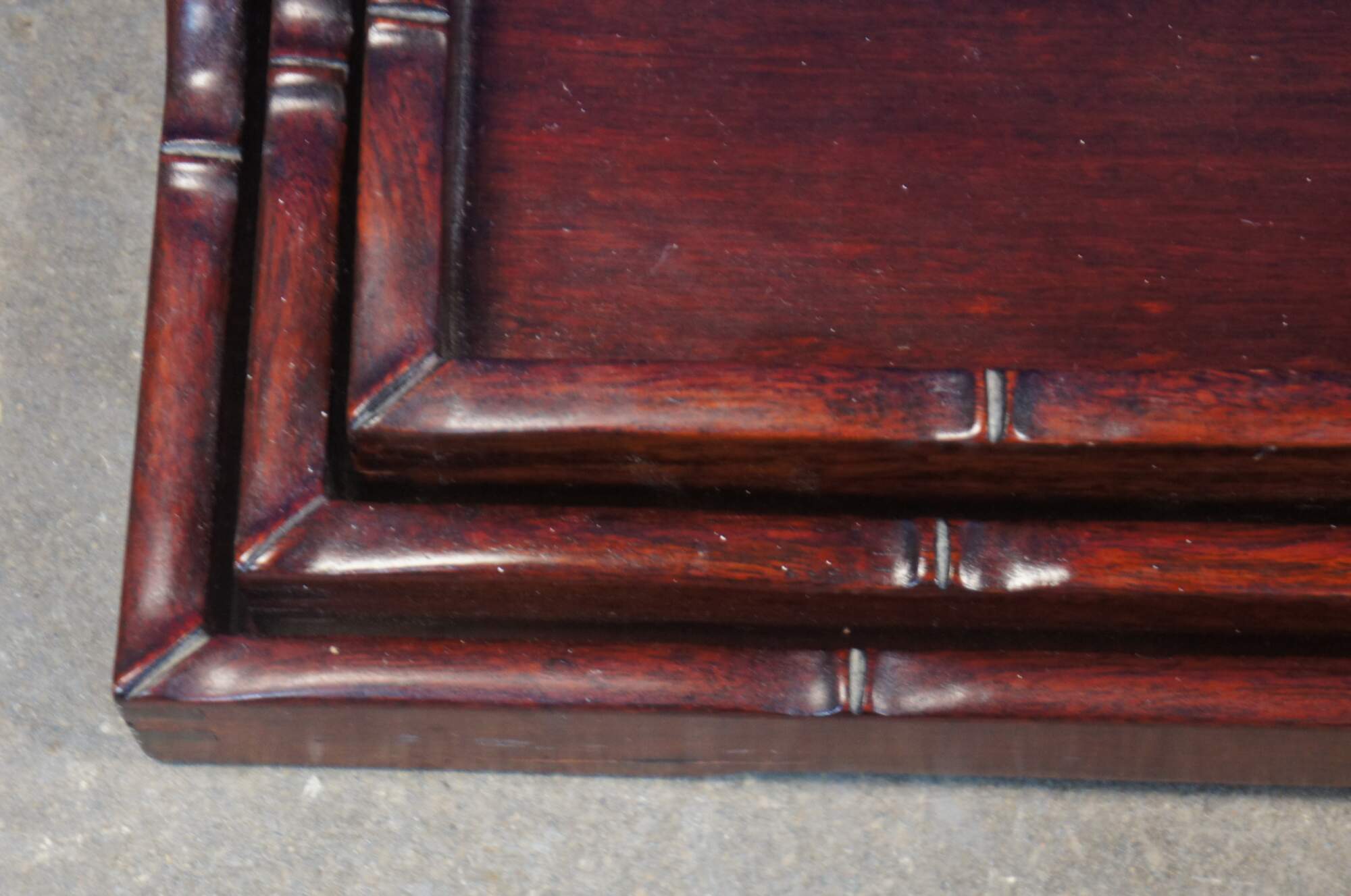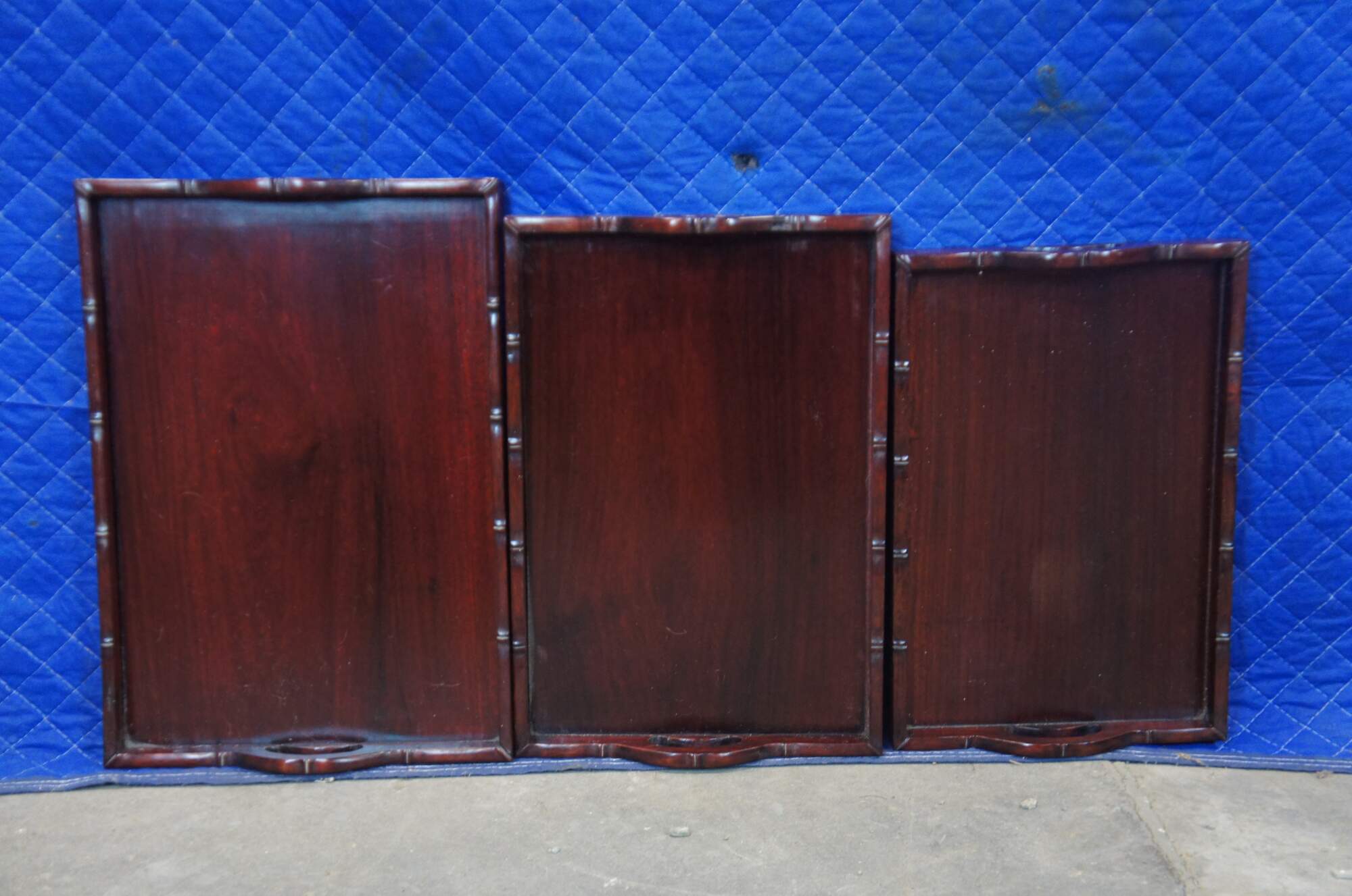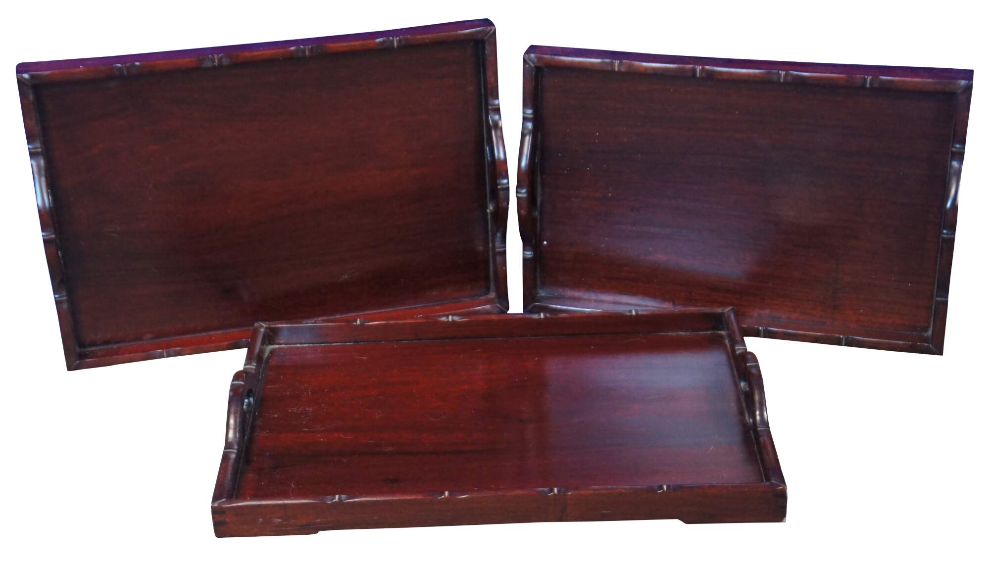 Set of three mid century rosewood nesting serving bar or tea trays with arched handles and faux bamboo style edge.