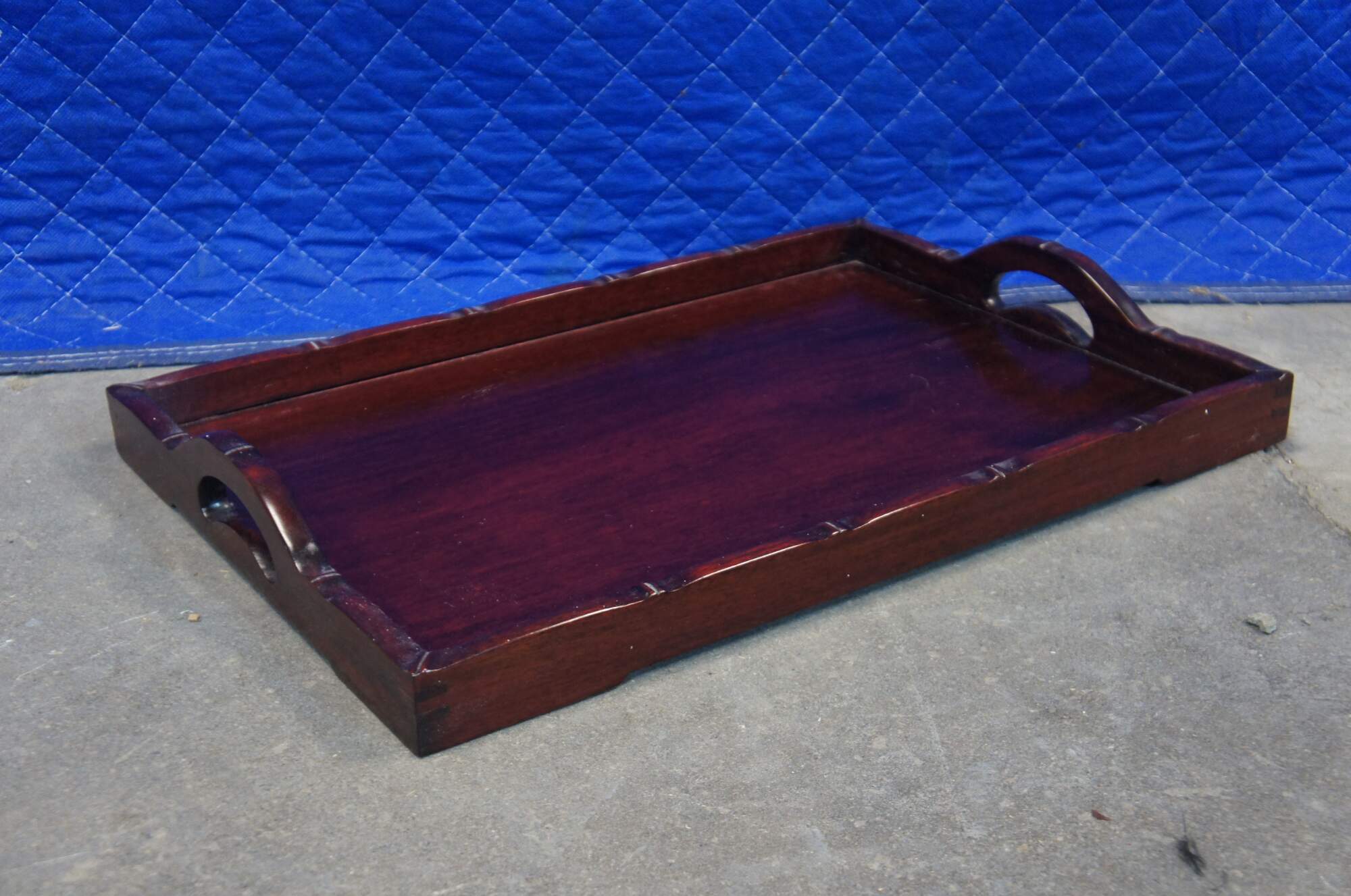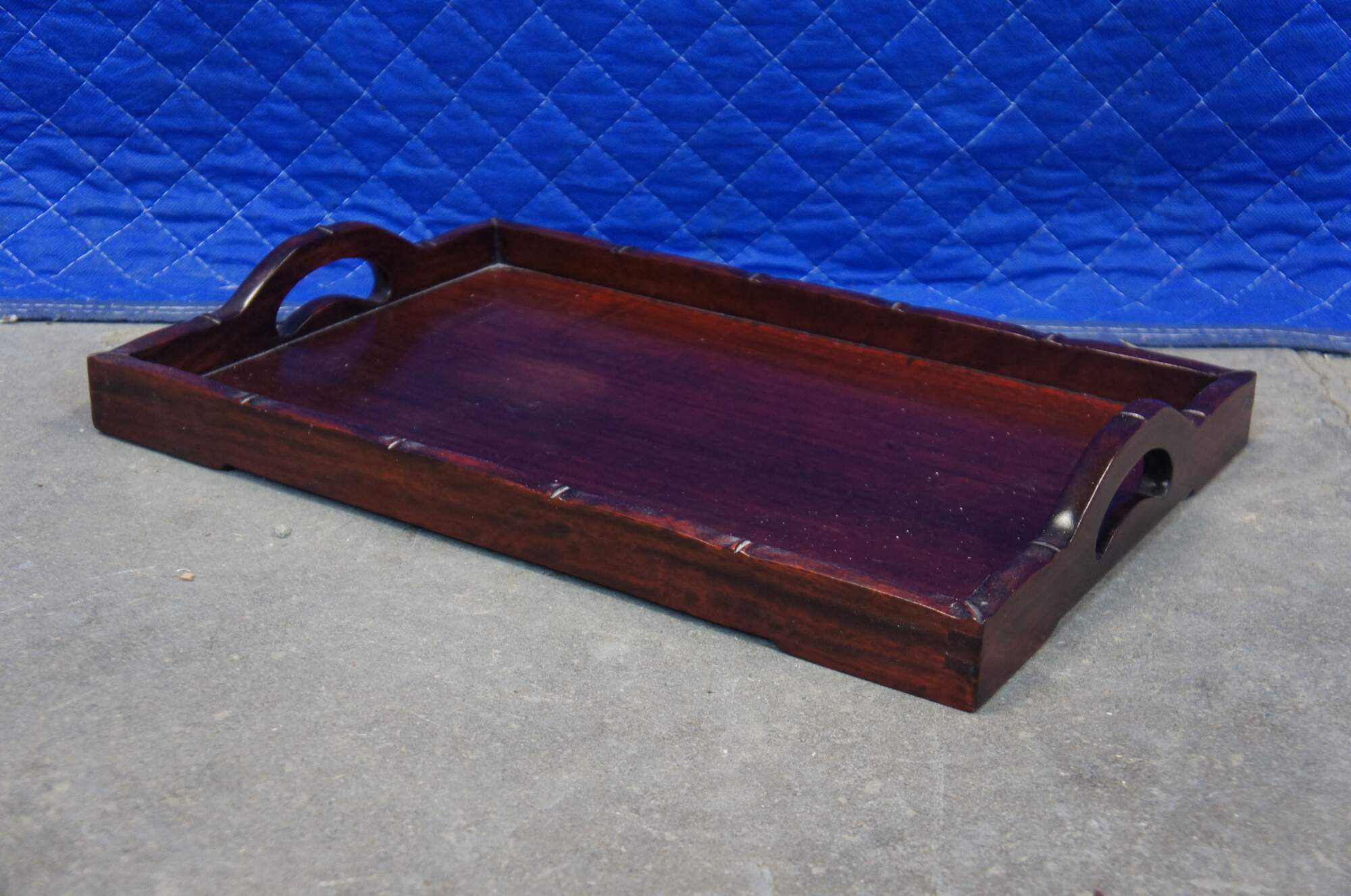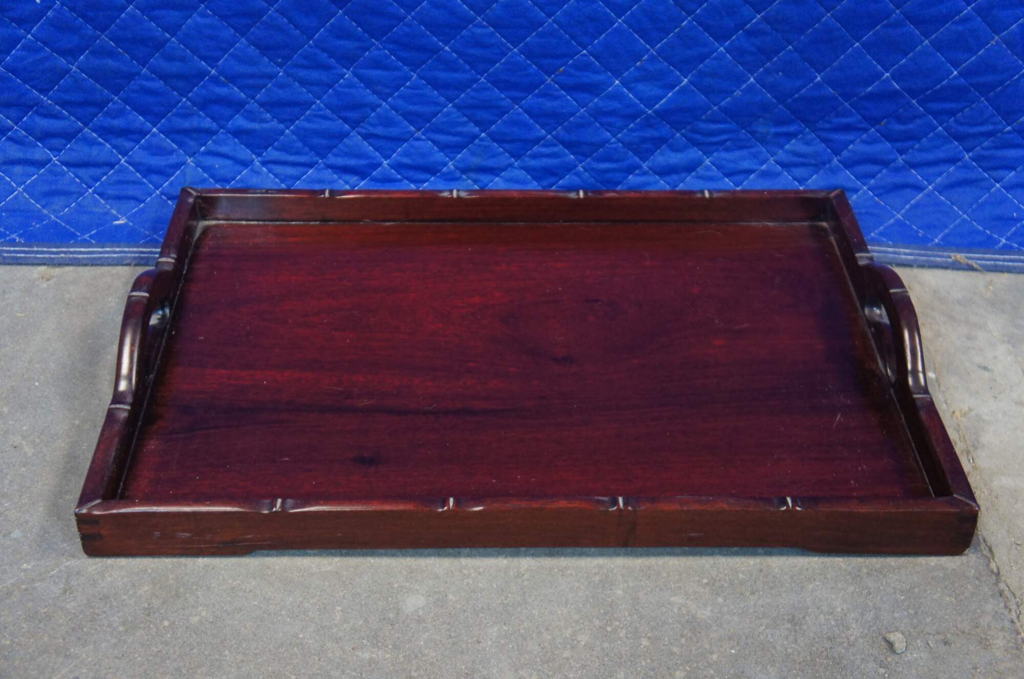 Set of three mid century rosewood nesting serving bar or tea trays with arched handles and faux bamboo style edge.