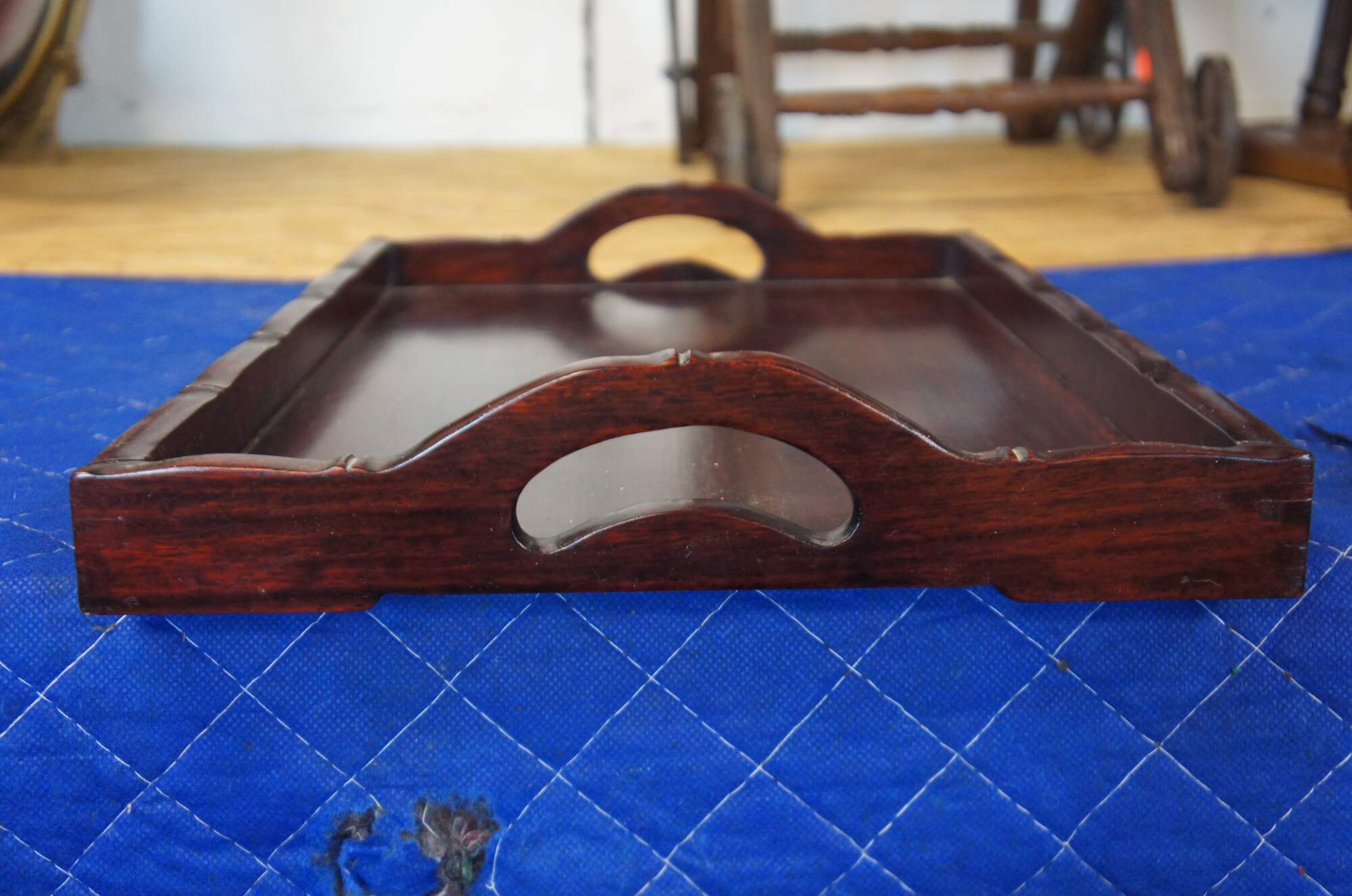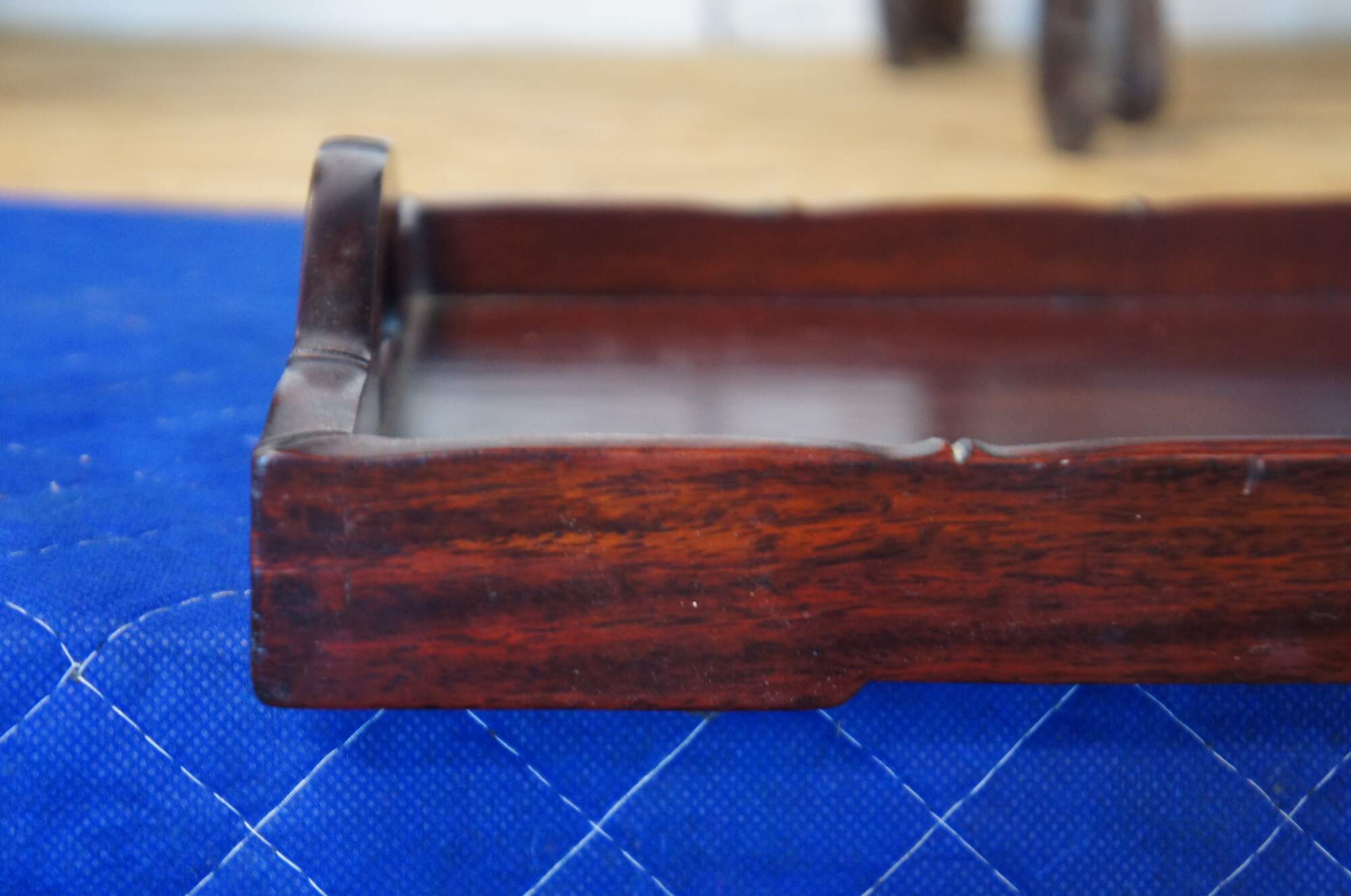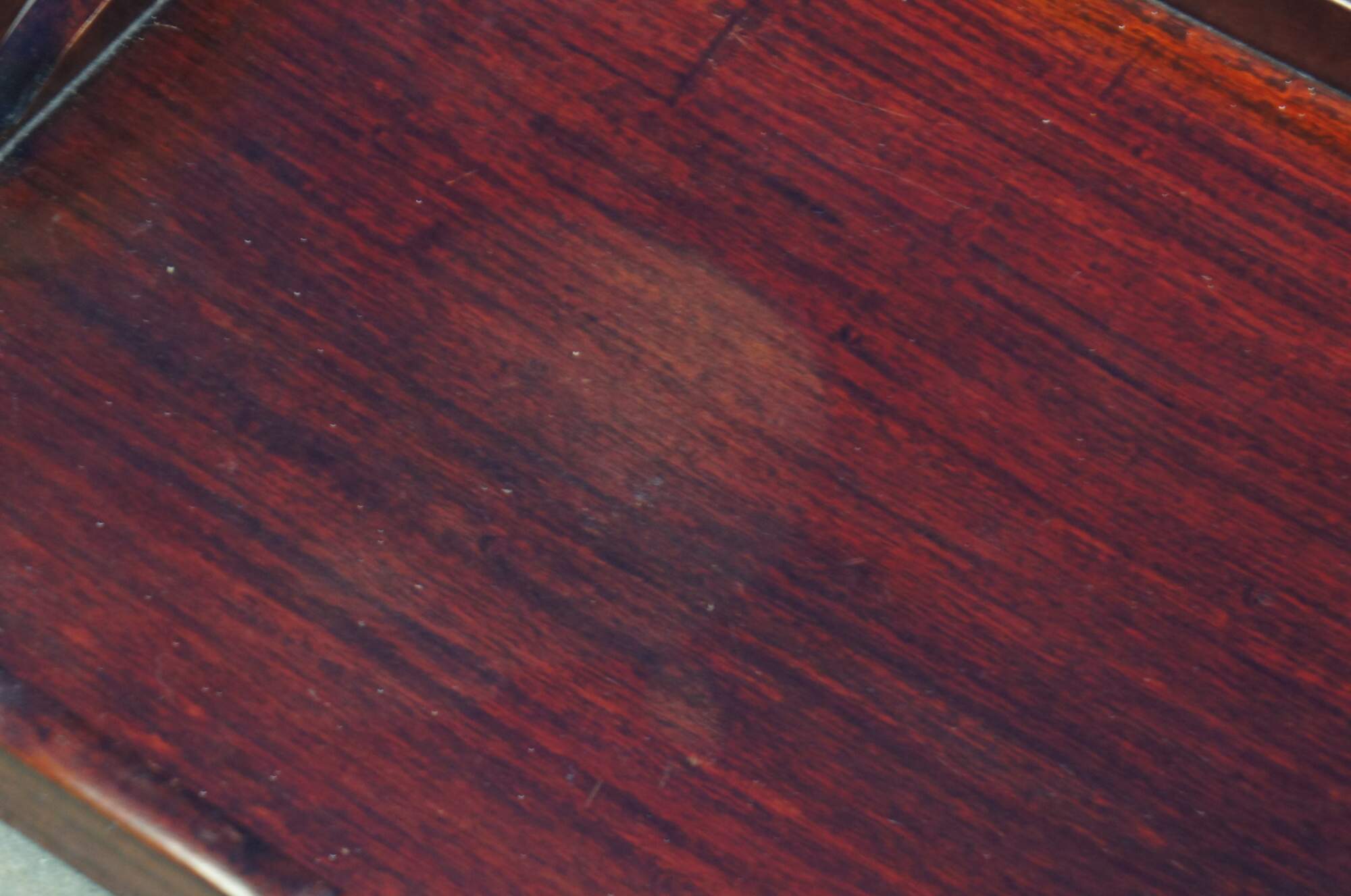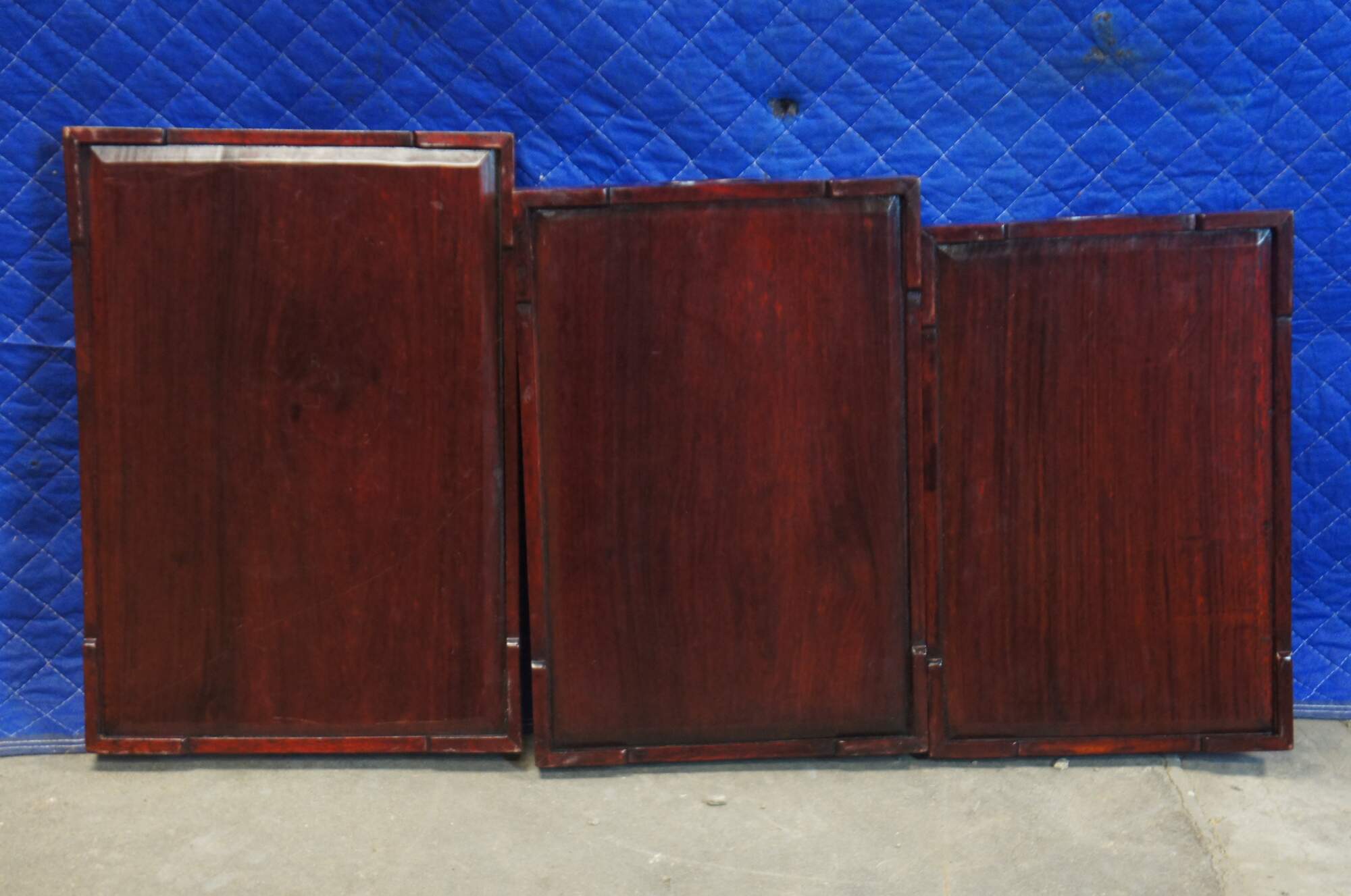 Set of three mid century rosewood nesting serving bar or tea trays with arched handles and faux bamboo style edge.