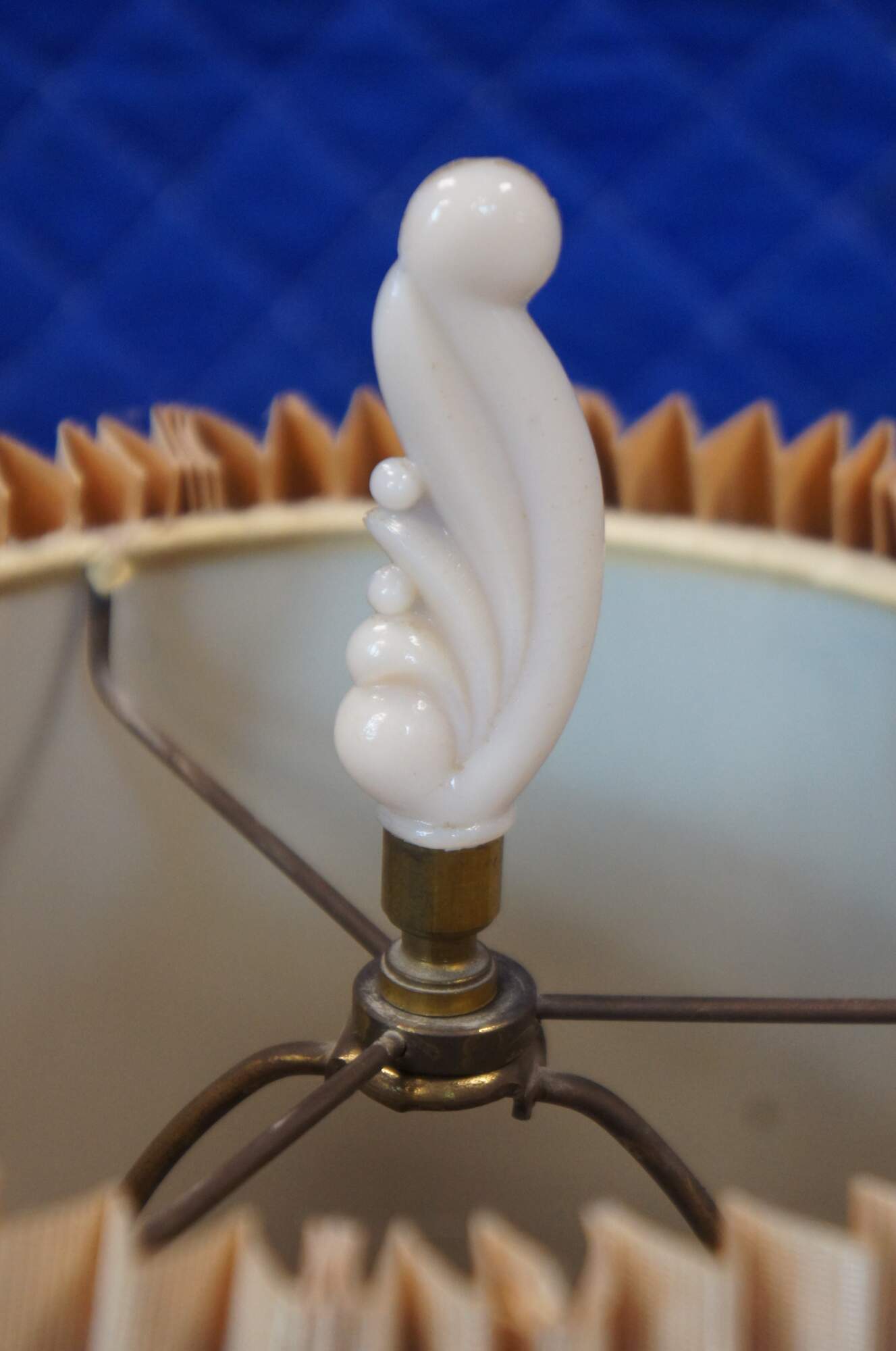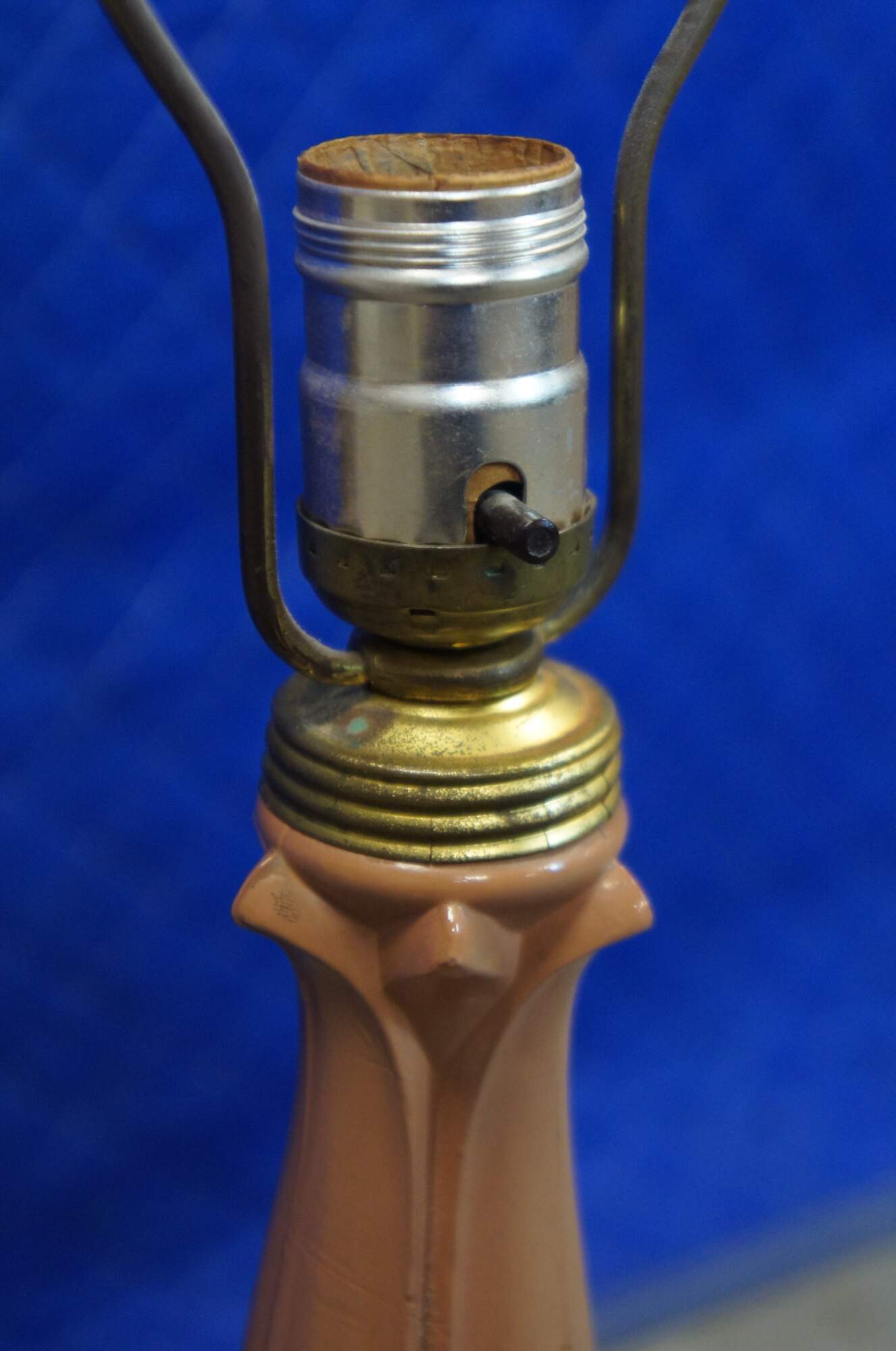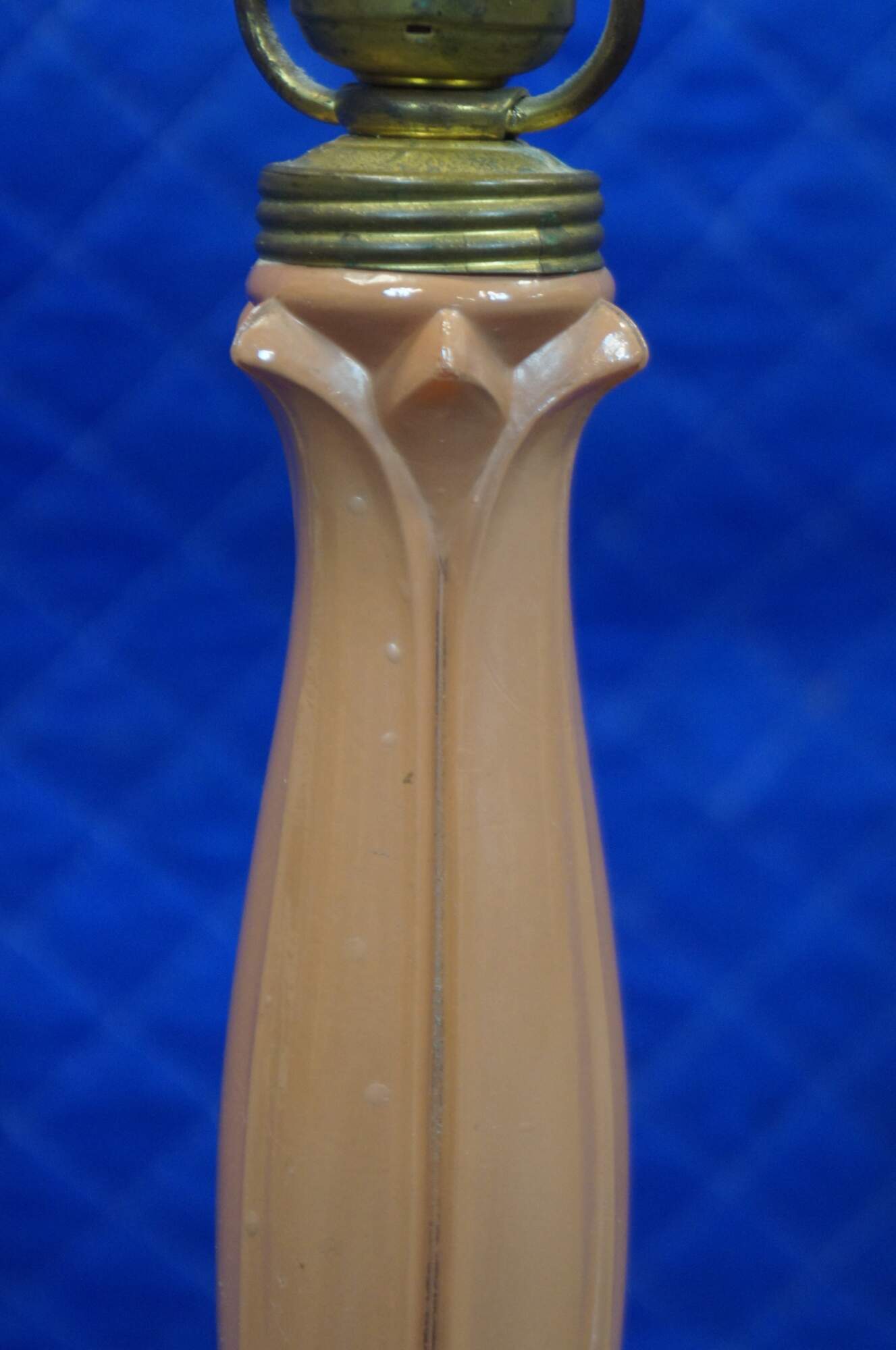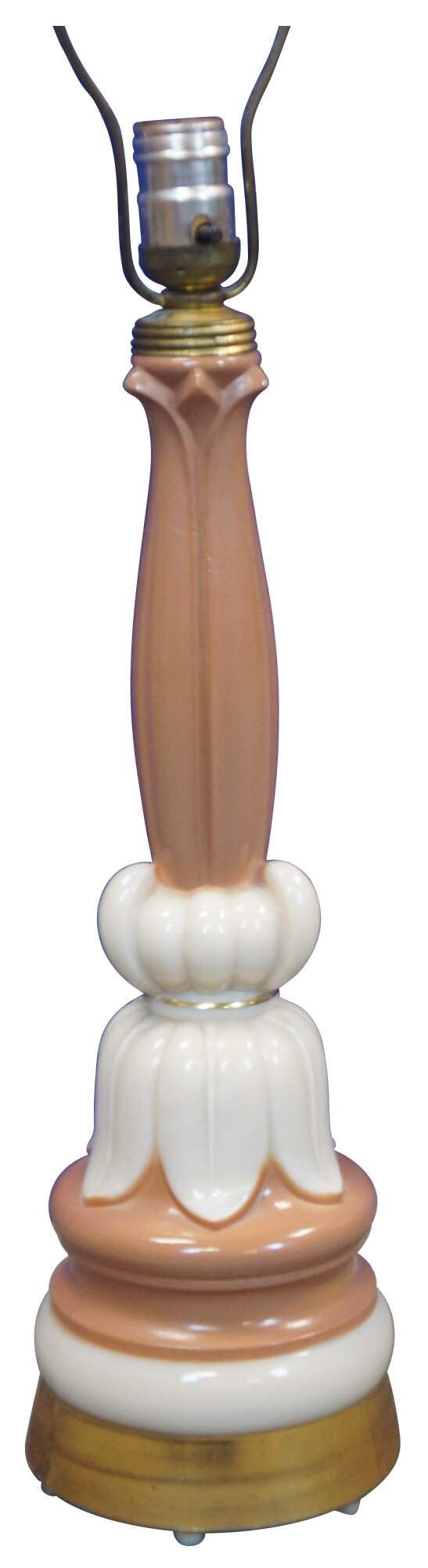 Antique Aladdin Alacite table lamp with an art deco floral design in milk white and dusty rose.