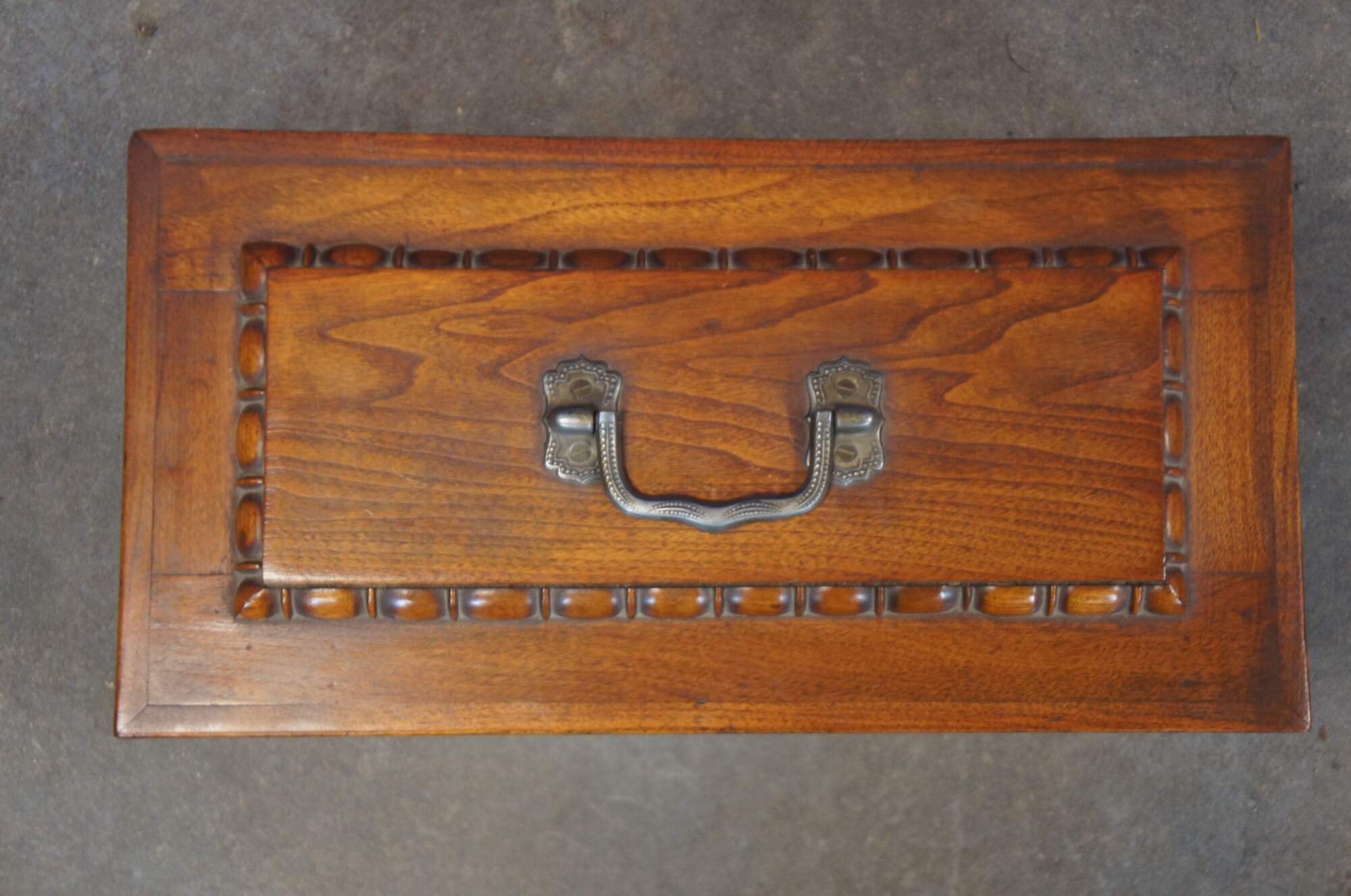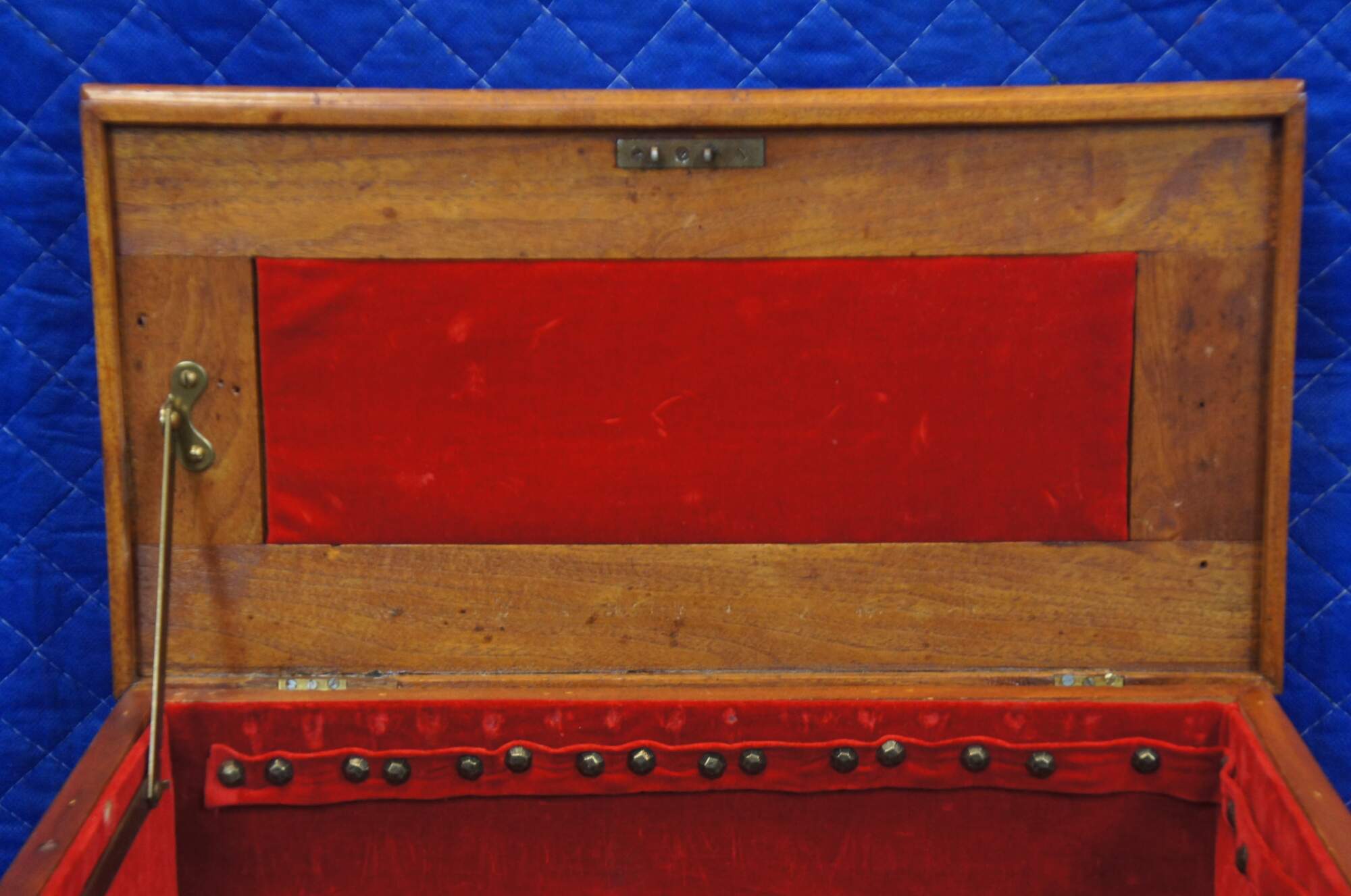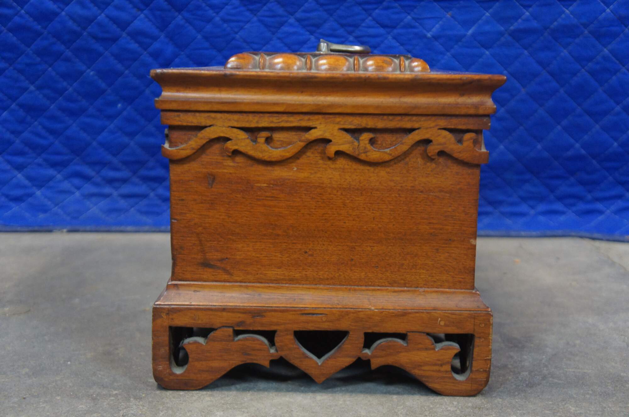 Antique red velvet lined carved and reticulated oak jewelry keepsake box or chest with handle on top and lock on the front.