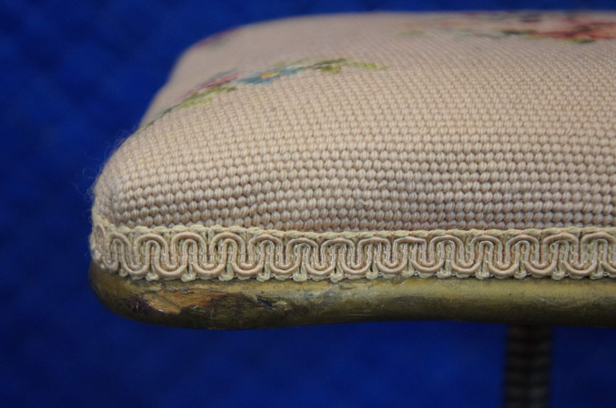 Antique Victorian piano stool with a wood and metal baluster shaped base with cabriole paw feet, painted gold, and a square adjustable height seat covered in pink floral needlepoint.