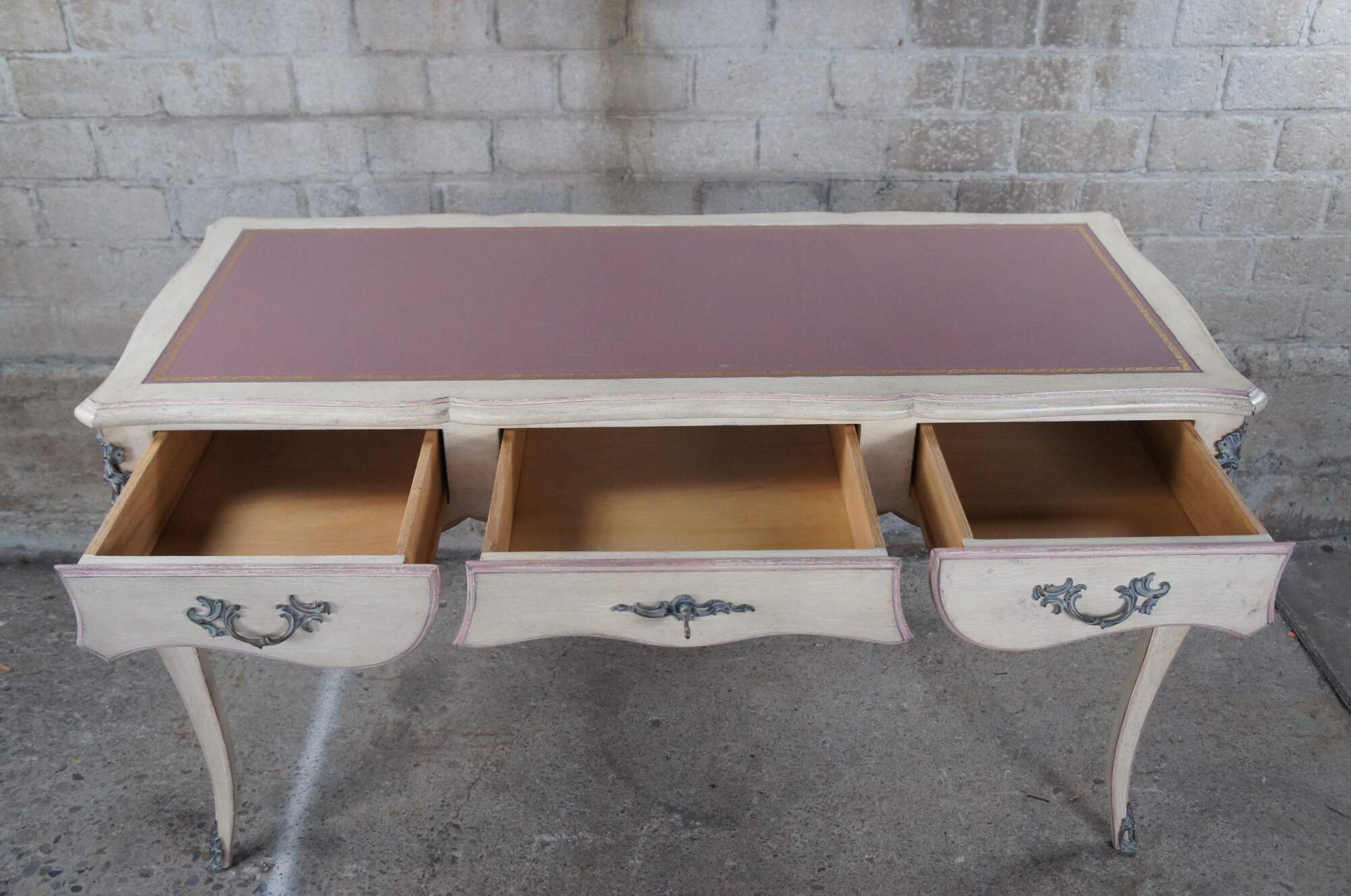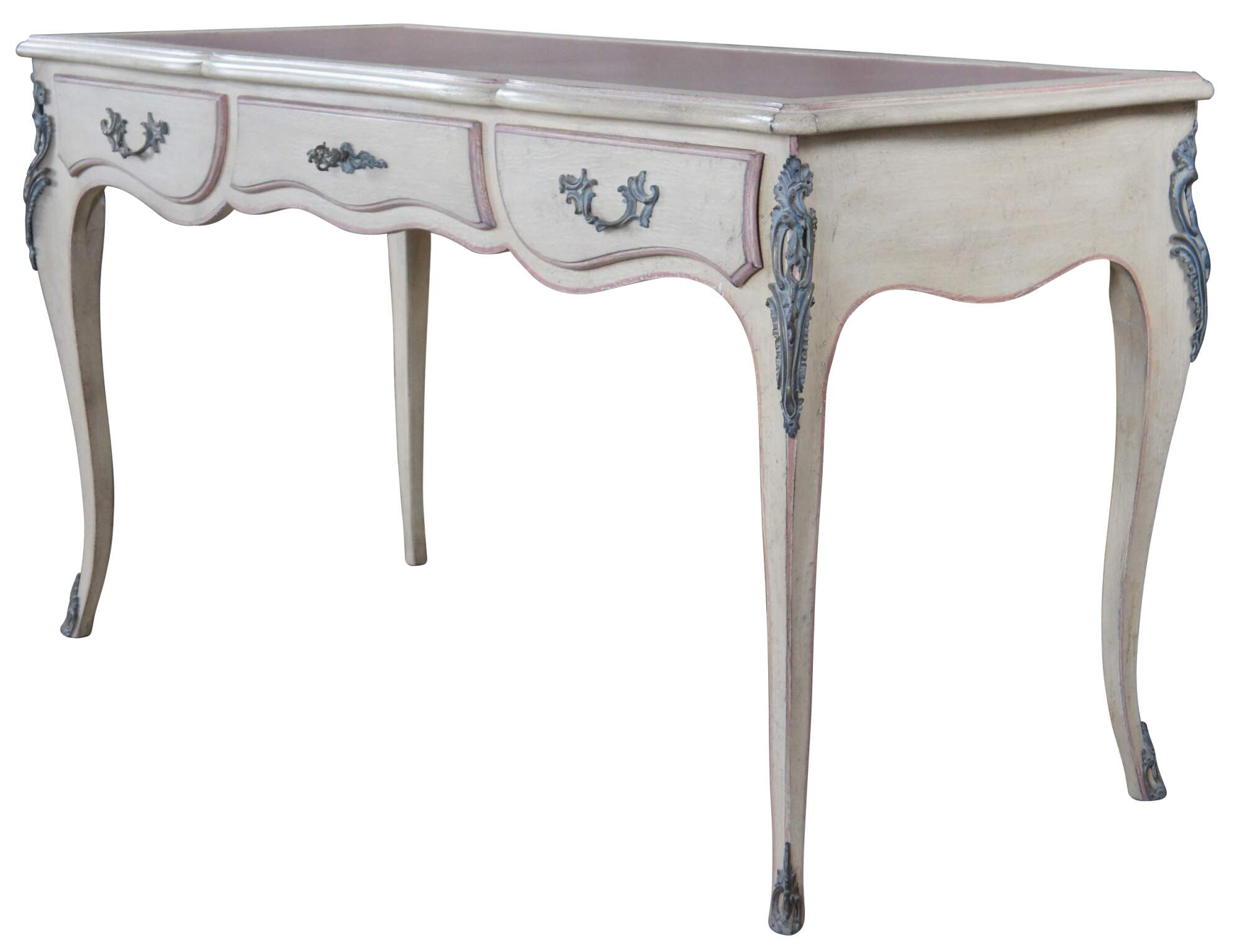 Custom ordered French Provincial Bureau Plat or lady's writing desk by Auffray & Company. Features a shaped serpentine top with pink tooled leather, a frieze fitted with three drawers and ornate bronze ormolu mounts, raised over cabriole legs. Made walnut with oak drawers. Circa 1970s
