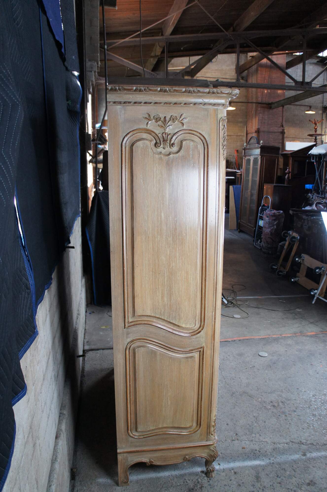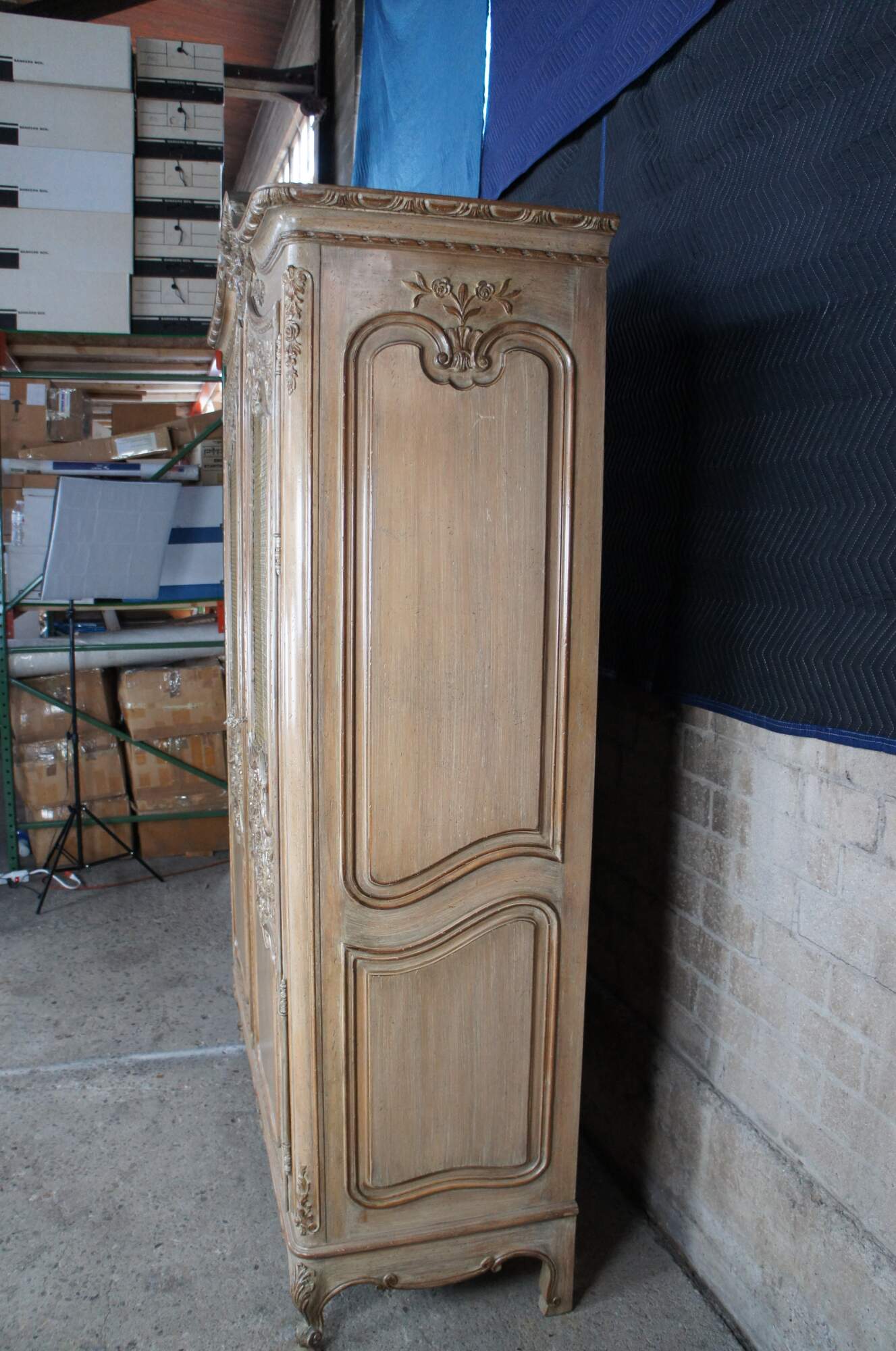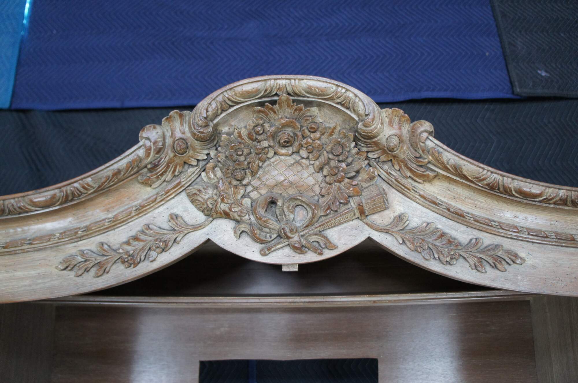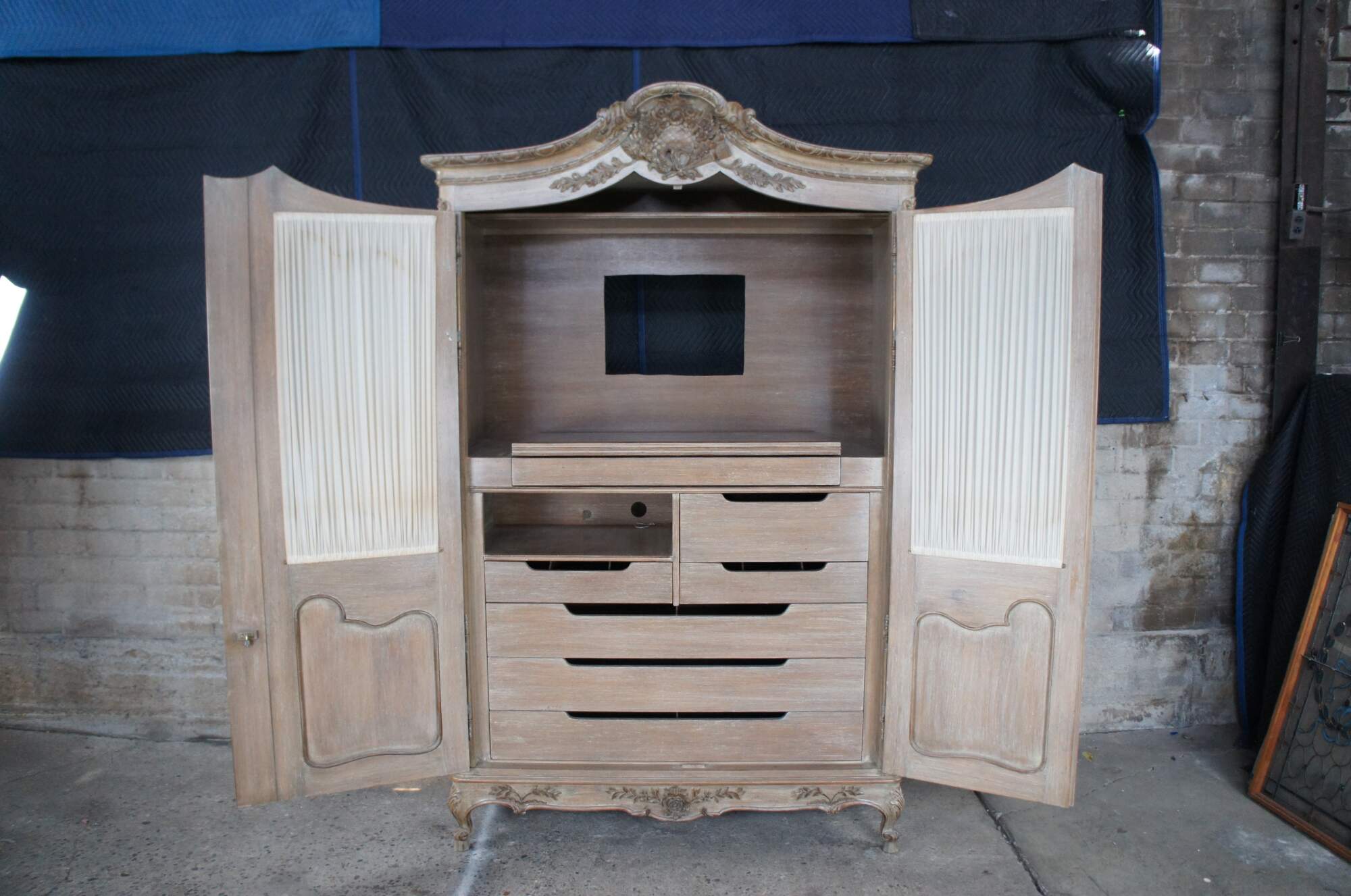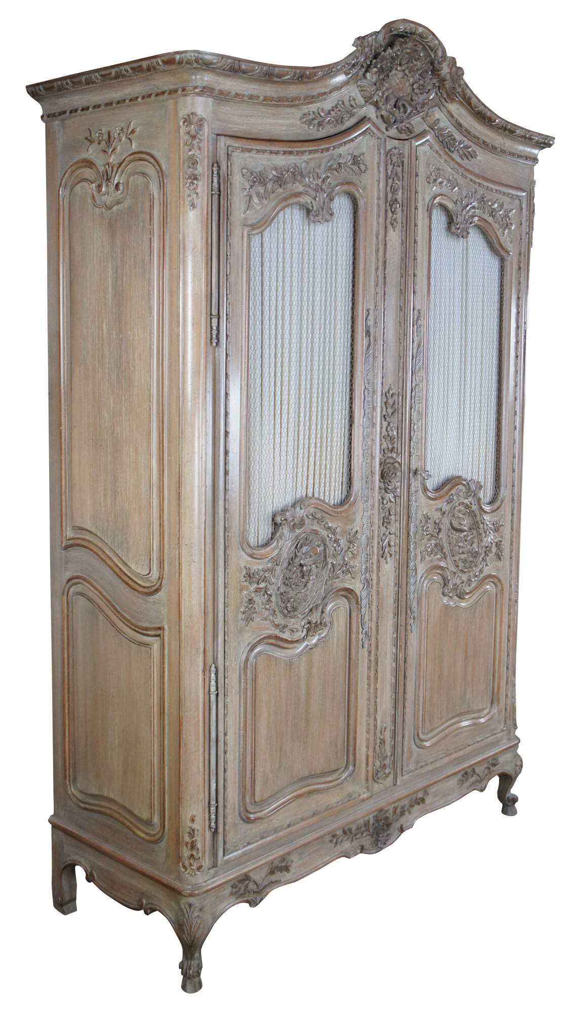 Vintage Auffray & Co fine French furniture armoire. Featuring a blend of Country French and Provincial styling with Neoclassical accents, chicken wire drape doors and cabriole legs. Opens to TV compartment with area for components and six additional entertainment or clothing storage drawers.