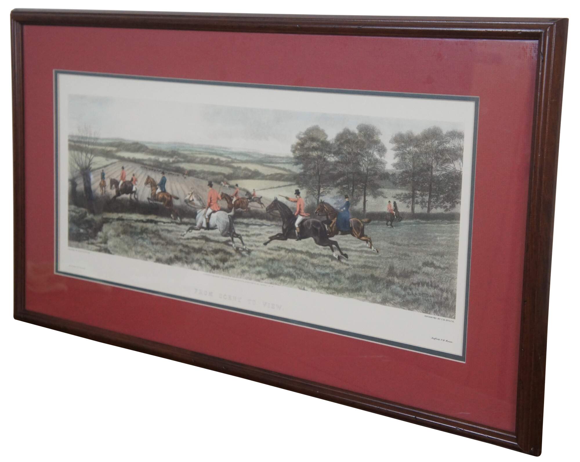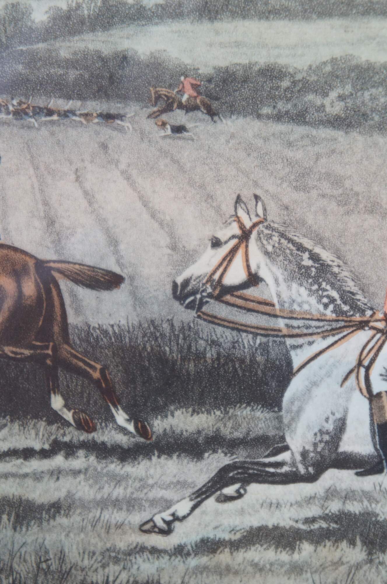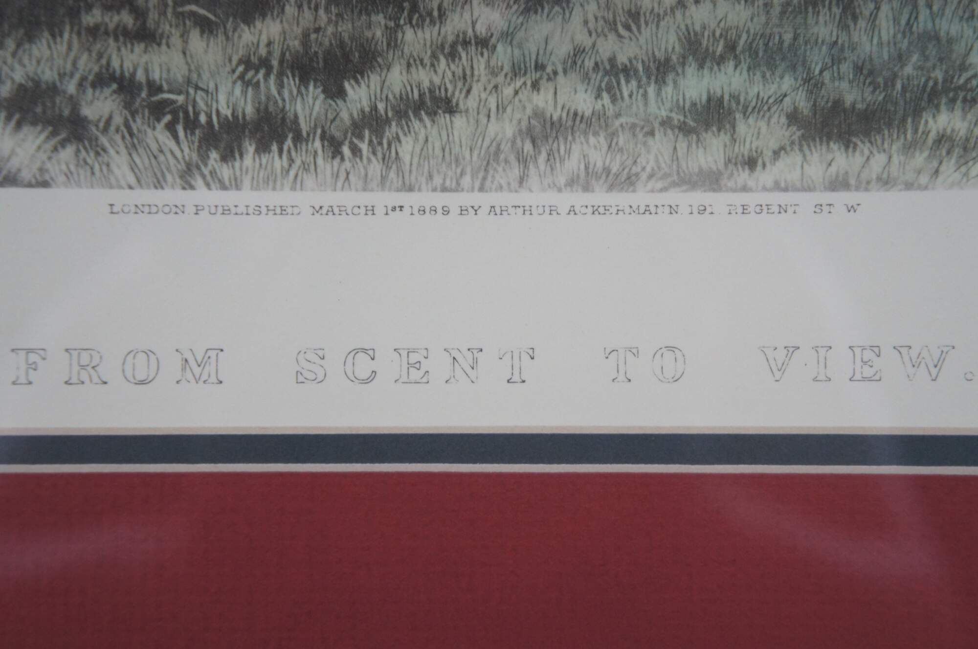Antique colored lithograph print of an English equestrian and fox hunt scene featuring horses hounds galloping through the landscape of fields. Titled “From Scent to View,” from a painting by E.A.S. Douglas and engraved by C.R. Stock, London published March 1st 1889 by Arthur Ackermann, also marked M. Knoedler & Co New York and Stiefbold & Co Berlin.