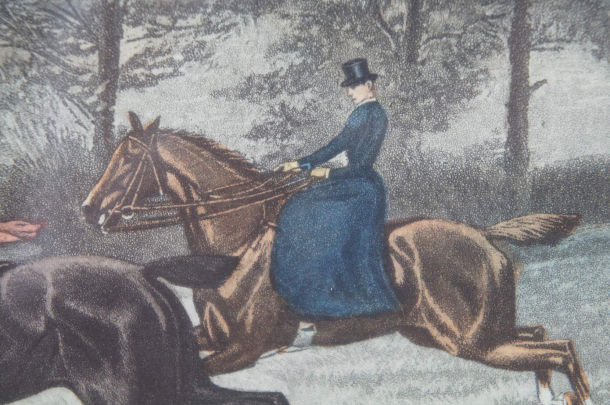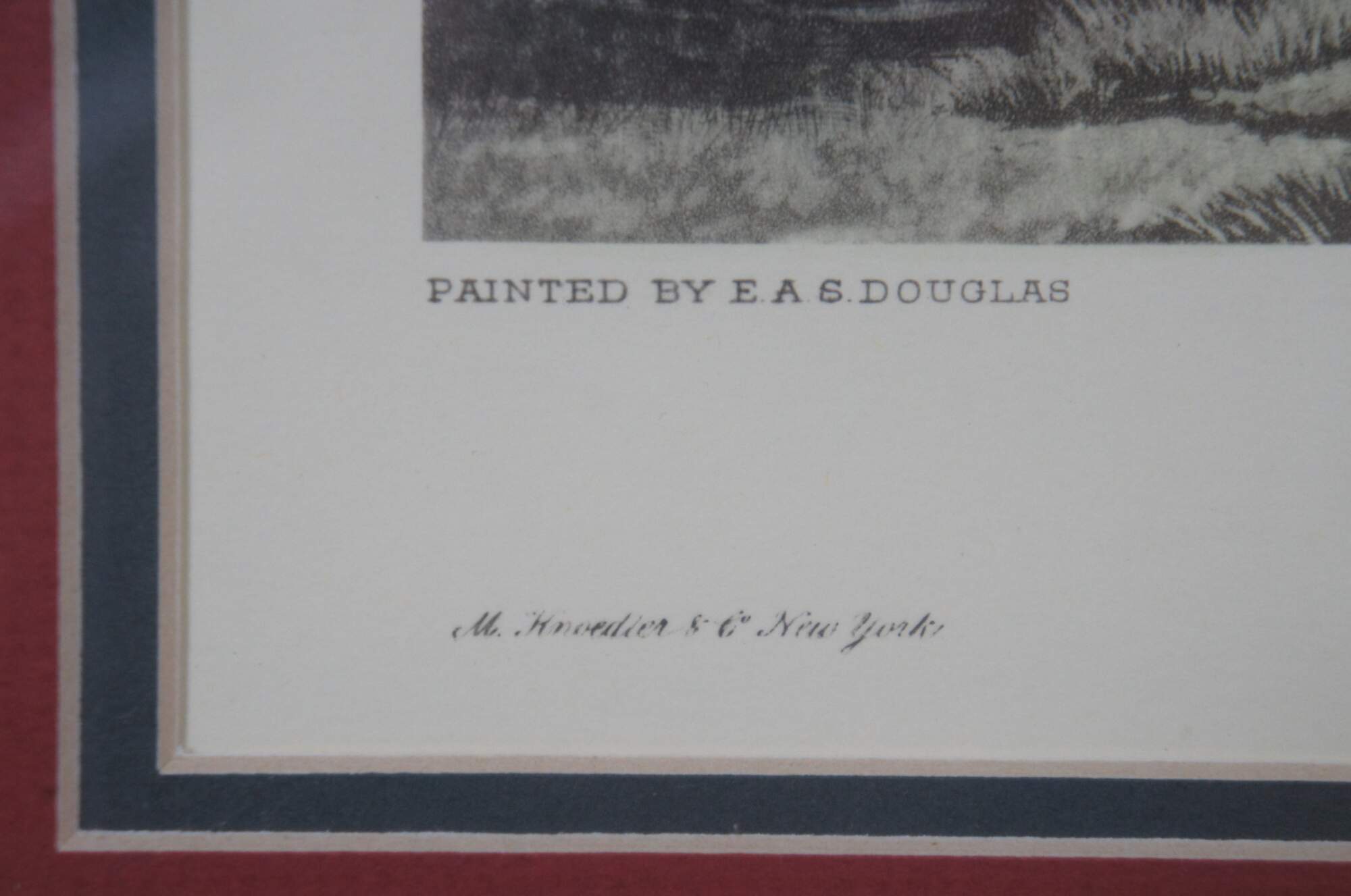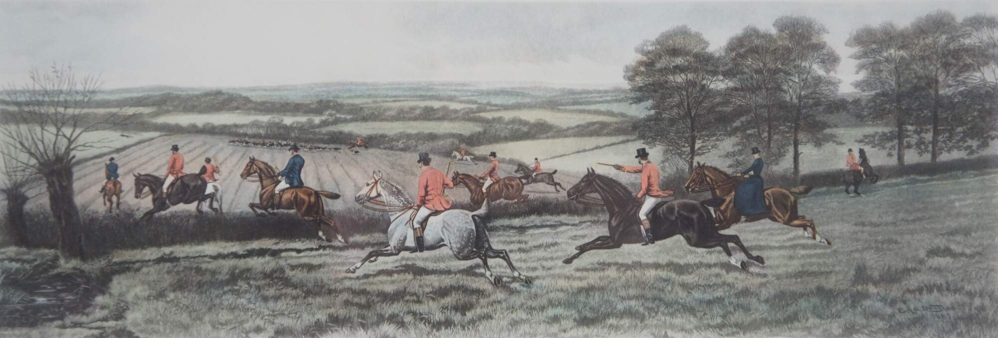 Antique colored lithograph print of an English equestrian and fox hunt scene featuring horses hounds galloping through the landscape of fields. Titled “From Scent to View,” from a painting by E.A.S. Douglas and engraved by C.R. Stock, London published March 1st 1889 by Arthur Ackermann, also marked M. Knoedler & Co New York and Stiefbold & Co Berlin.