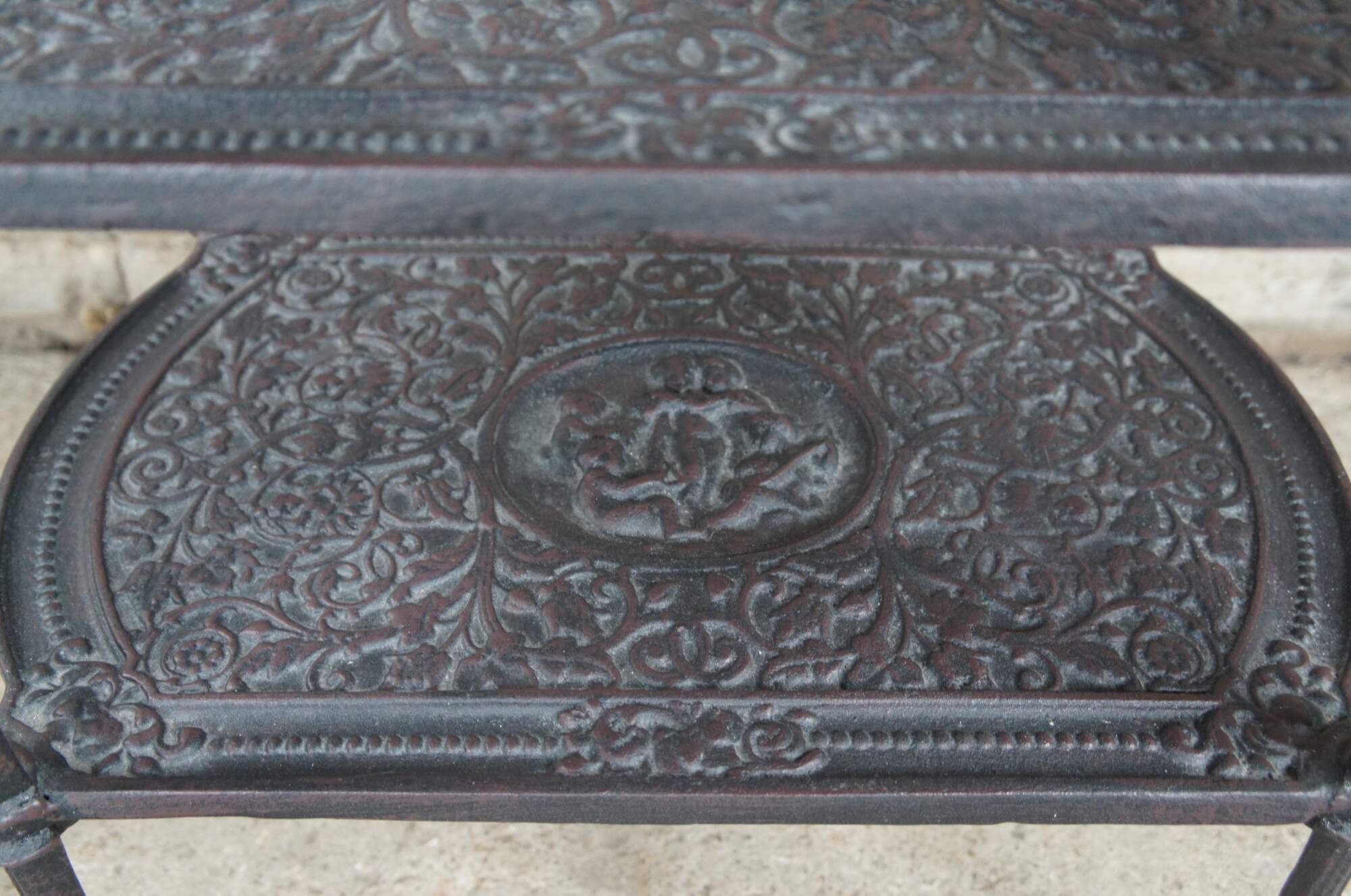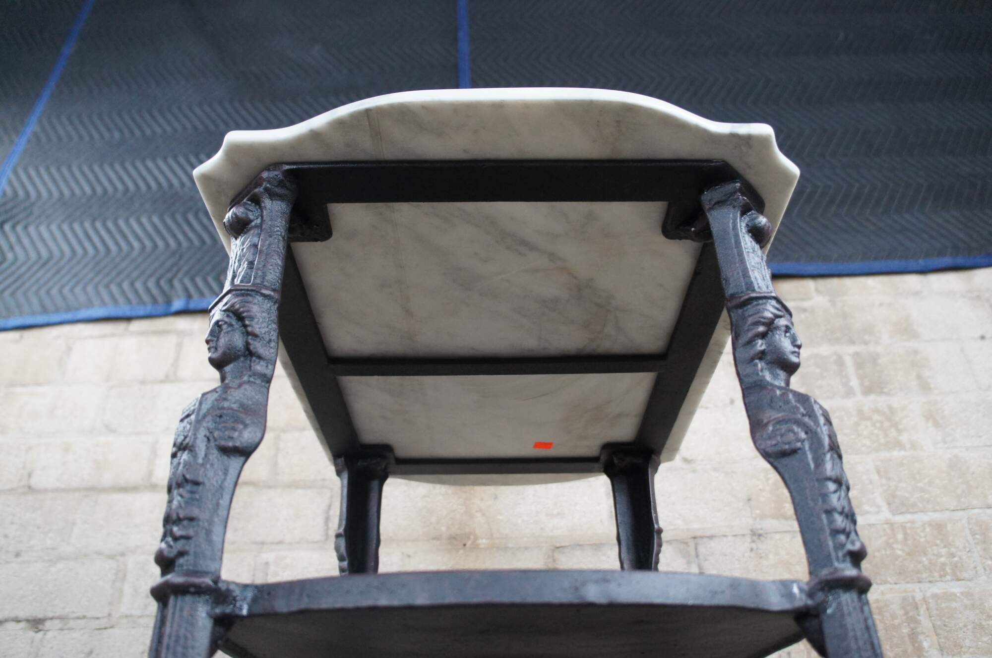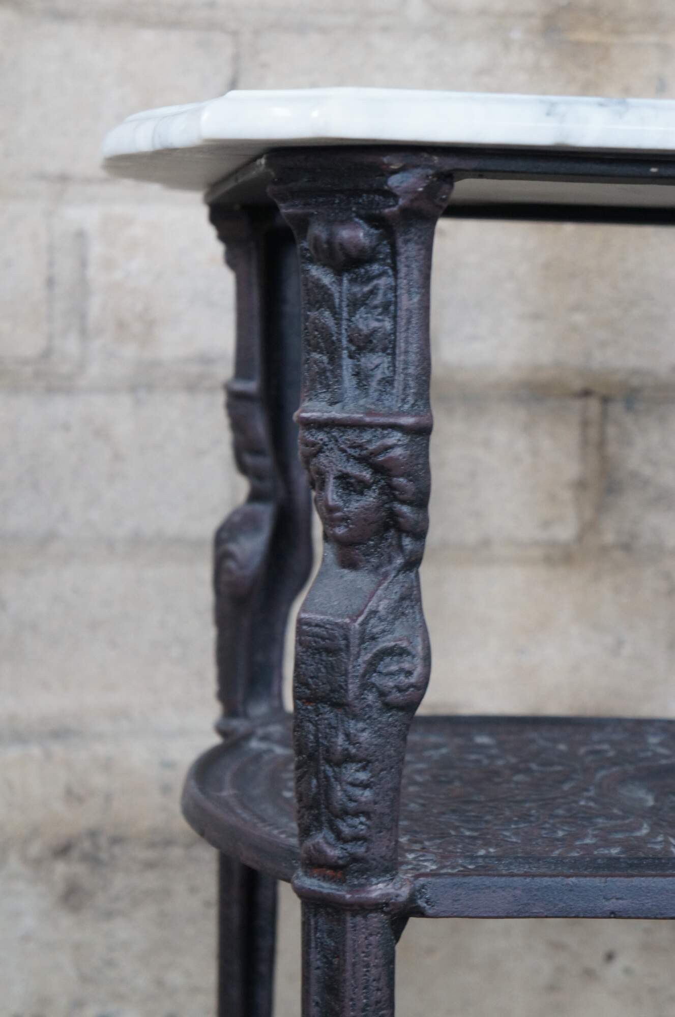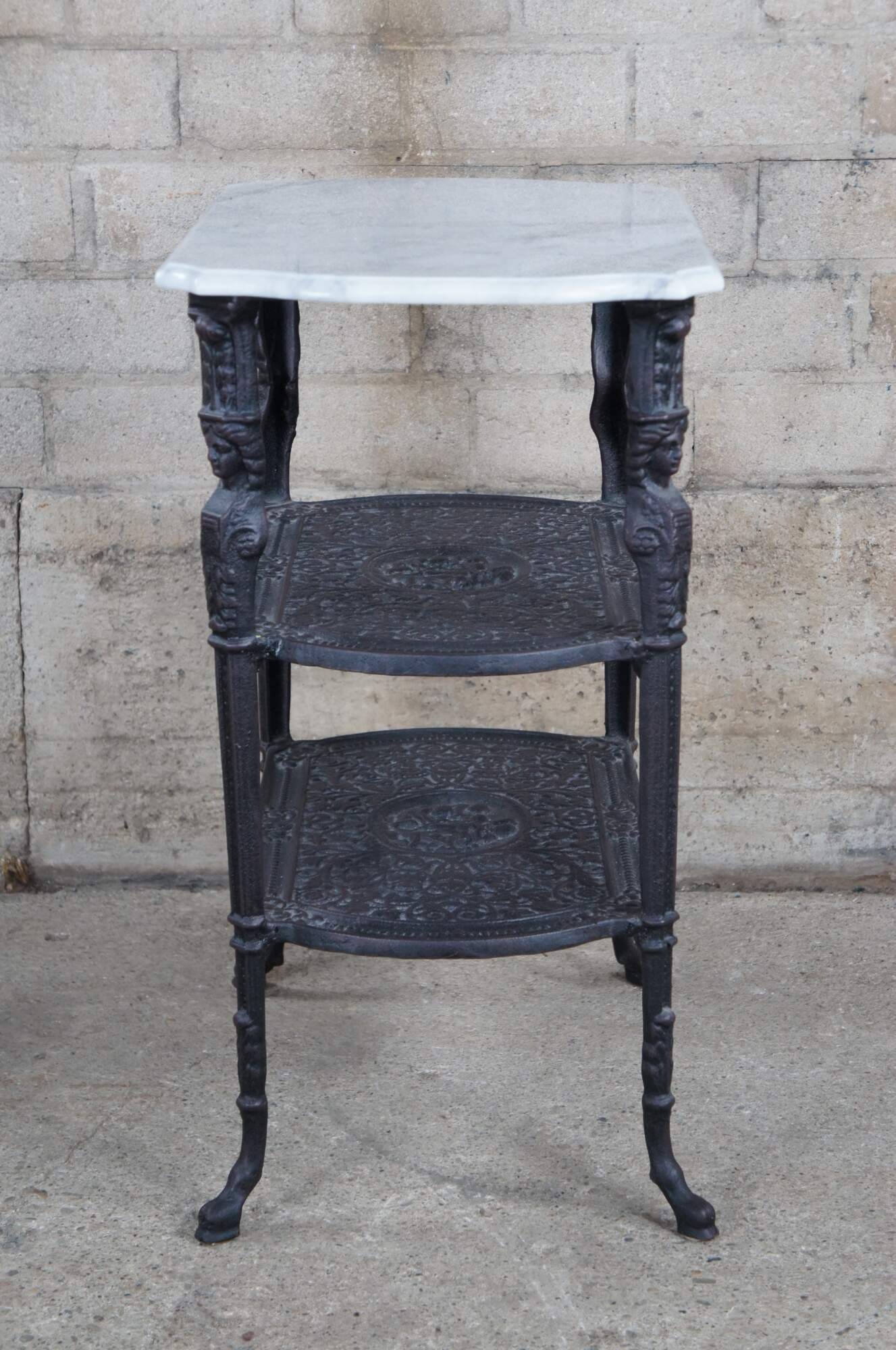 Vintage cast iron and marble top parlor side table or plant stand featuring three tiers with Egyptian Caryatid columns, cameos of cherubs and hooved feat. Very heavy.