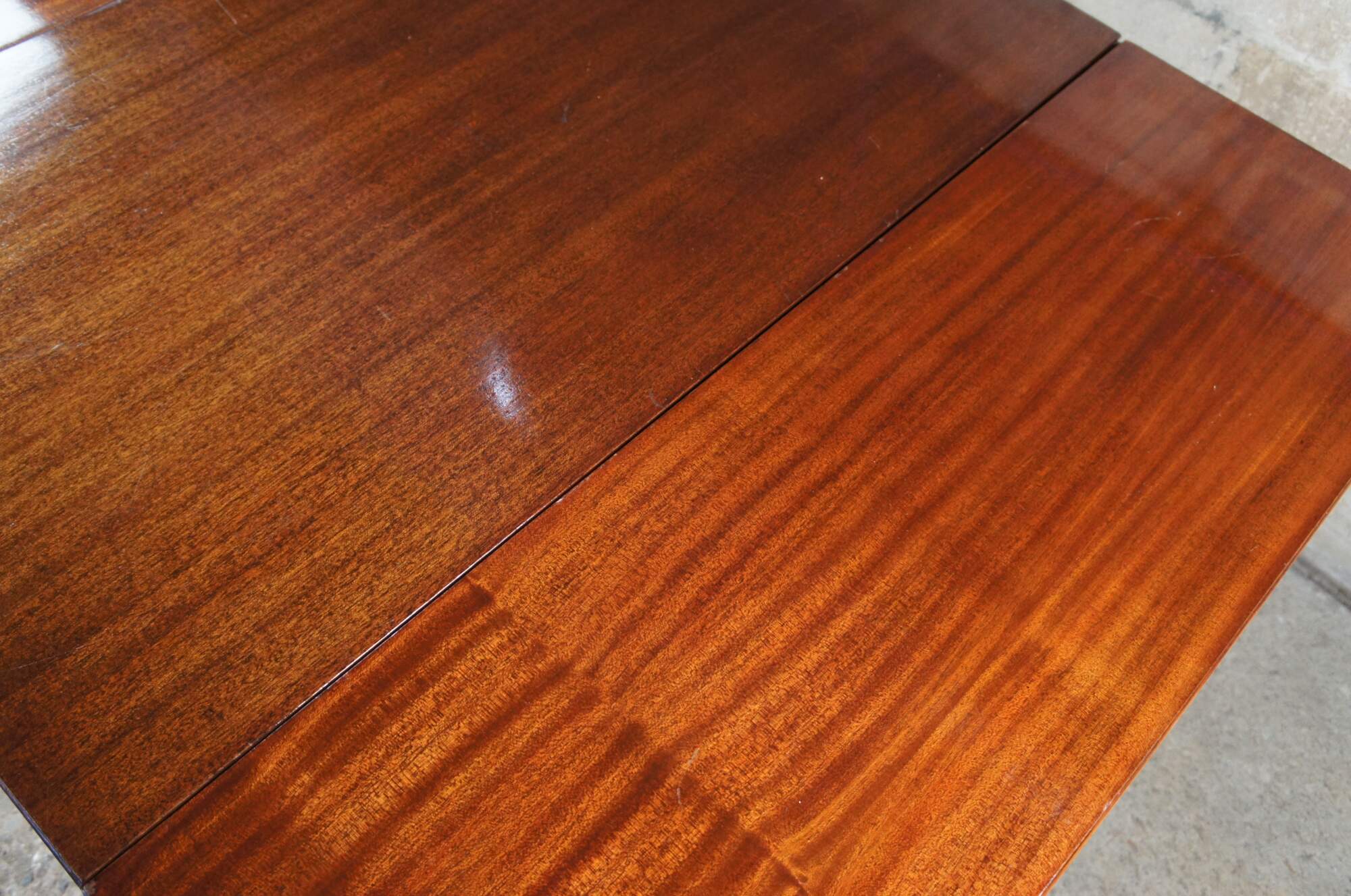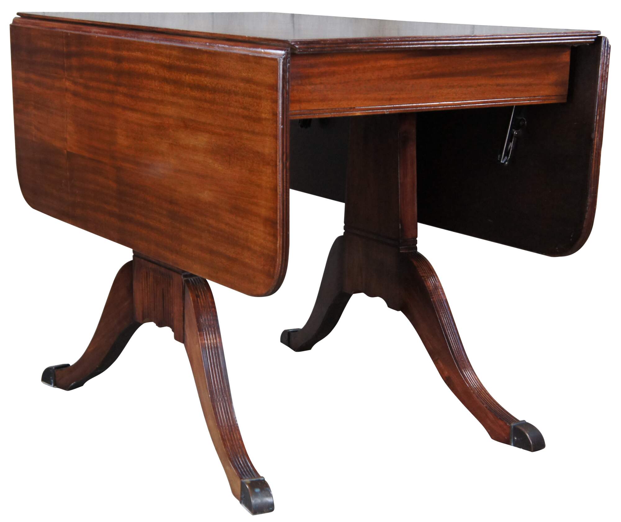 Antique duncan phyfe style drop leaf dining, sofa or console table. Made from mahogany a dual pedestal base featuring fluted curvlinear legs with brass capped feet.