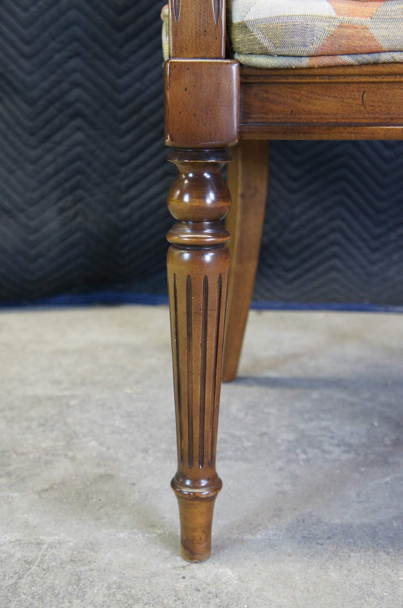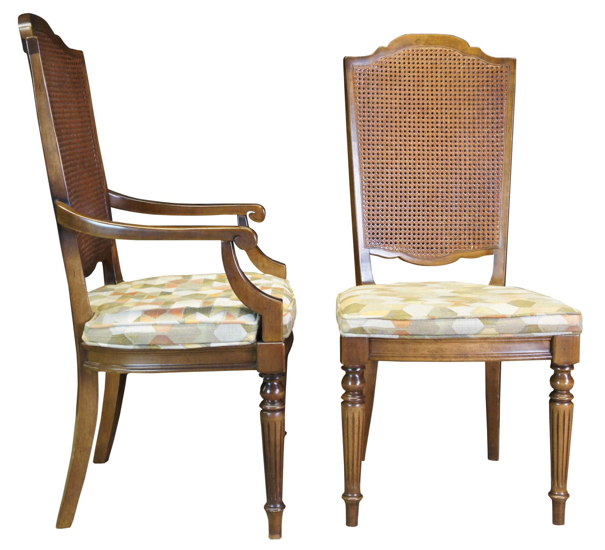 Six Vintage Ethan Allen Classis Manor dining chairs, circa 1970s. Made of solid maple featuring caned back with fluted and tapered accents and geometric / hexagon upholstery. Includes two arms and four sides. 15-6012. A rich blend of French Country and Louis XVI styling.