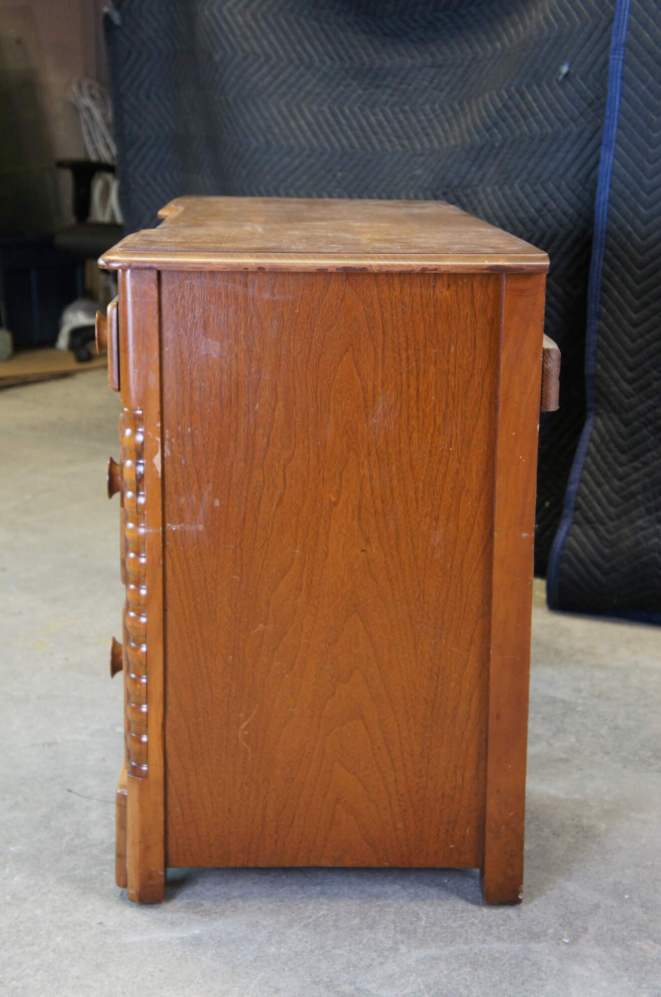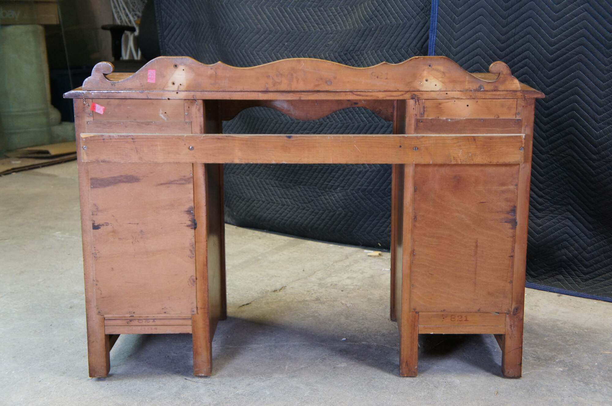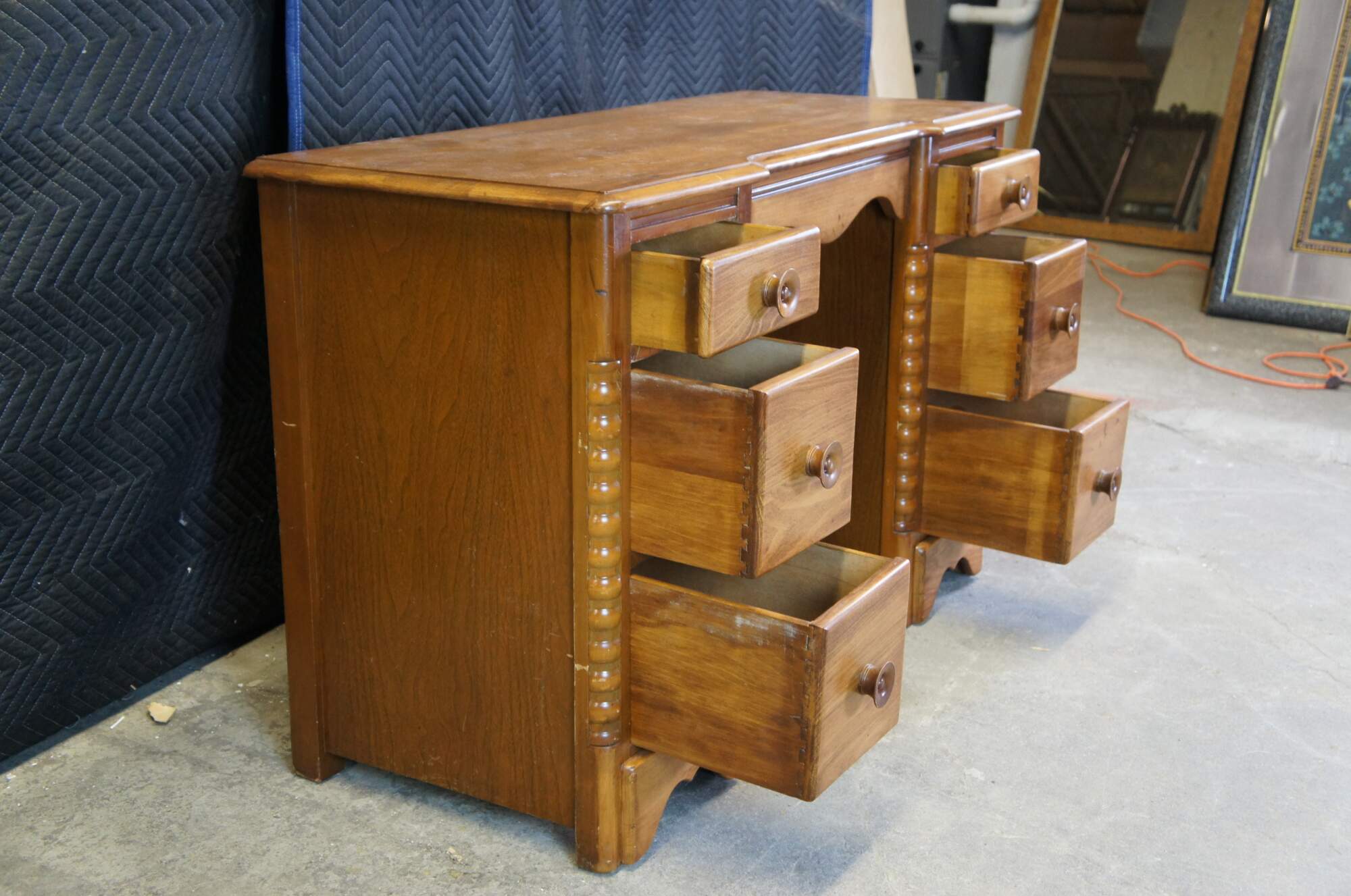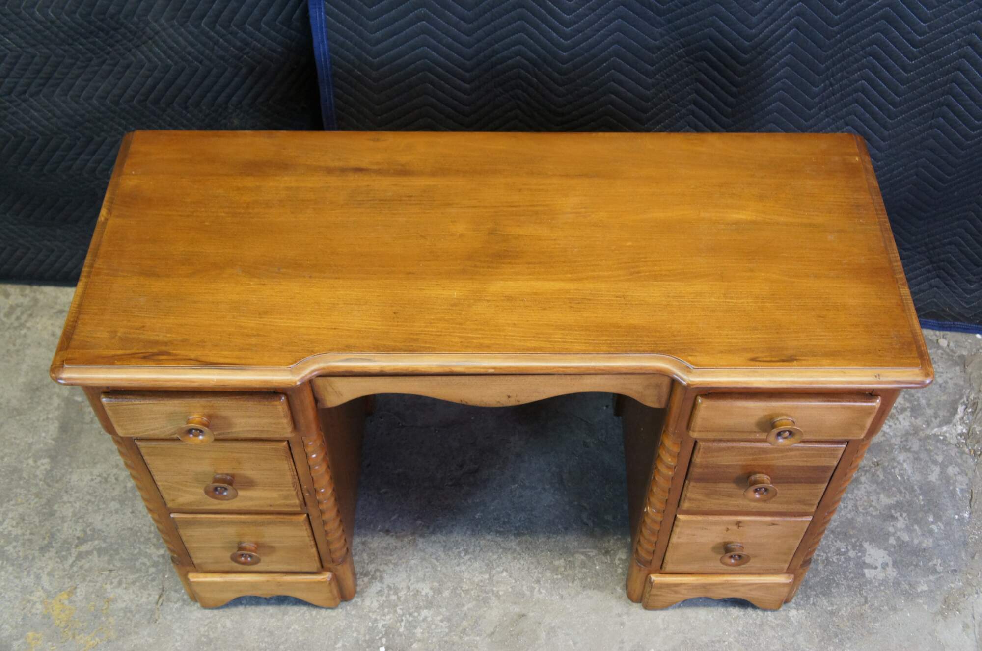 Early American style kneehole desk or vanity, circa 1960s. Made of oak featuring turned and ribbed accents with scrolled backsplash and six drawers.