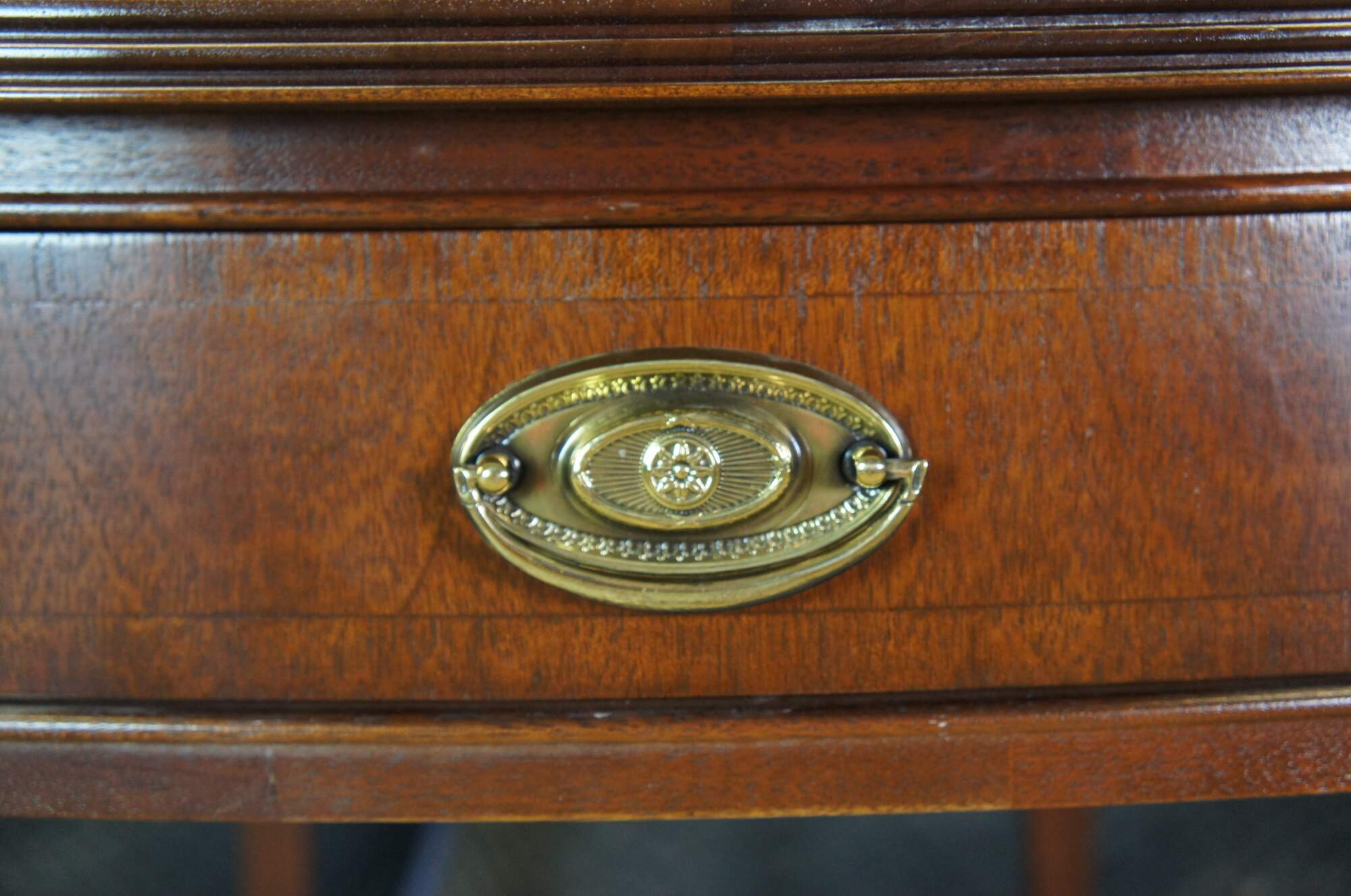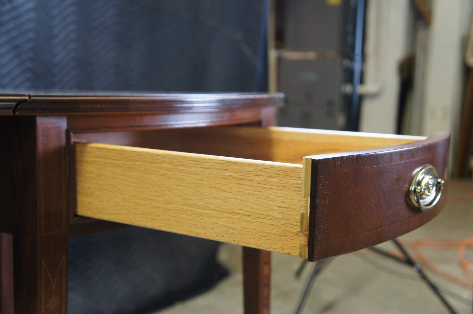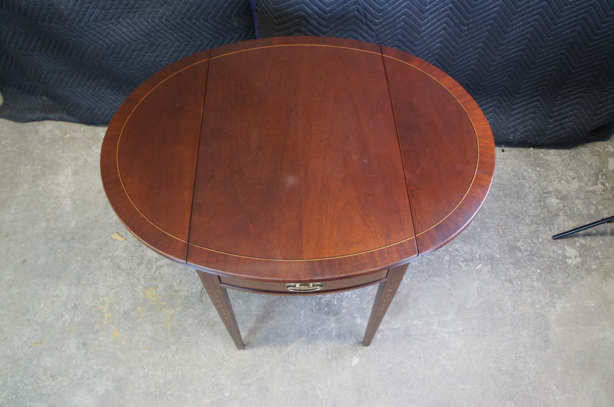 Pair of American Made Ethan Allen 18th Century Pembroke Side Tables, 22-8504. Made from mahogany with drop leaves that open to create an ovular surface. Features banding over square tapered legs, inlay, dovetailed drawers and brass hardware. Inspired by Sheraton and Federal styling.