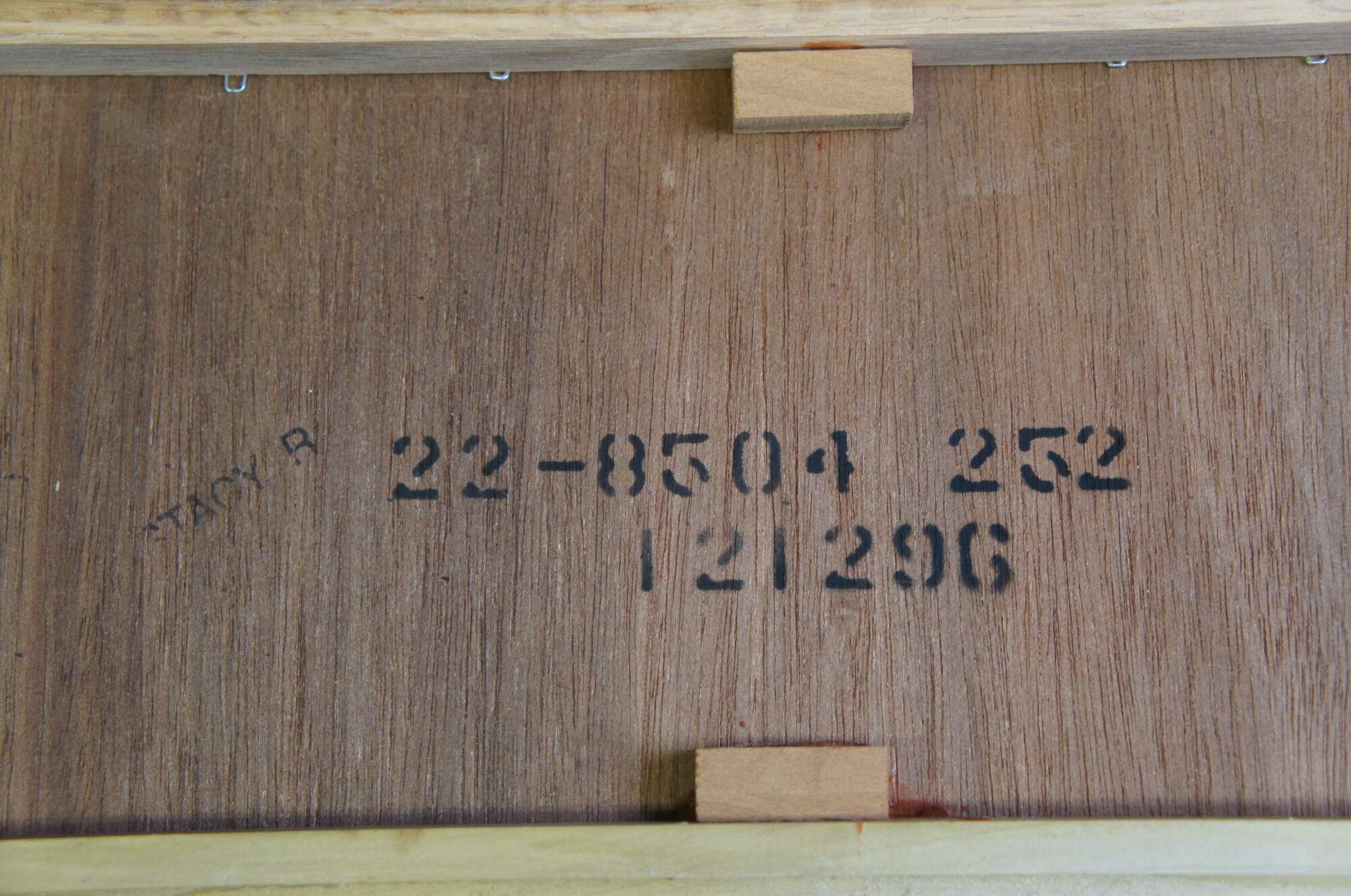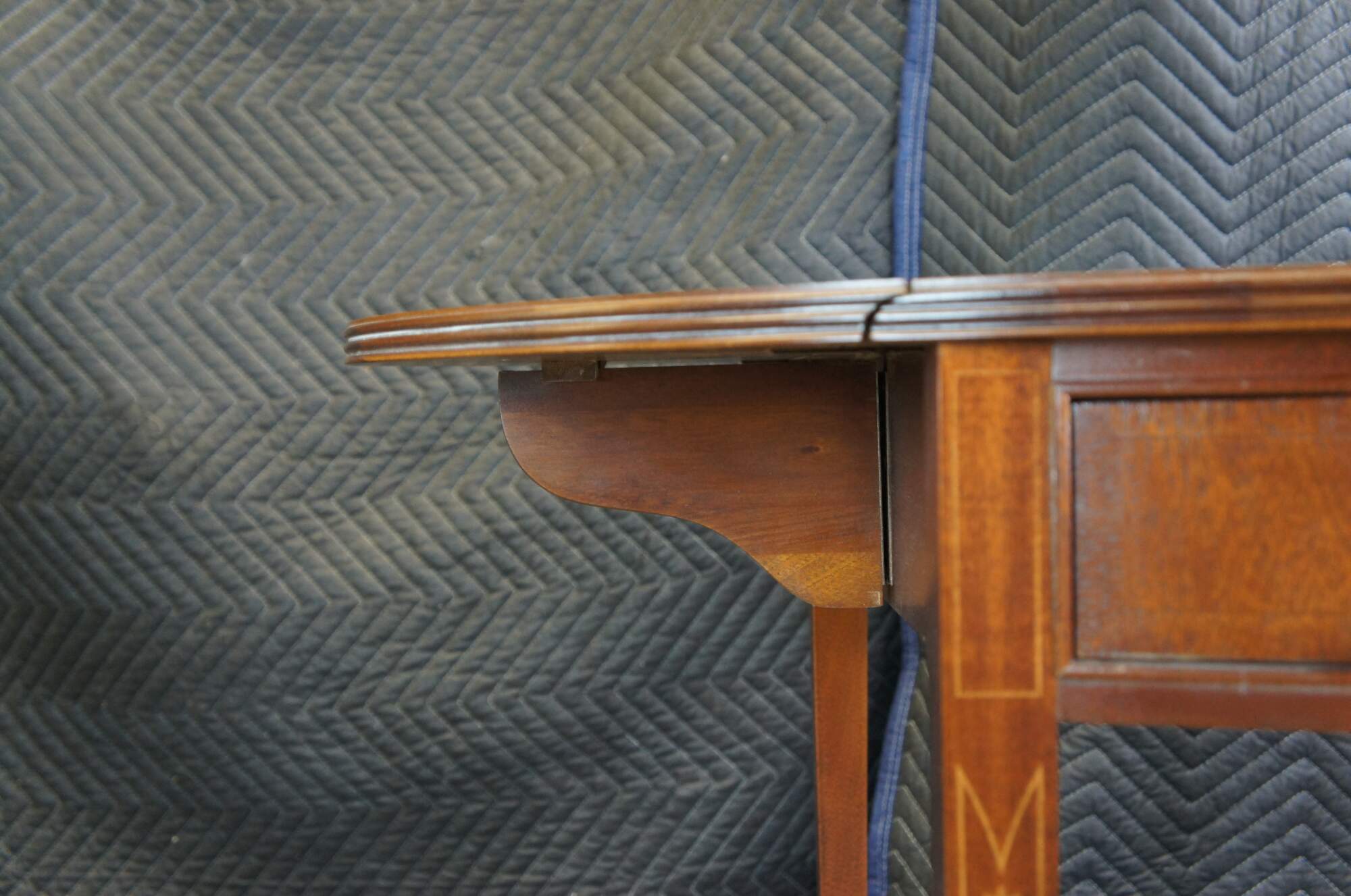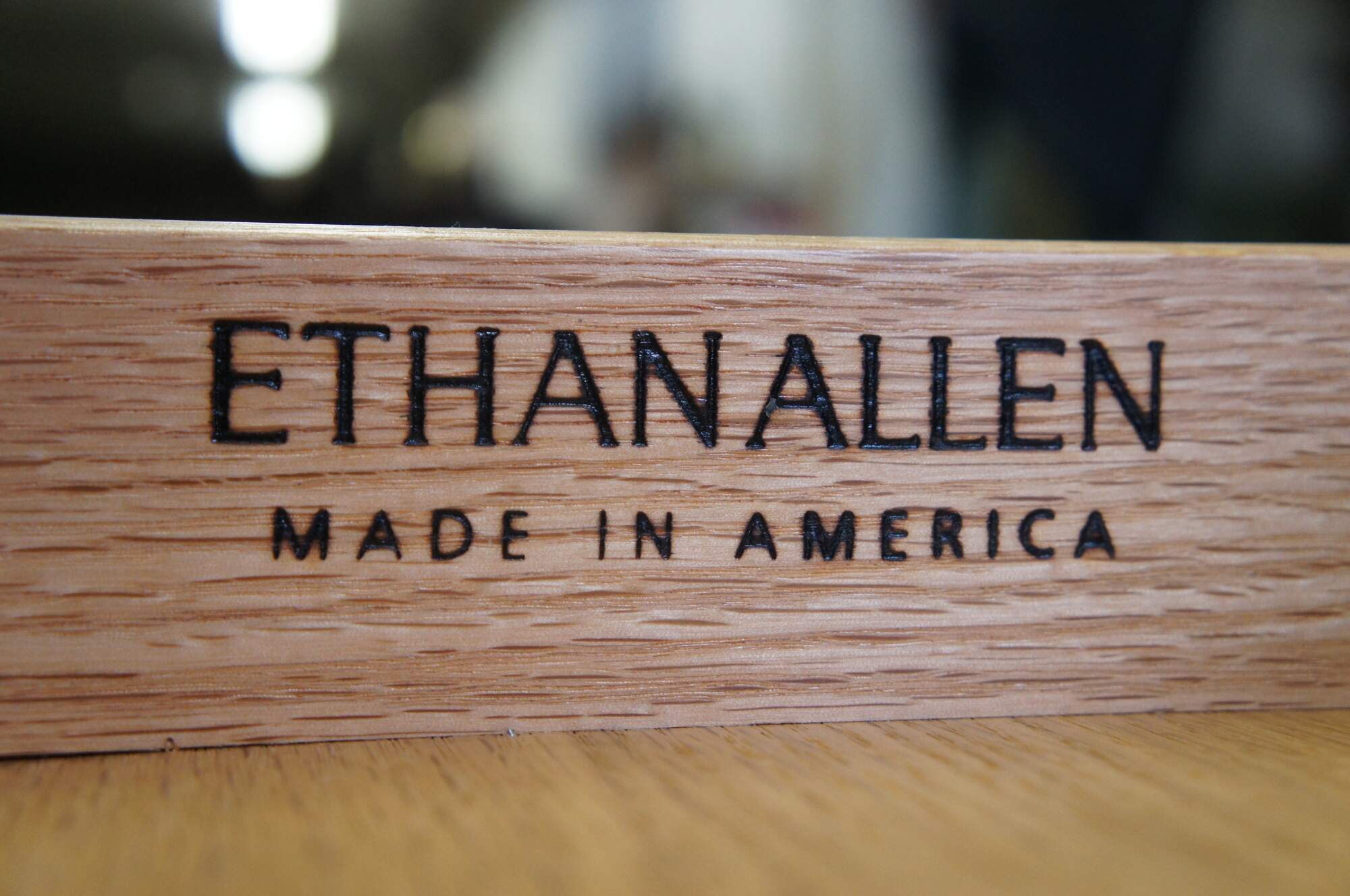 Pair of American Made Ethan Allen 18th Century Pembroke Side Tables, 22-8504. Made from mahogany with drop leaves that open to create an ovular surface. Features banding over square tapered legs, inlay, dovetailed drawers and brass hardware. Inspired by Sheraton and Federal styling.
