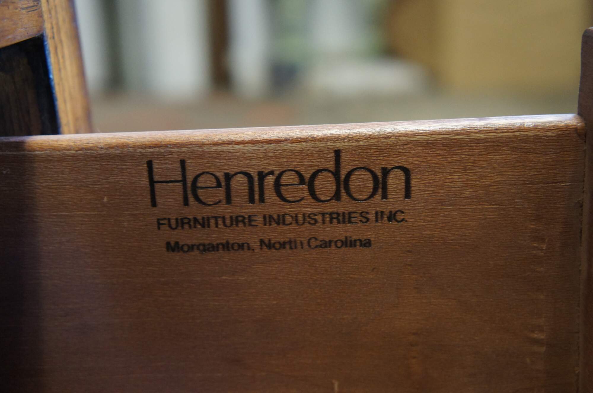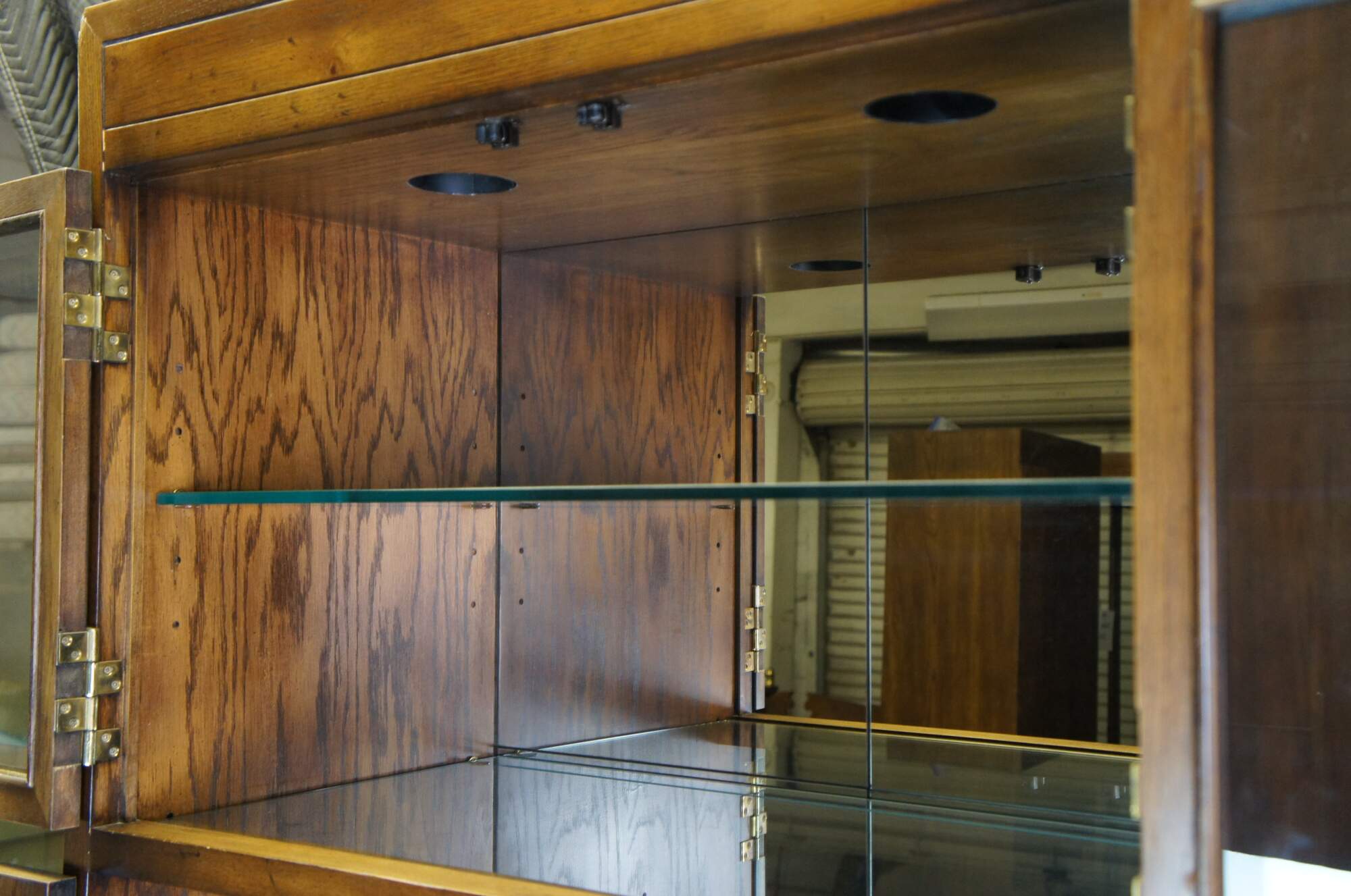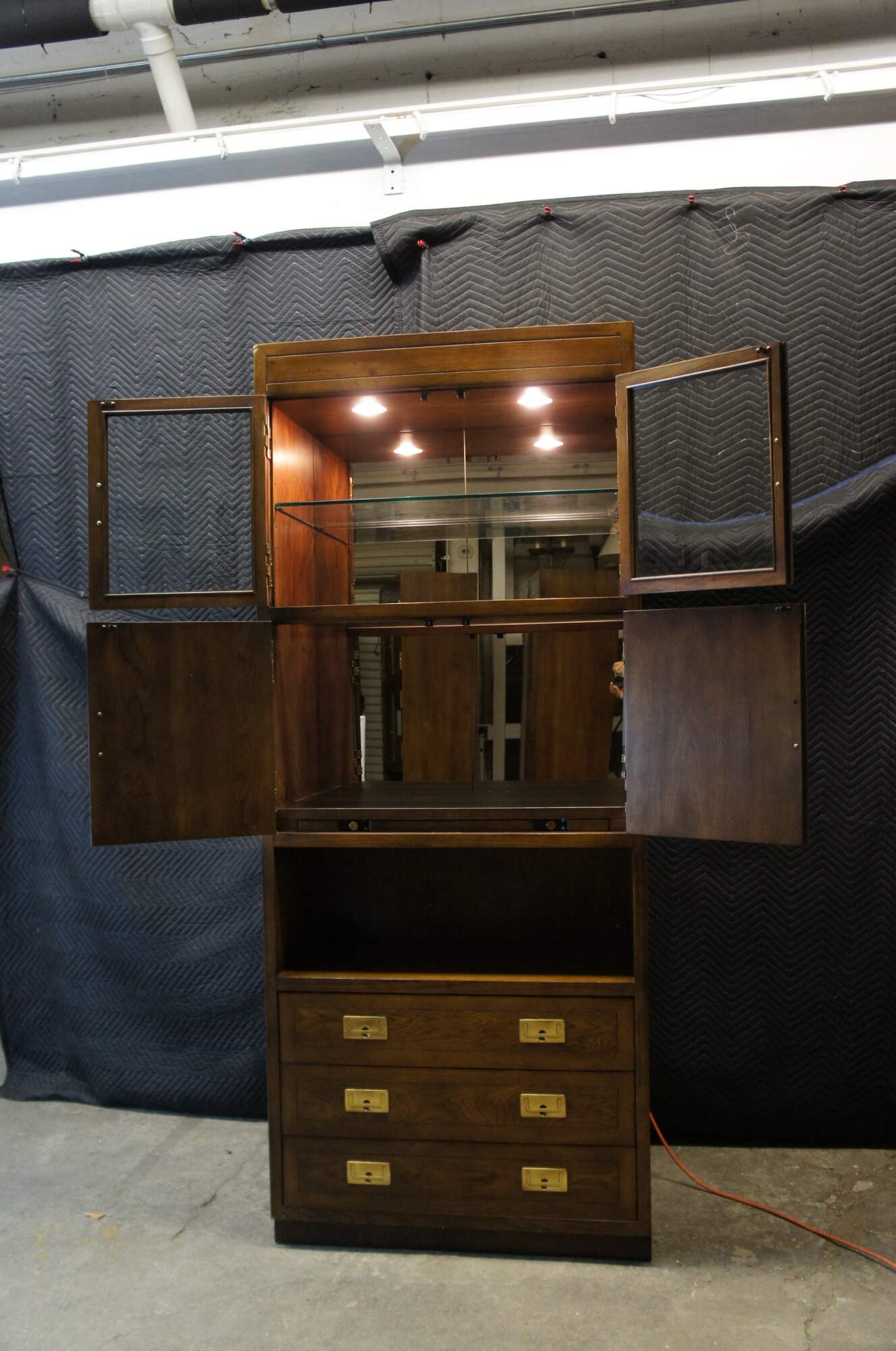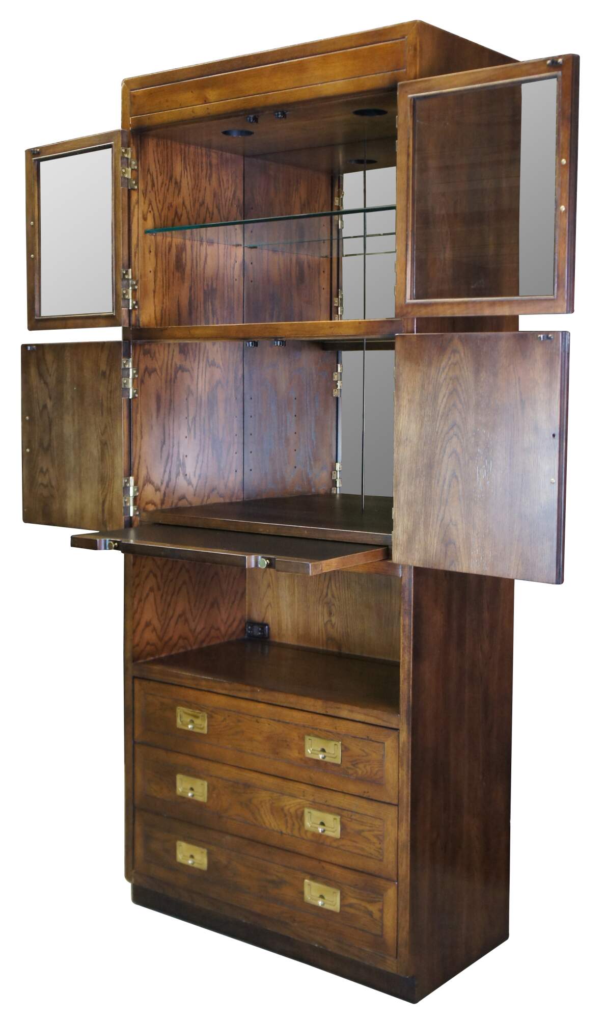 Vintage Henredon campaign style cabinet. Made of oak featuring upper curio cabinet, central bar entertainment area with pull out tray and bookcase, and three lower storage drawers. All accented with modern brass hardware. Illuminated. Circa 1980s.