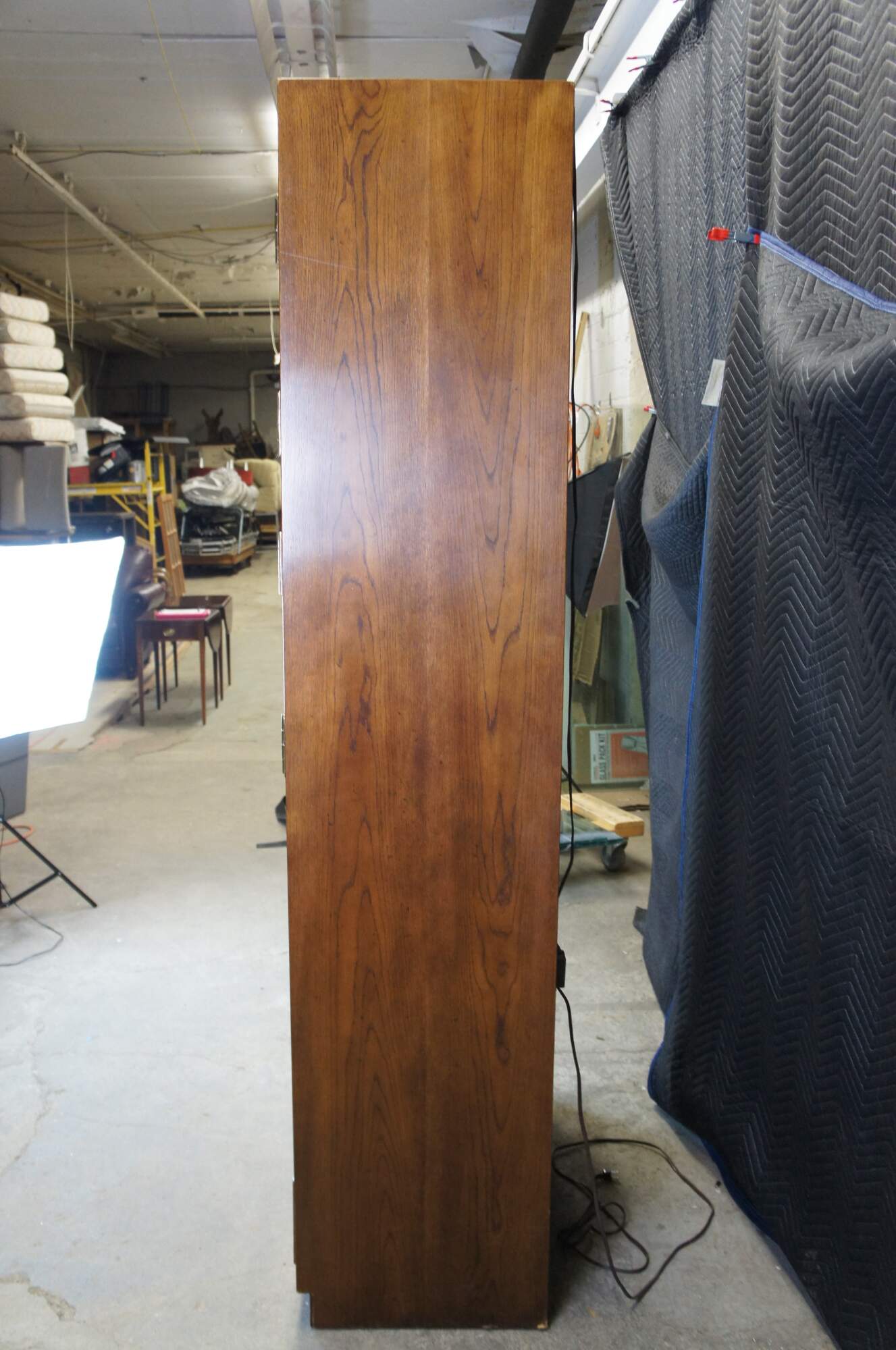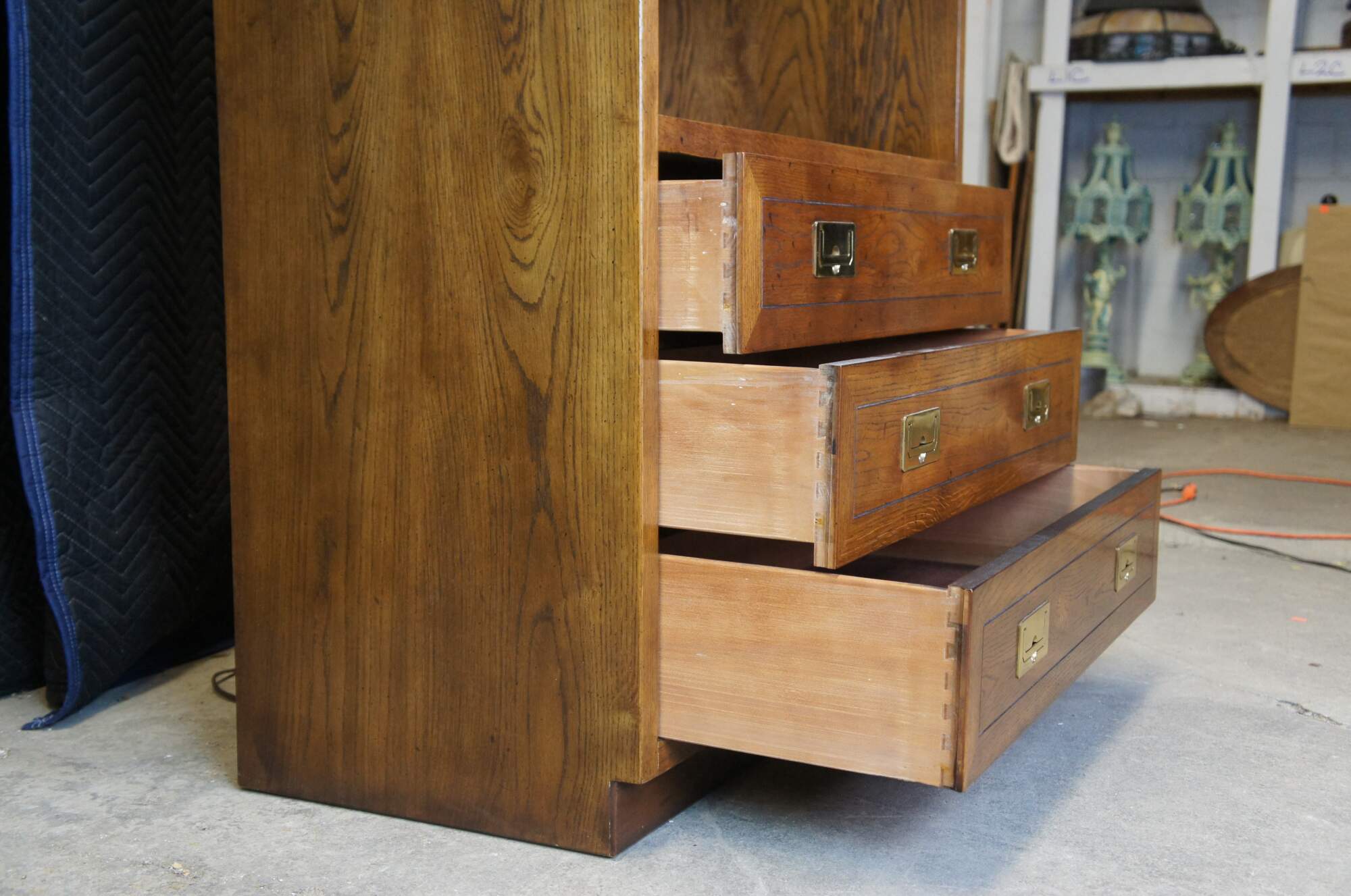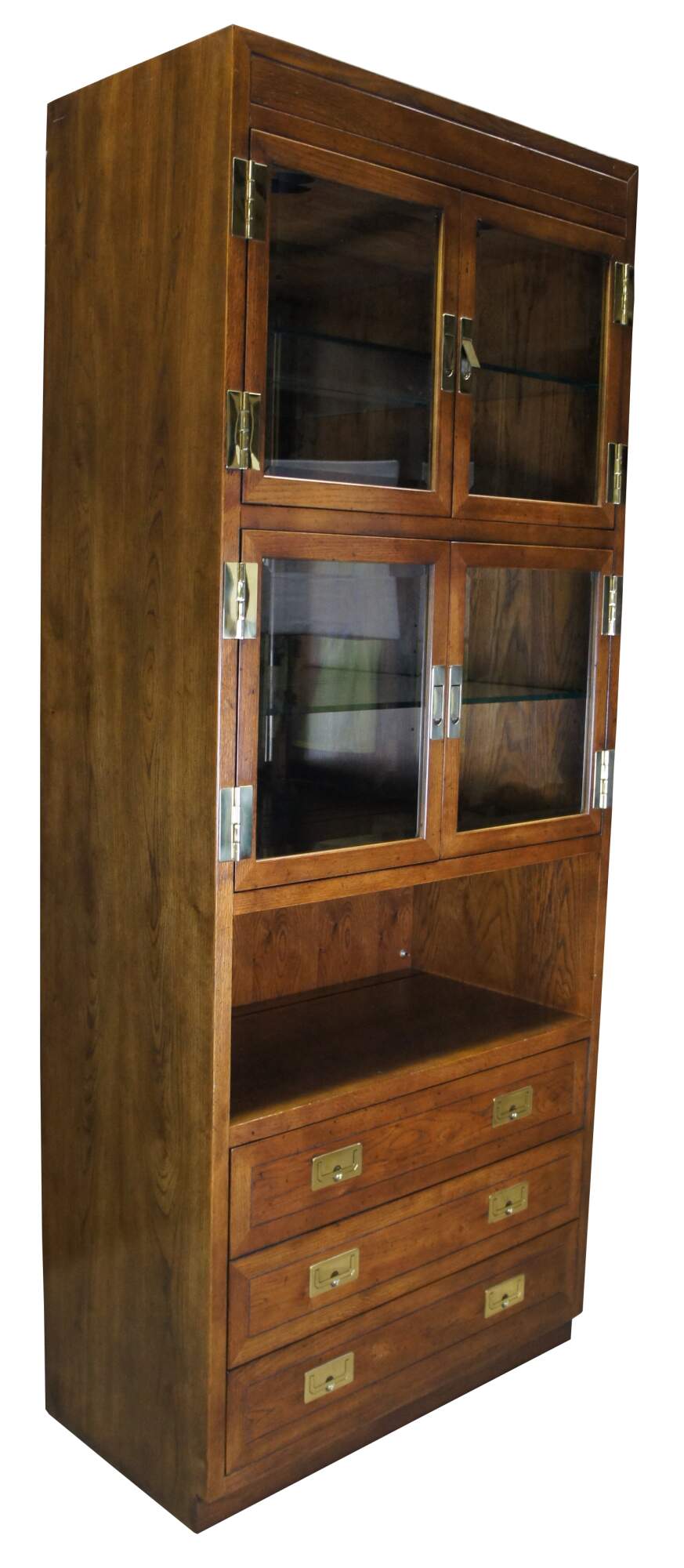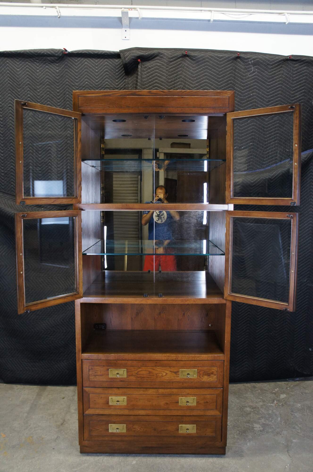 Vintage Henredon scene I campaign style curio cabinet. Made of oak featuring double upper curio cabinets with beveled glass over central bookcase cubby and three lower storage drawers. All accented with modern brass hardware. Illuminated. Circa 1980s. 1316. 0102-60. 180617.