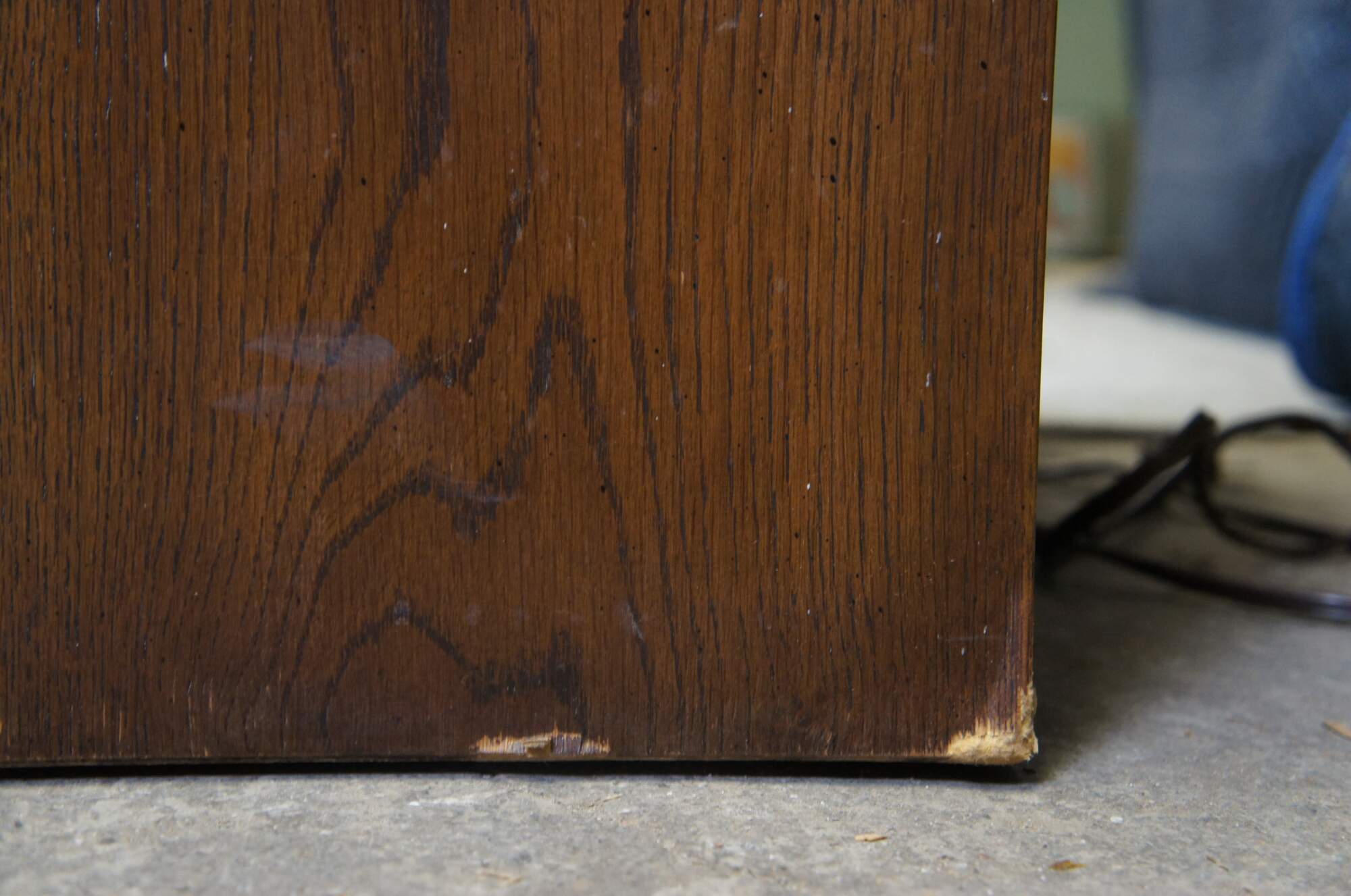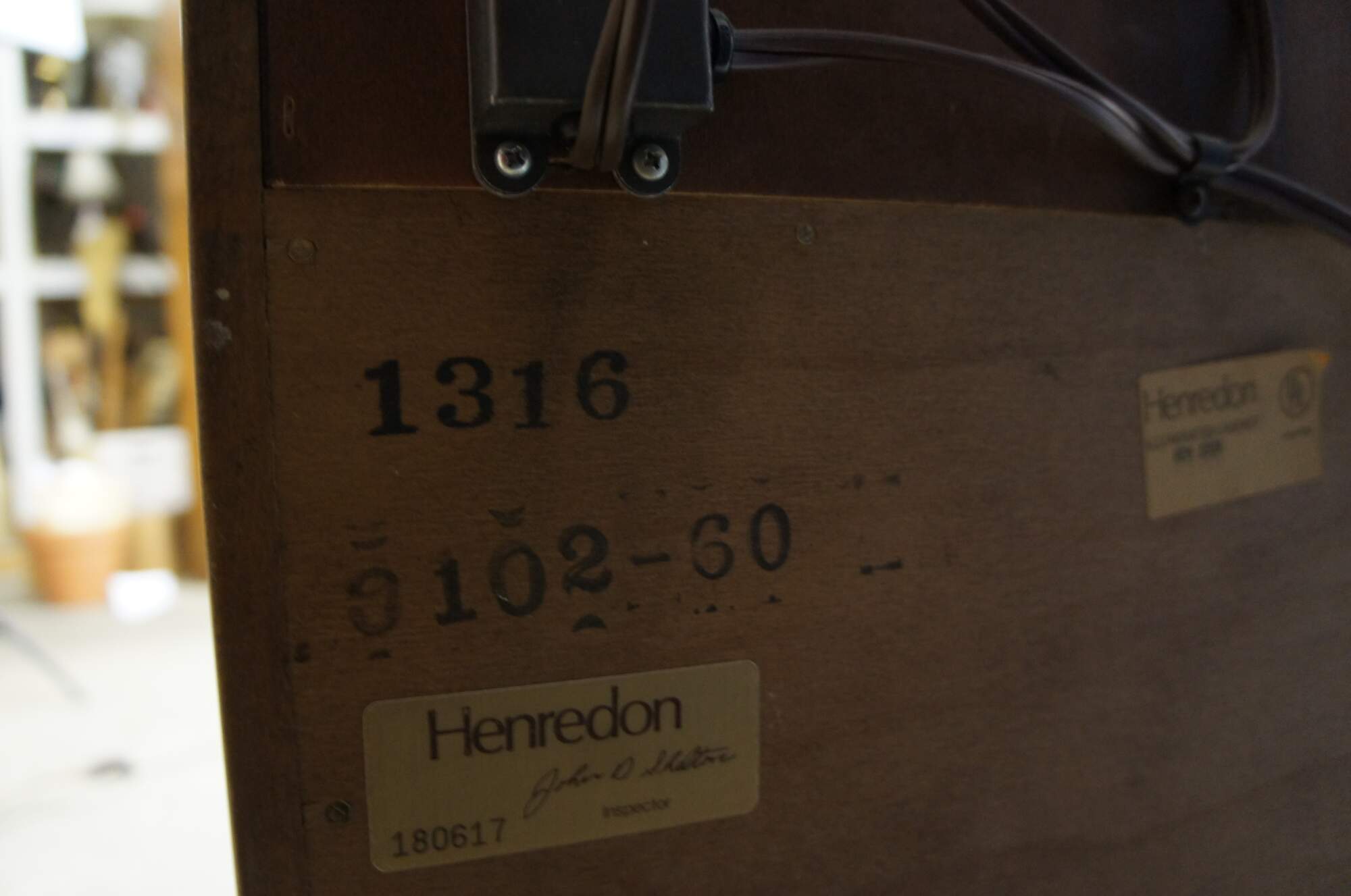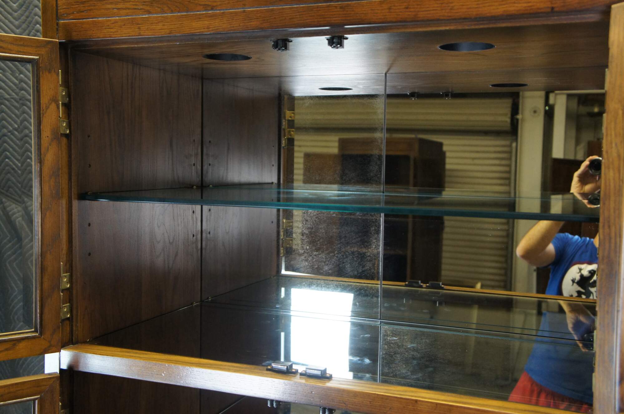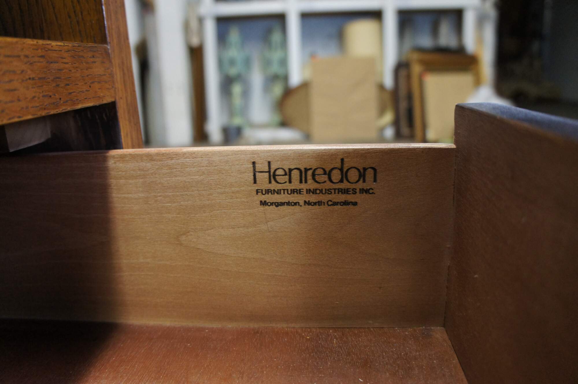 Vintage Henredon scene I campaign style curio cabinet. Made of oak featuring double upper curio cabinets with beveled glass over central bookcase cubby and three lower storage drawers. All accented with modern brass hardware. Illuminated. Circa 1980s. 1316. 0102-60. 180617.