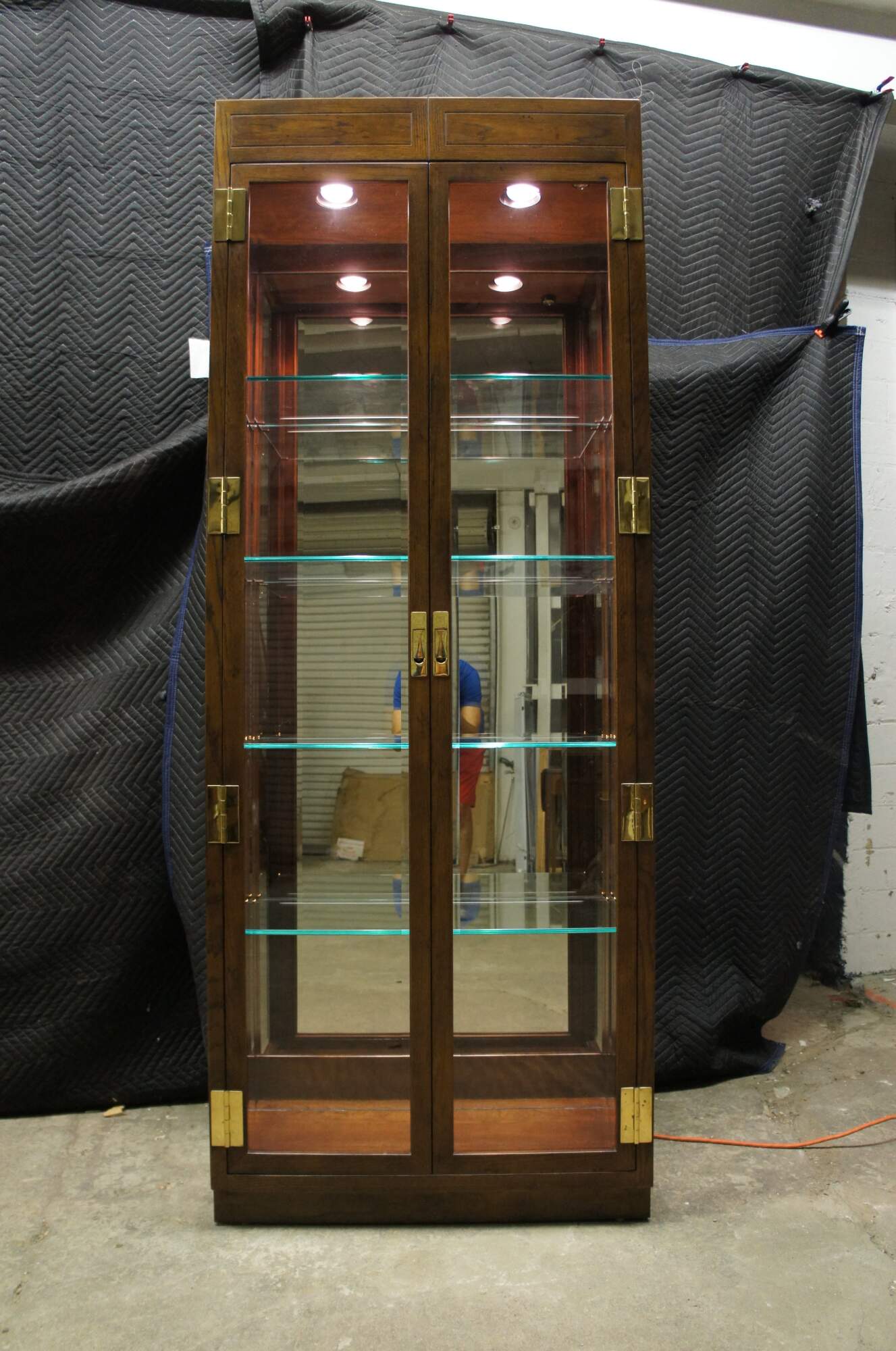 Mid century Henredon Scene One display illuminated cabinet or vitrine. Made of oak featuring campaign styling with beveled glass sides / doors, brass hardware, and adjustable shelving with plate grooves.