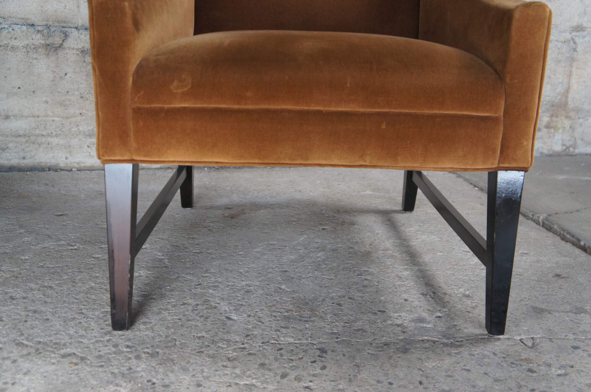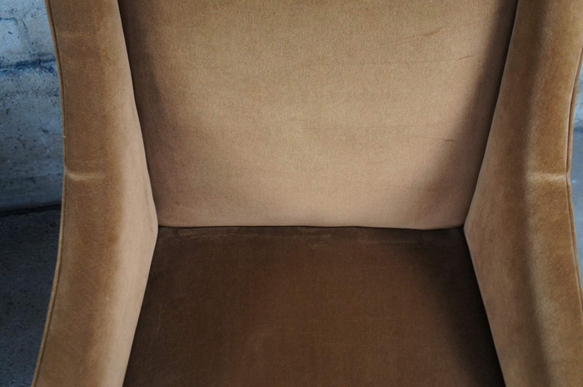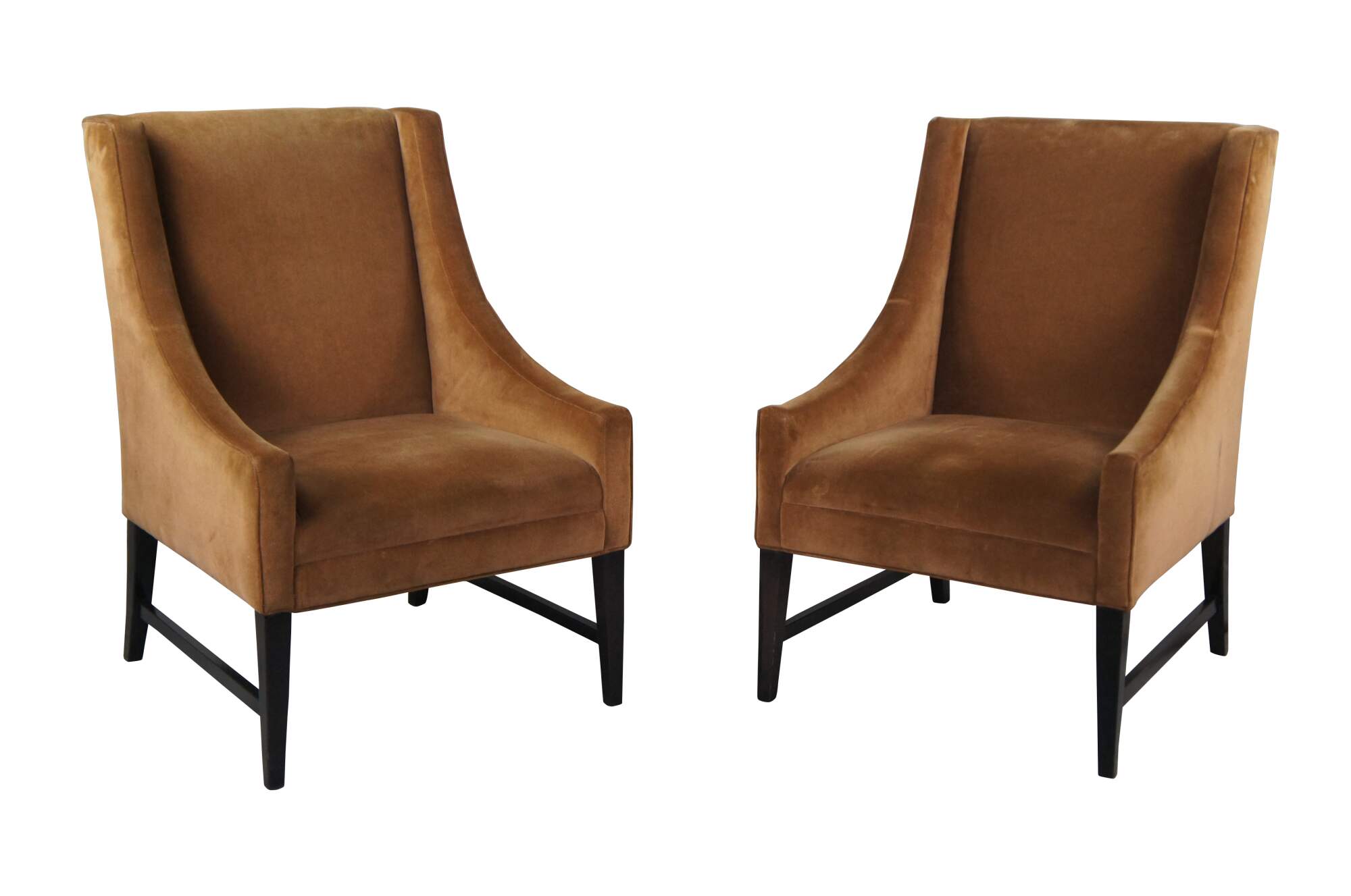 Pair of vintage brown velvet wingback style club chairs, featuring swooped arms over square tapered wooden legs.