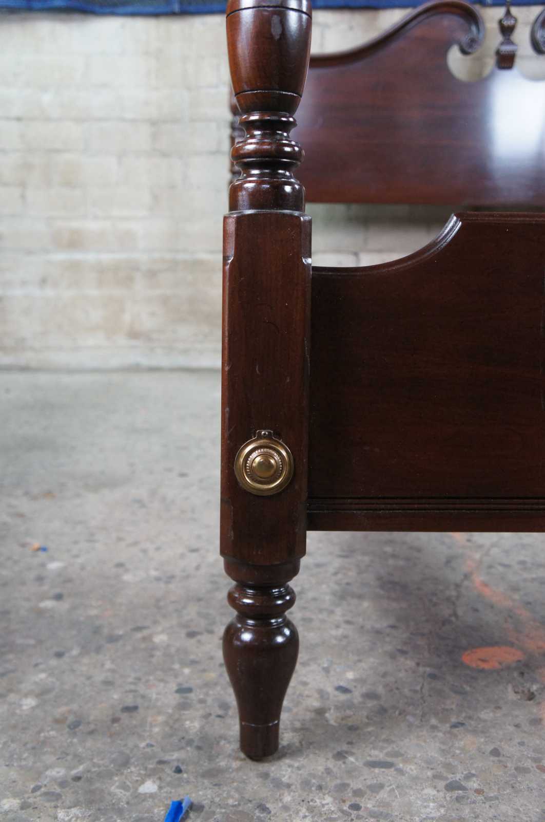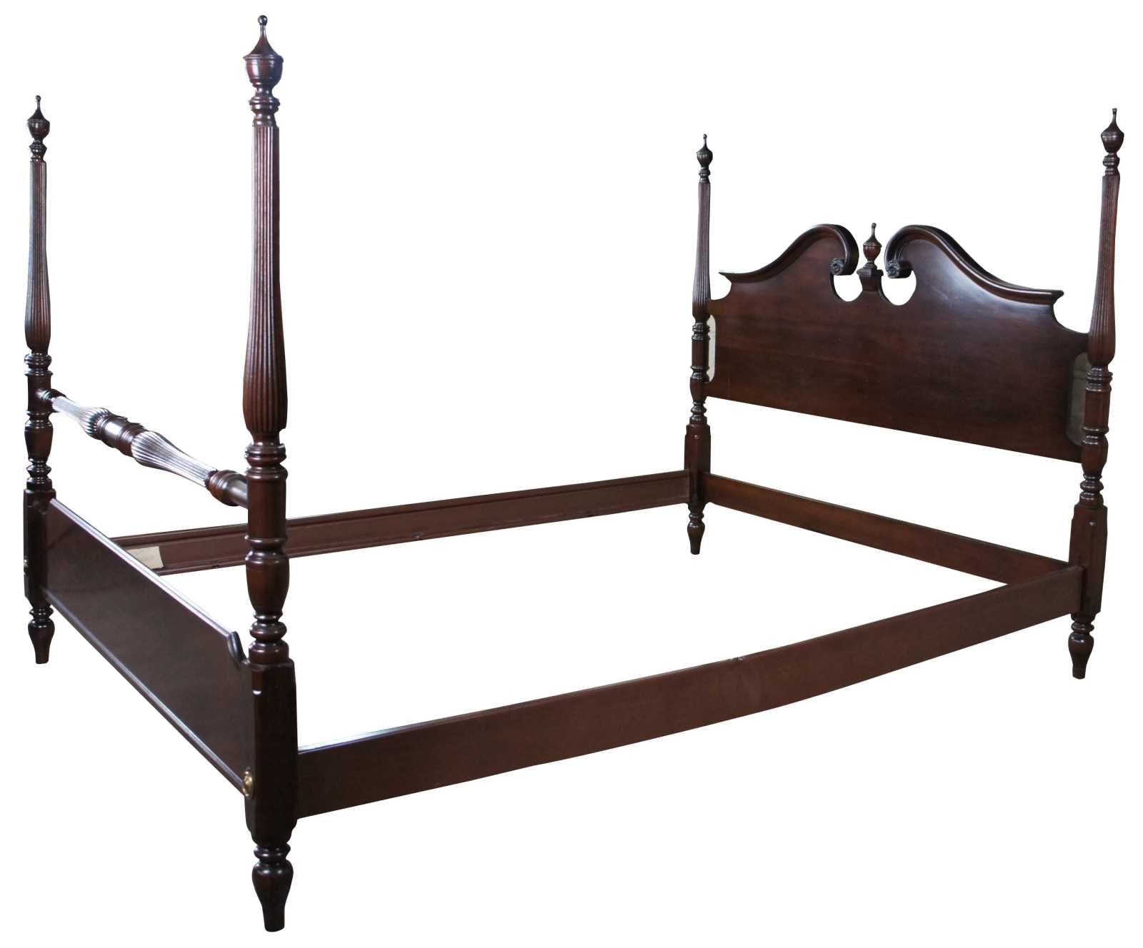 Vintage 1988 Ethan Allen Georgian Court pediment poster bed. Made of dark cherry featuring serpentine form with open pediment, finials, fluting and floral medallions. 11-5654. 225.