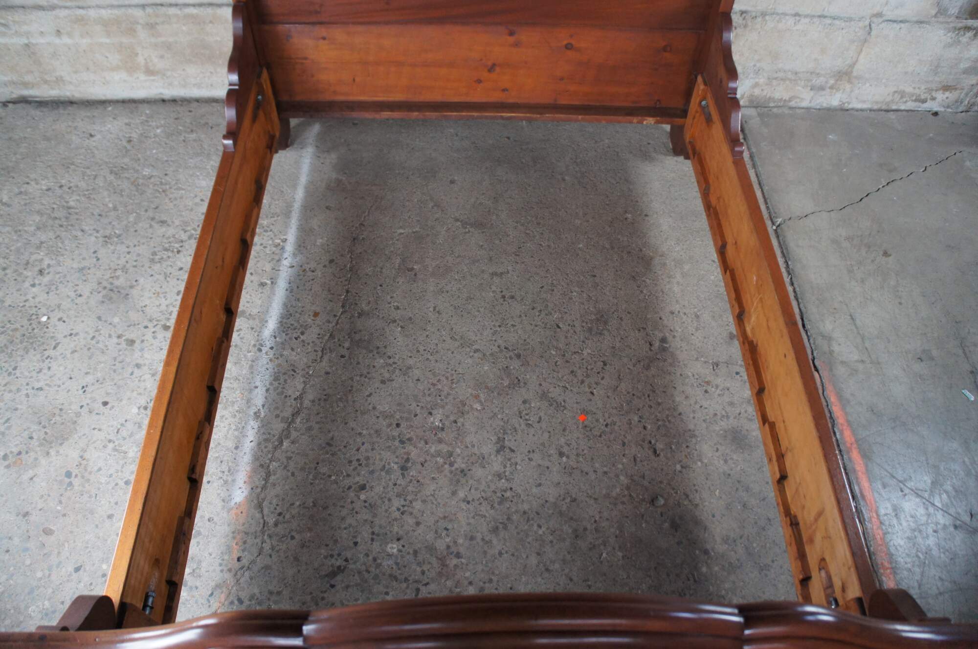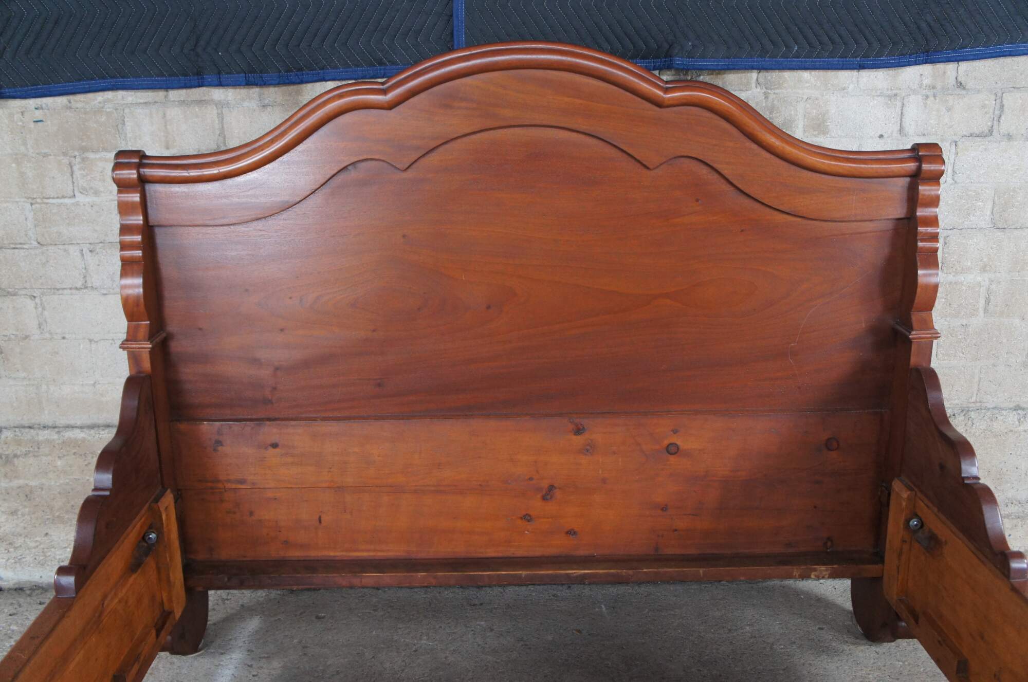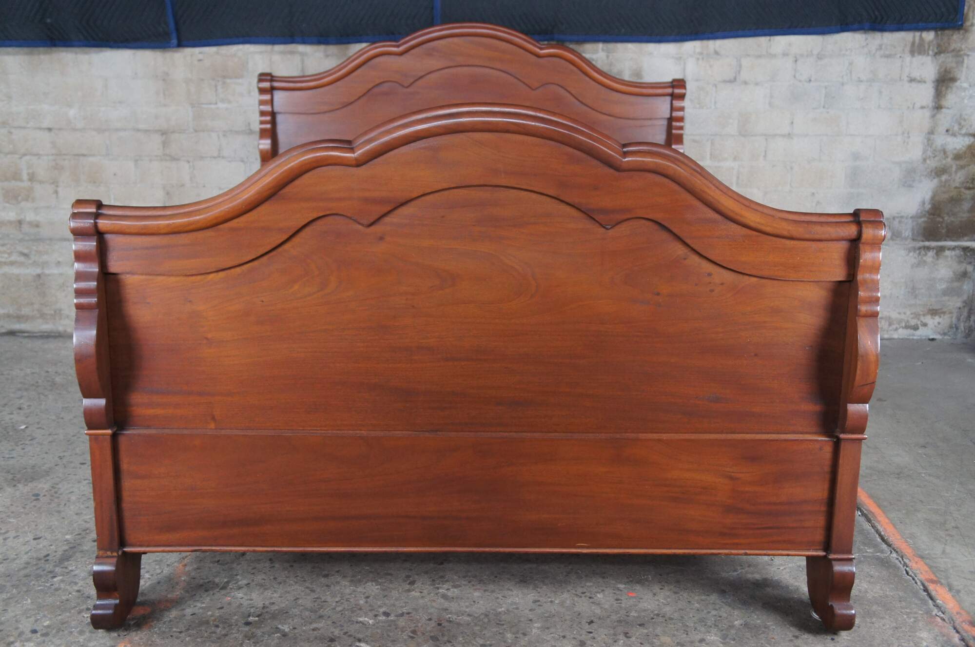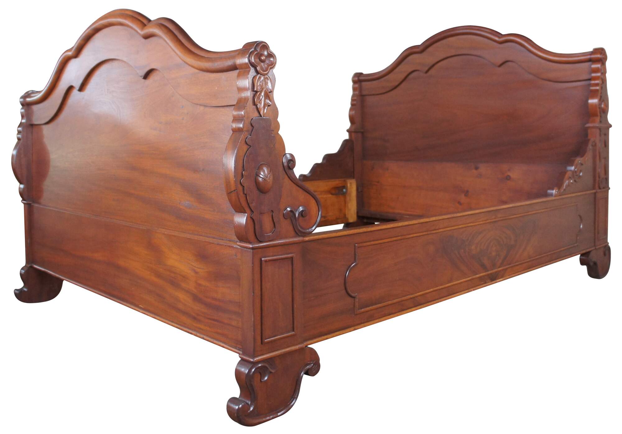 A stunning Victorian era crotch mahogany bed full size or double frame, circa 1870s. Elegant in form with serpentine head and footboards. Features large crotch mahogany bed rails foliate carvings and beautiful medallions. Feet are pronounced in a sleigh form with intricate detail. Exceptional designs and craftmanship