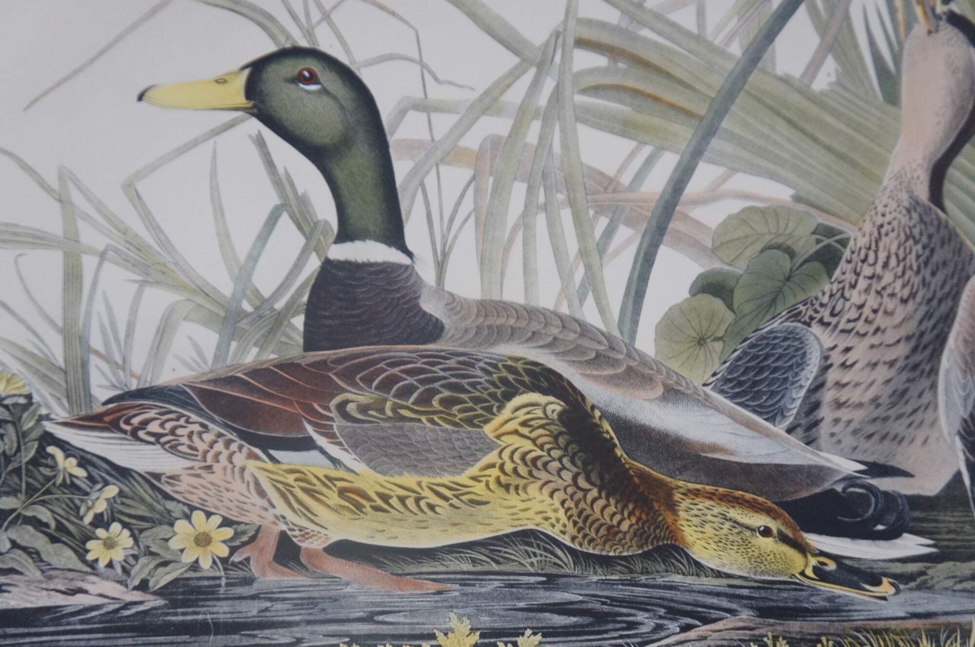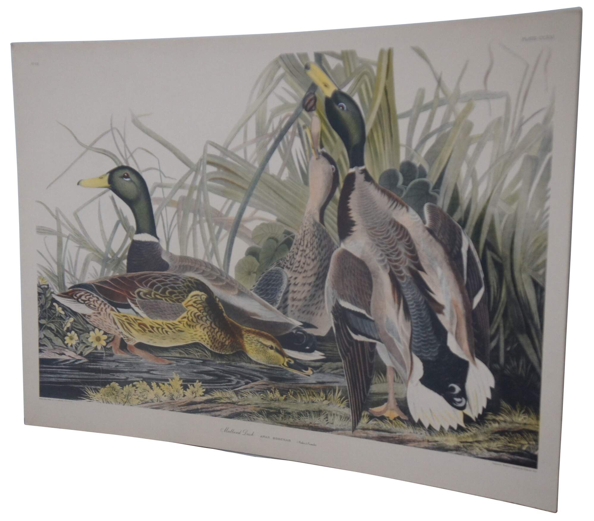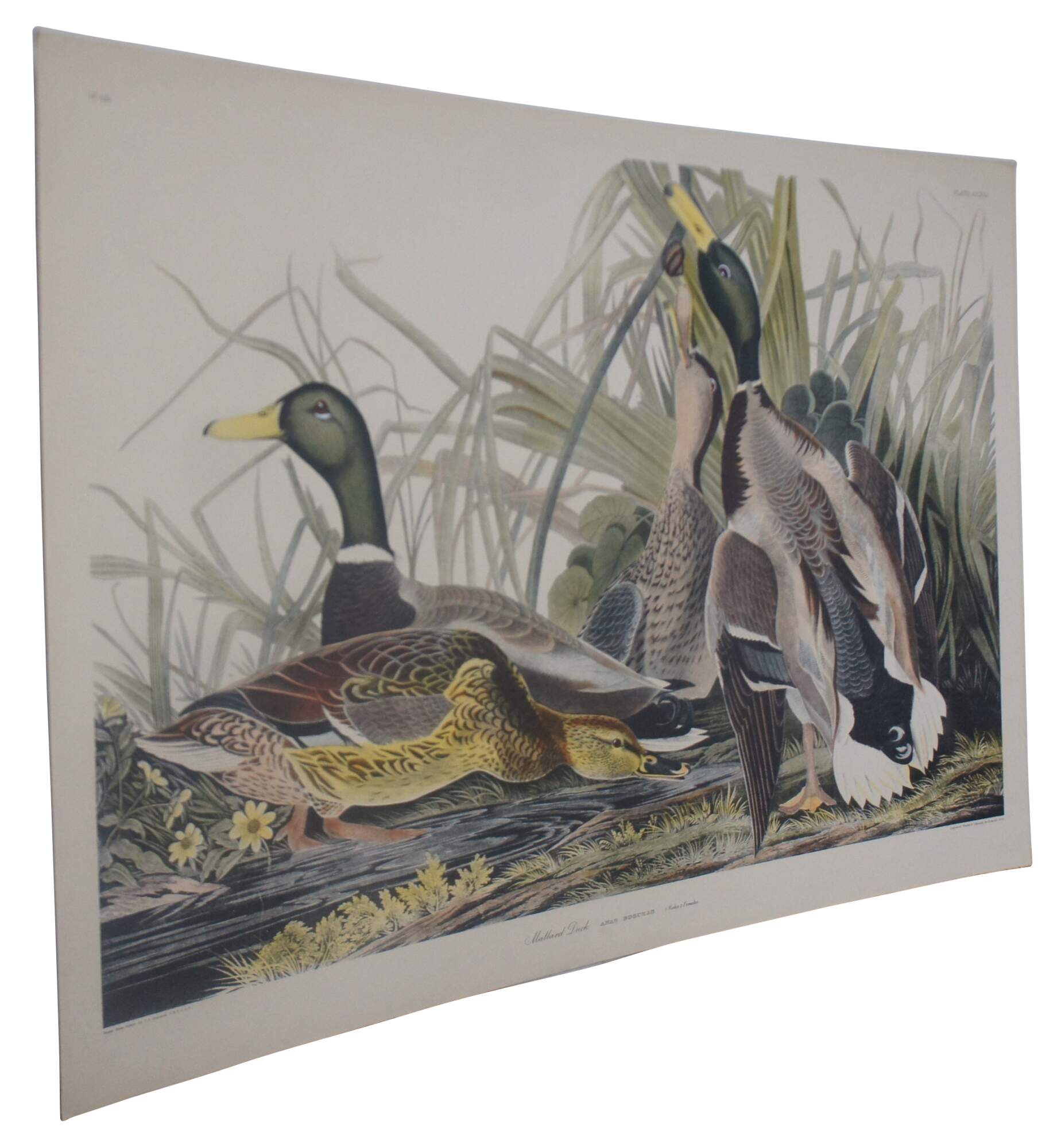 20th century Robert Havell colored engraving featuring two pairs of Mallard Ducks drawn by J.J Audubon. “Born in Reading, England, Robert Havell (1793-1878) was the son of an engraver, and was expected to follow that profession. Fulfilling his destiny, he is remembered for his aquatint engraving of all but the first 10 plates of John James Audubon's Birds of America. He first visited Audubon in 1839 in New York City and traveled and sketched the countryside in a homemade horse-drawn trailer, and together they had skills that were well met. He also did artwork in oil and watercolor in Hudson River style with Luminism. However, he preferred to think of himself as an engraver.