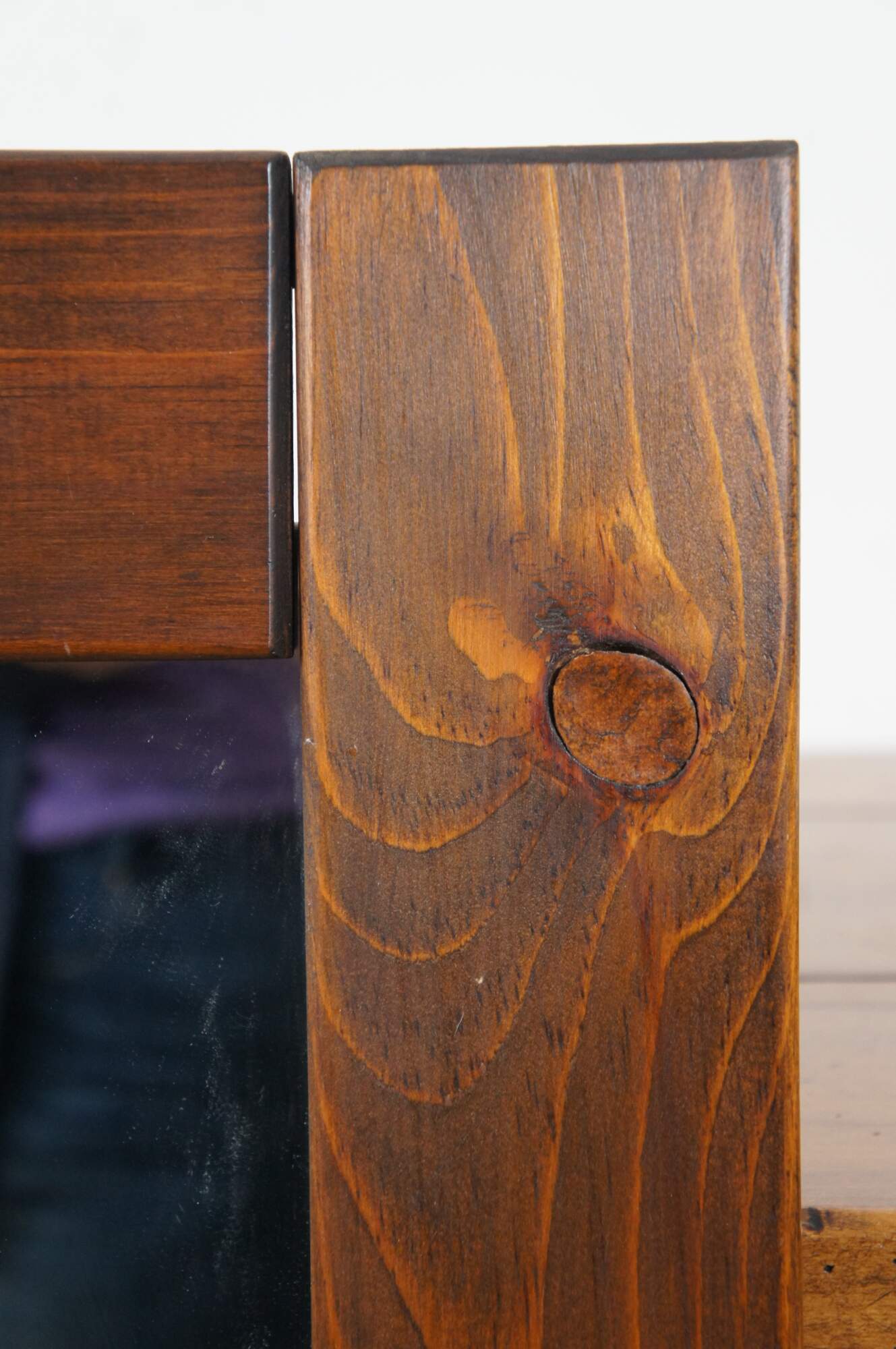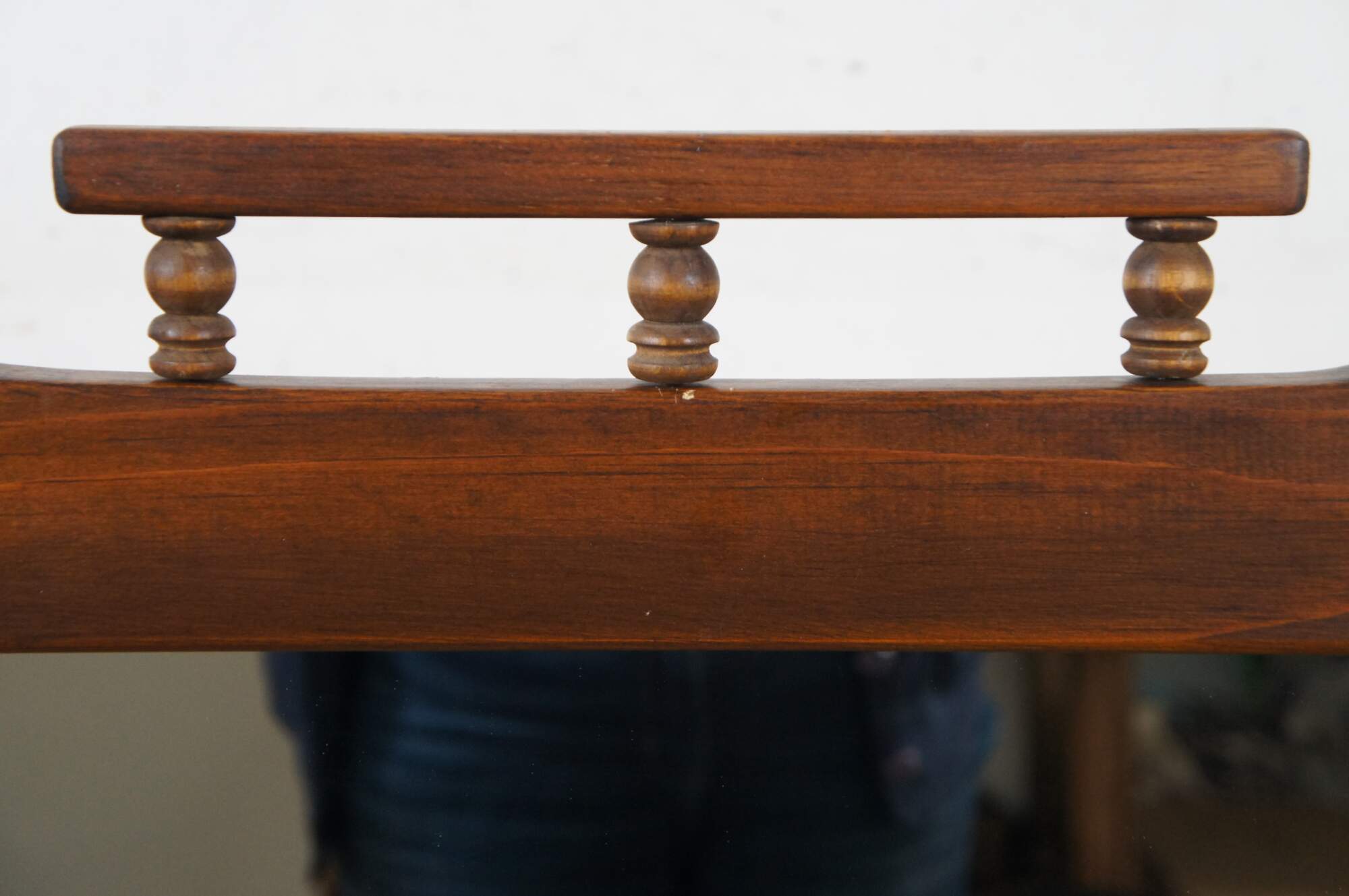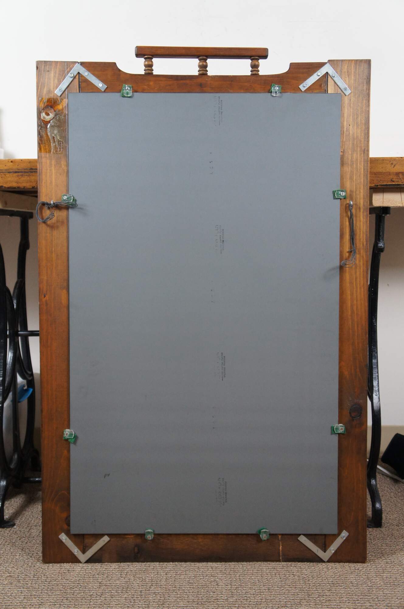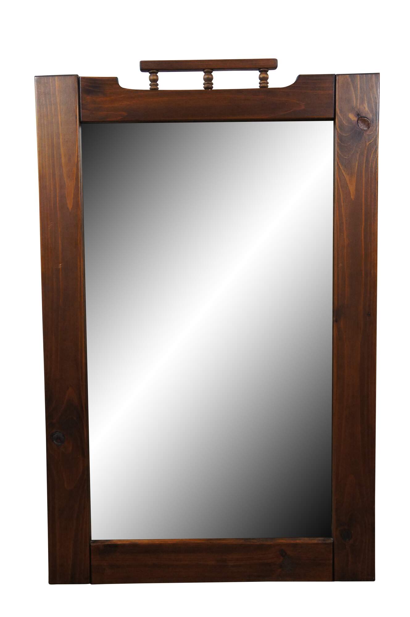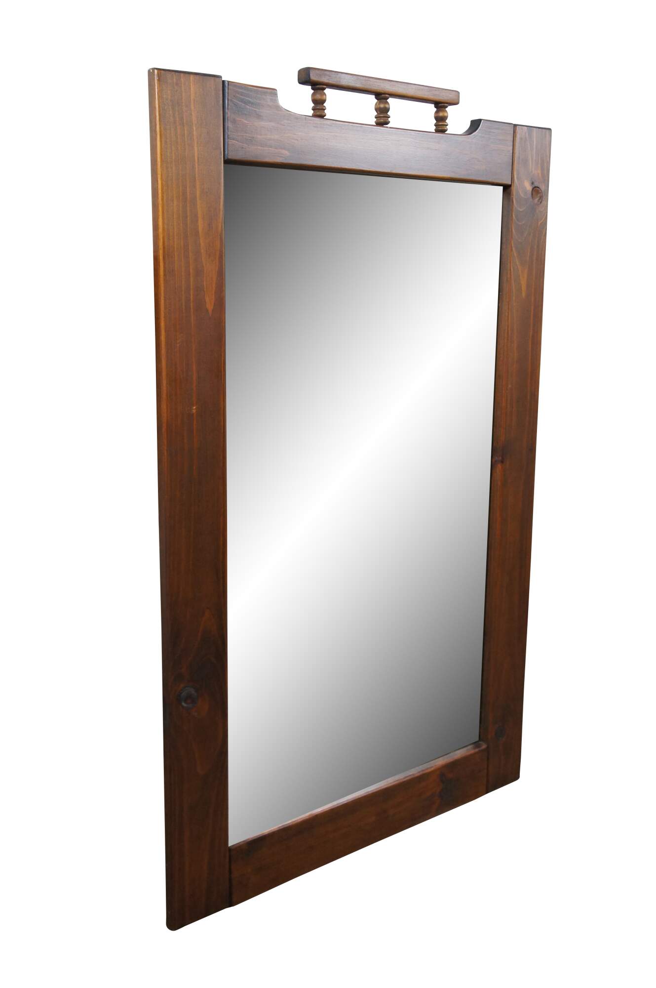 Mid Century wall hanging or over mantel mirror. Features a rectangular frame made from American pine with spindled accents along the top. The mirror is marked Toledo (Ohio) Plate Electro Copper Plated.
