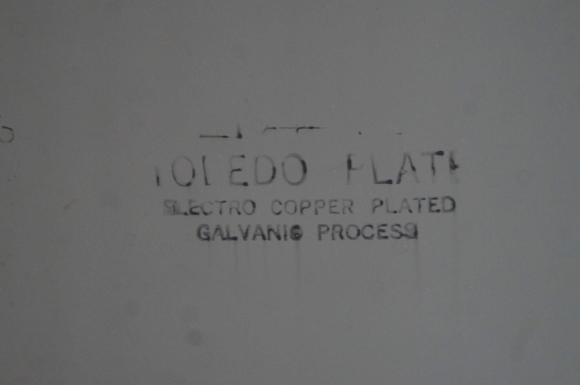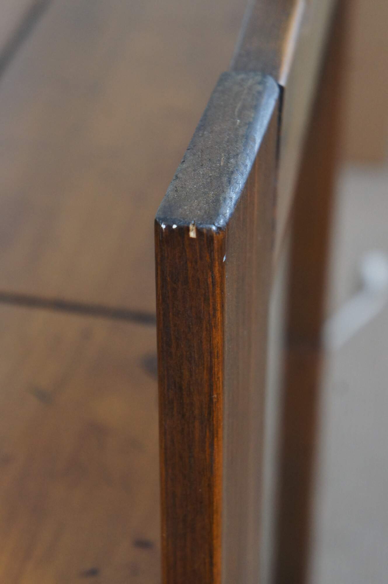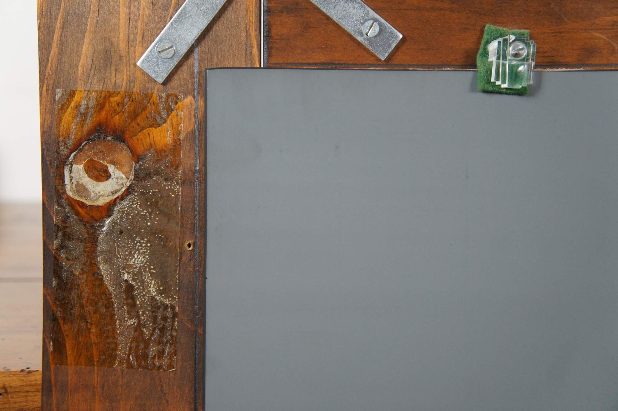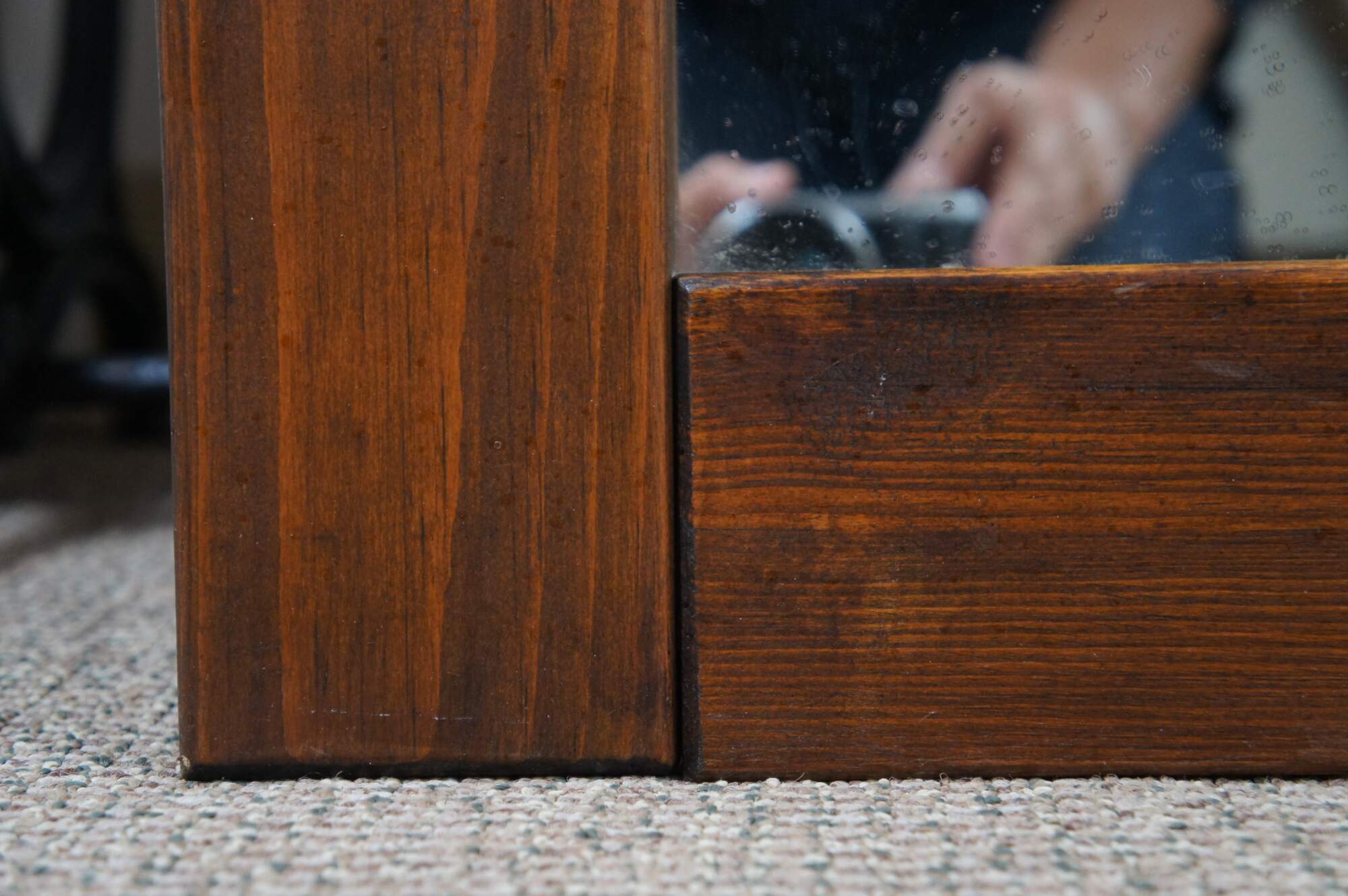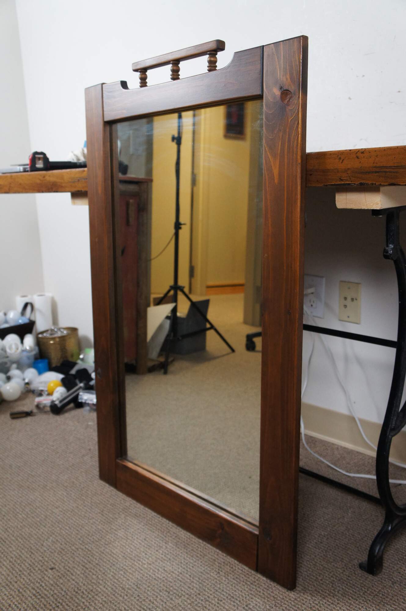 Mid Century wall hanging or over mantel mirror. Features a rectangular frame made from American pine with spindled accents along the top. The mirror is marked Toledo (Ohio) Plate Electro Copper Plated.