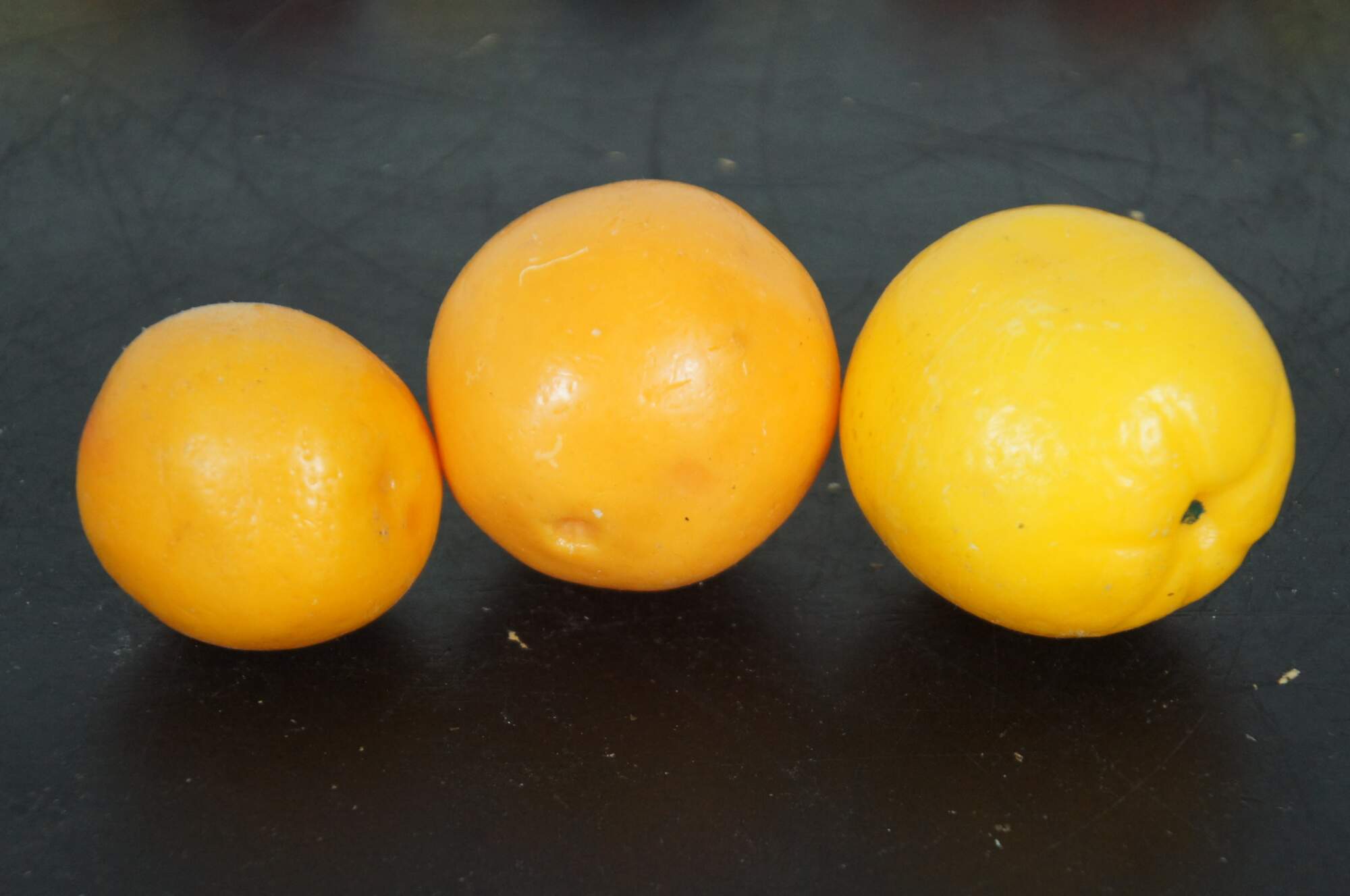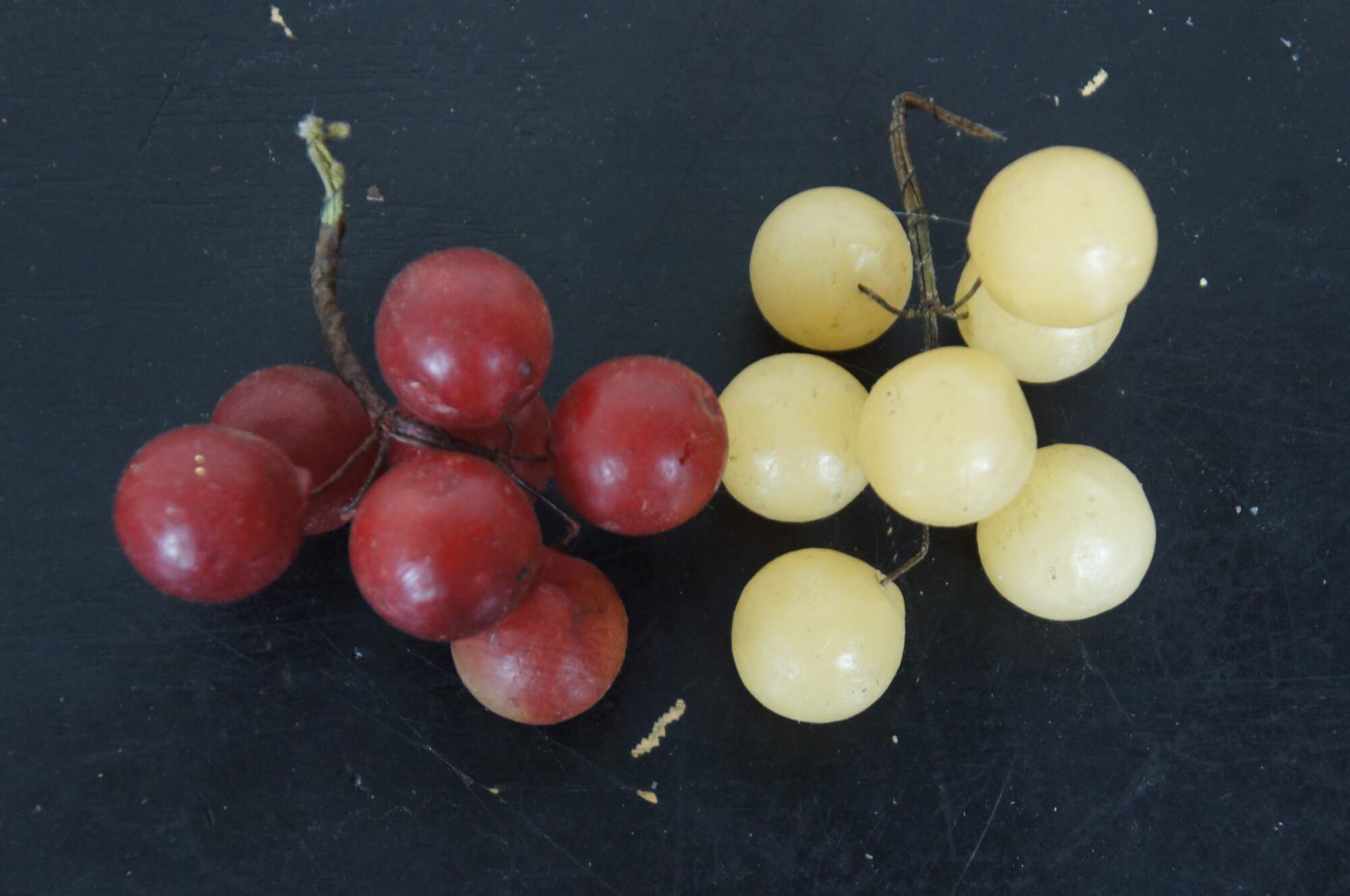 Lot of 40 pieces of wax fruit featuring apples, pears, peaches, oranges, bananas and grapes. One pear is plastic covered polystyrene.