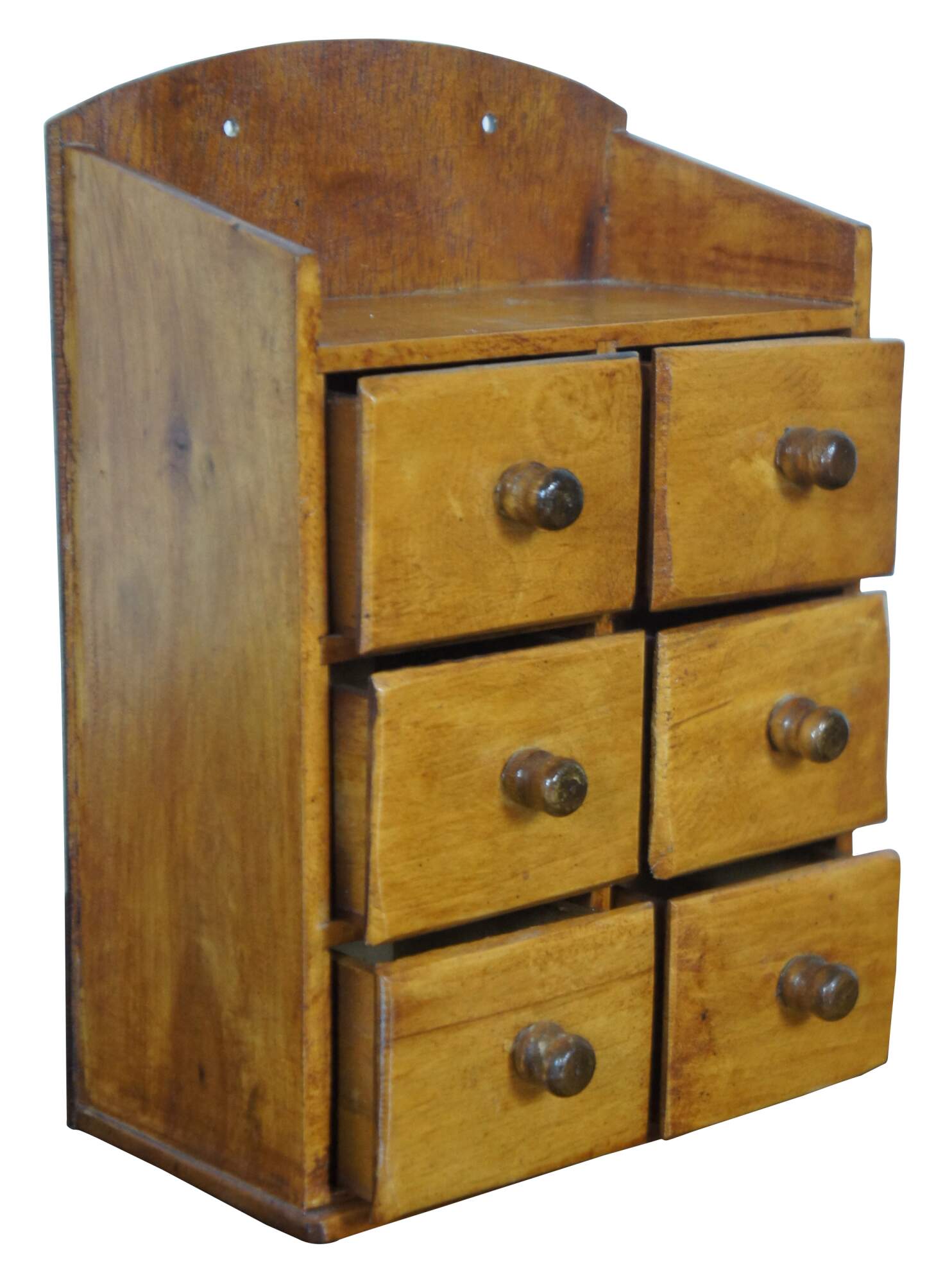 Vintage country farmhouse / kitchen / pantry wall hanging wood (poplar) spice box / cupboard rack with six drawers and upper shelf.