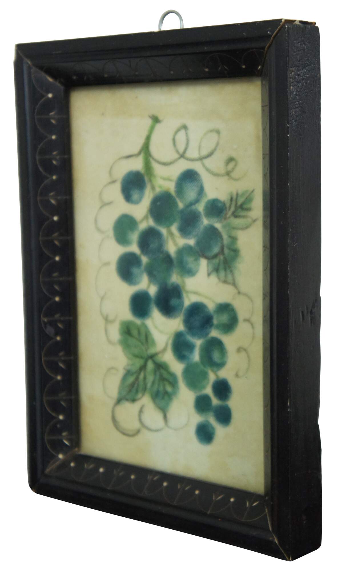 Small antique still life pastel drawing on cloth of a bunch of grapes.
