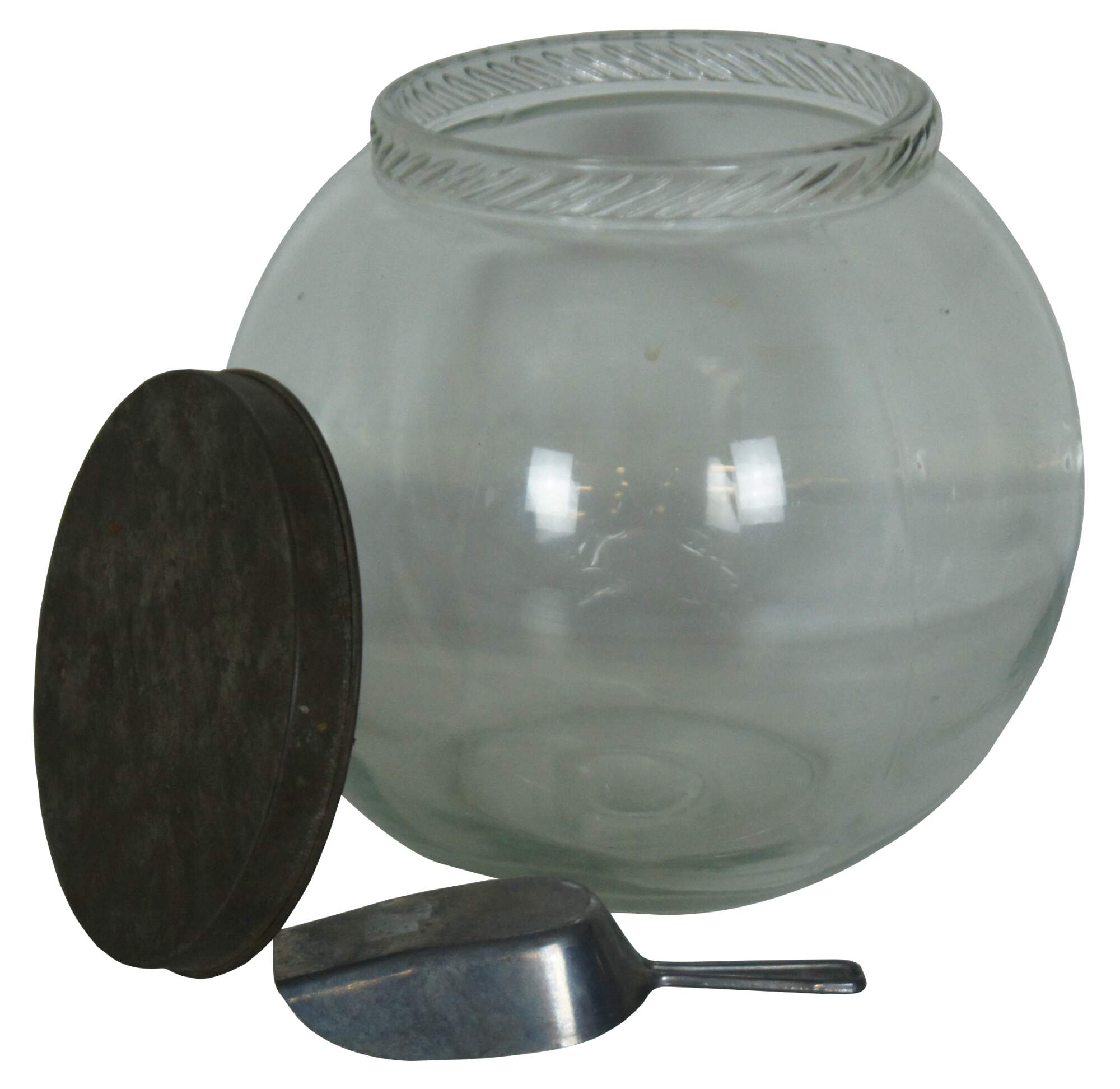 Set of three rare antique 1920’s clear glass fish bowl shaped candy containers with metal lids and three vintage West German scoops.