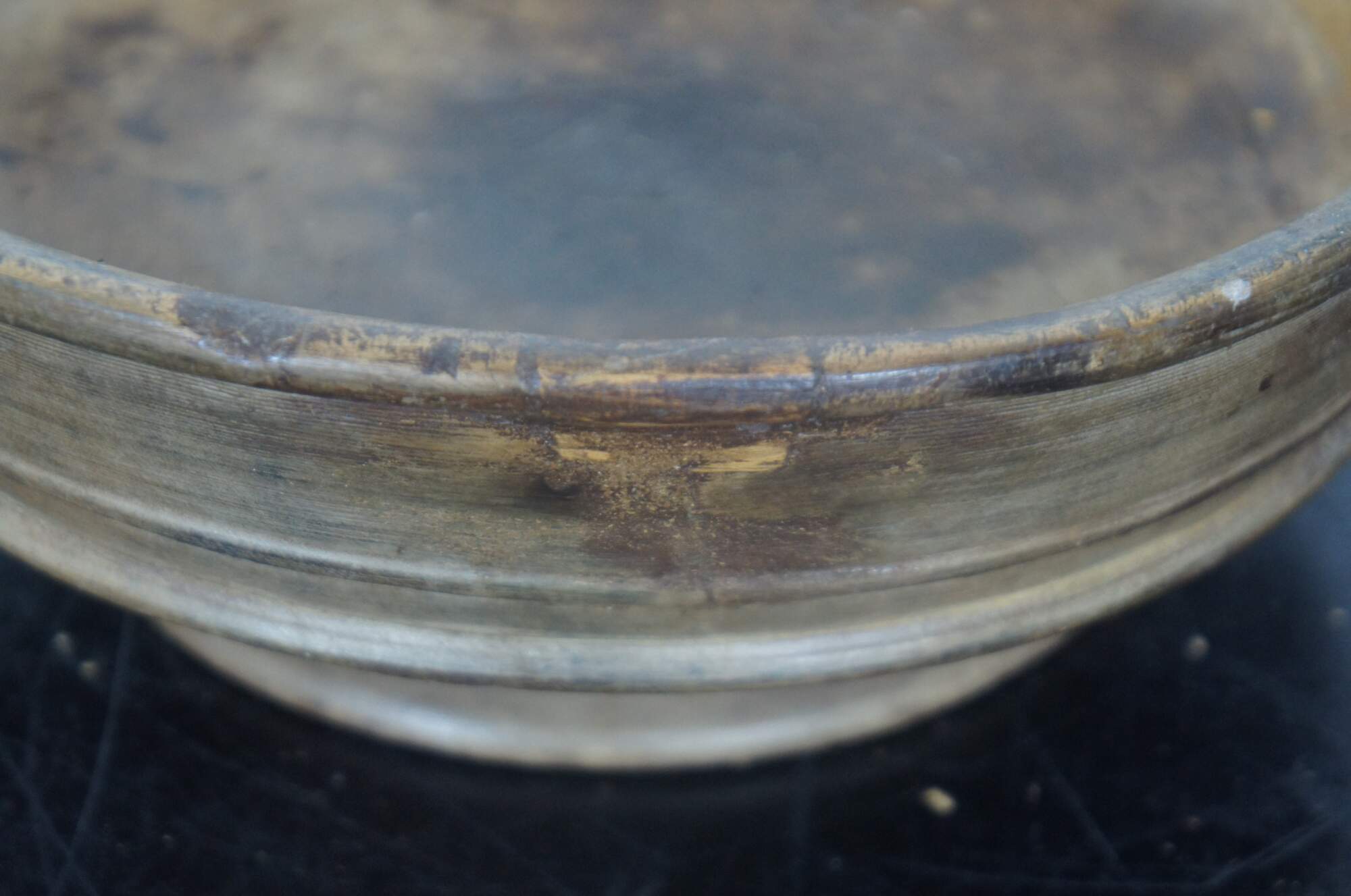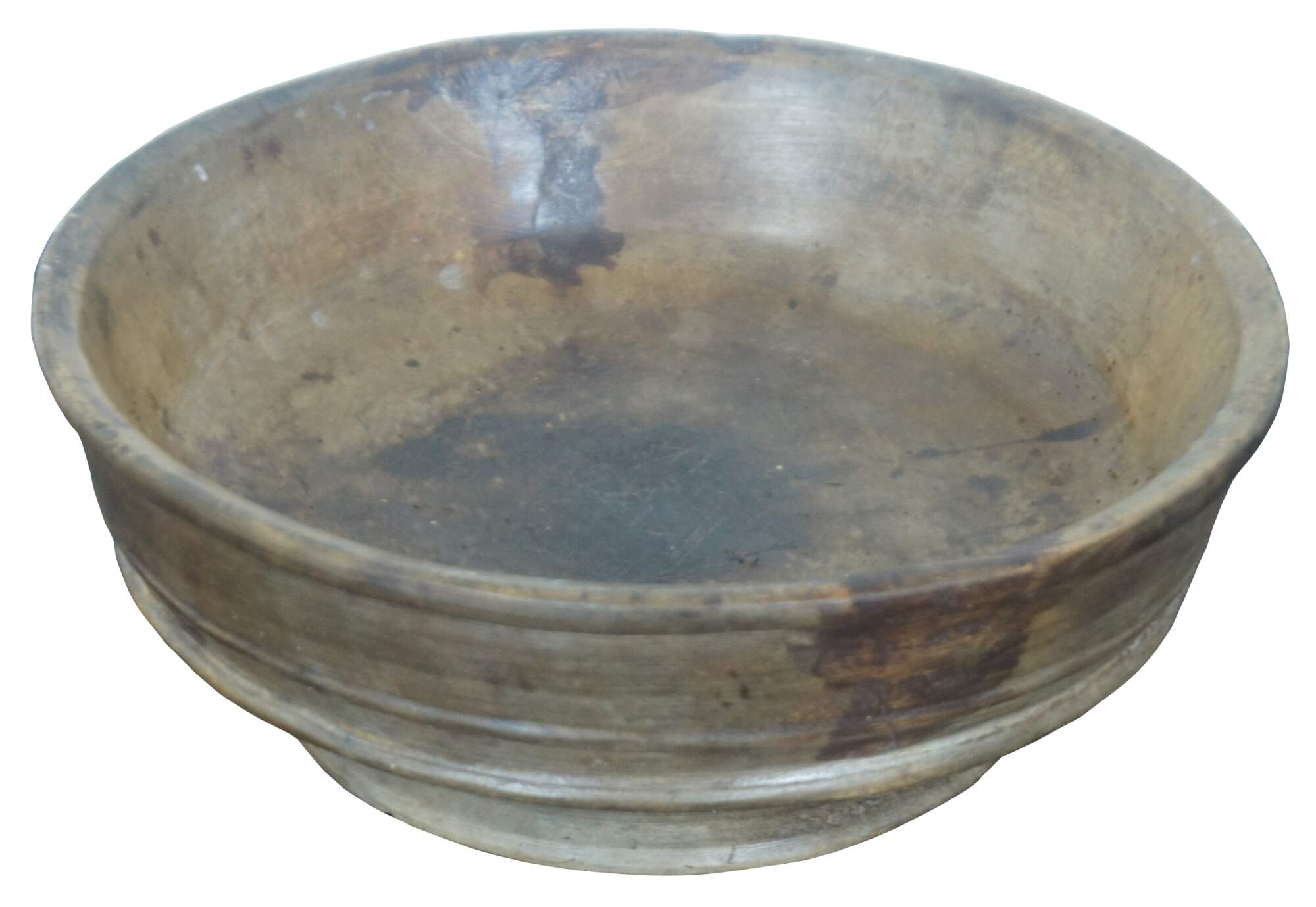 Antique primitive turned wood footed dough bowl or centerpiece with simple decorative ridges.