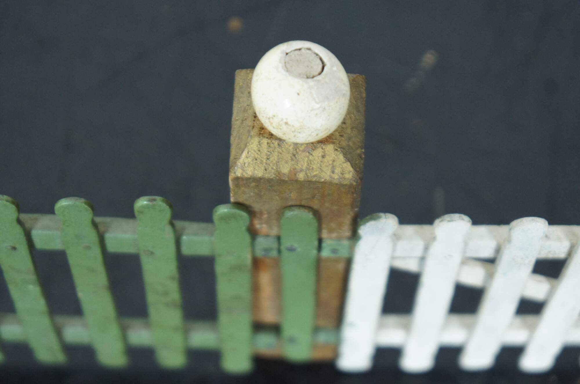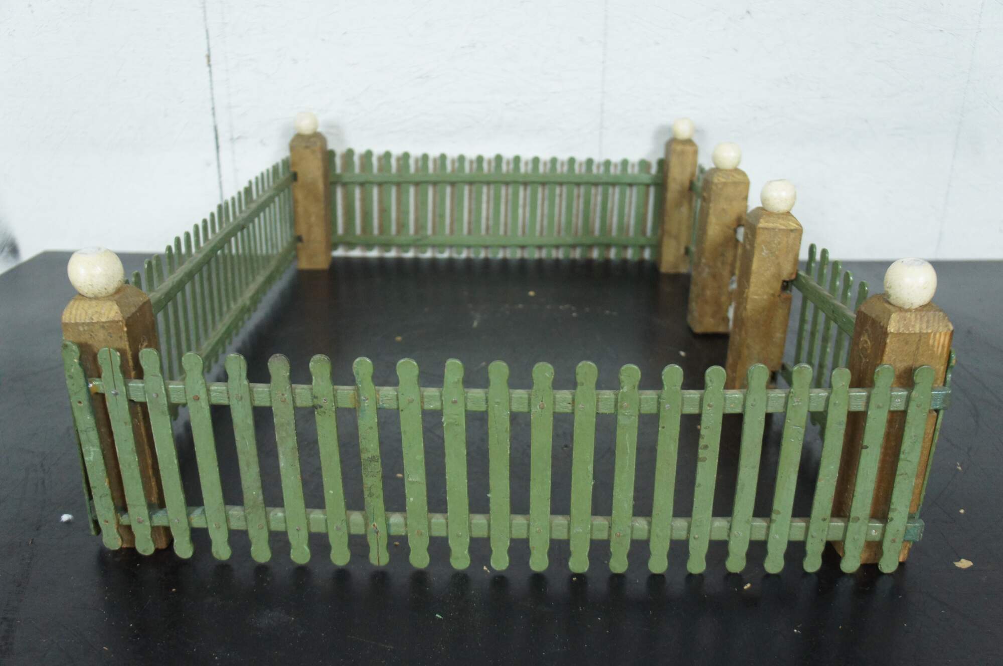 Vintage hand made popsicle stick picket fence for use in decoration of a village around a Christmas tree. Painted in green with a non-functional white gate and gold corner posts topped with white globes.