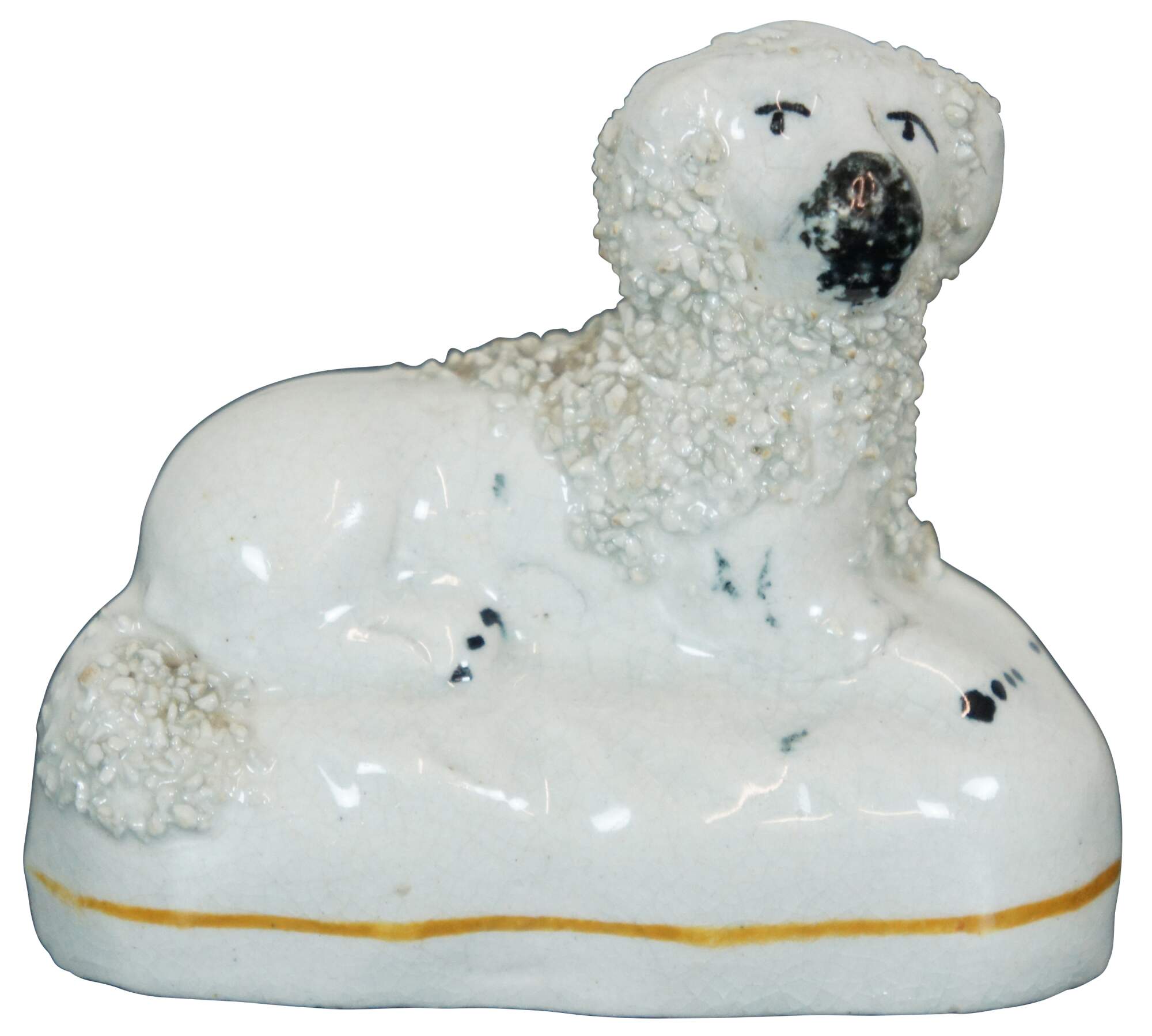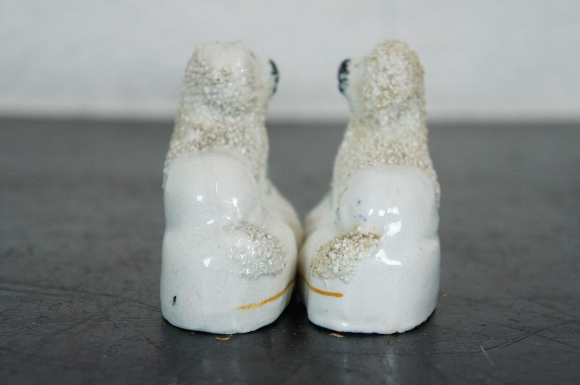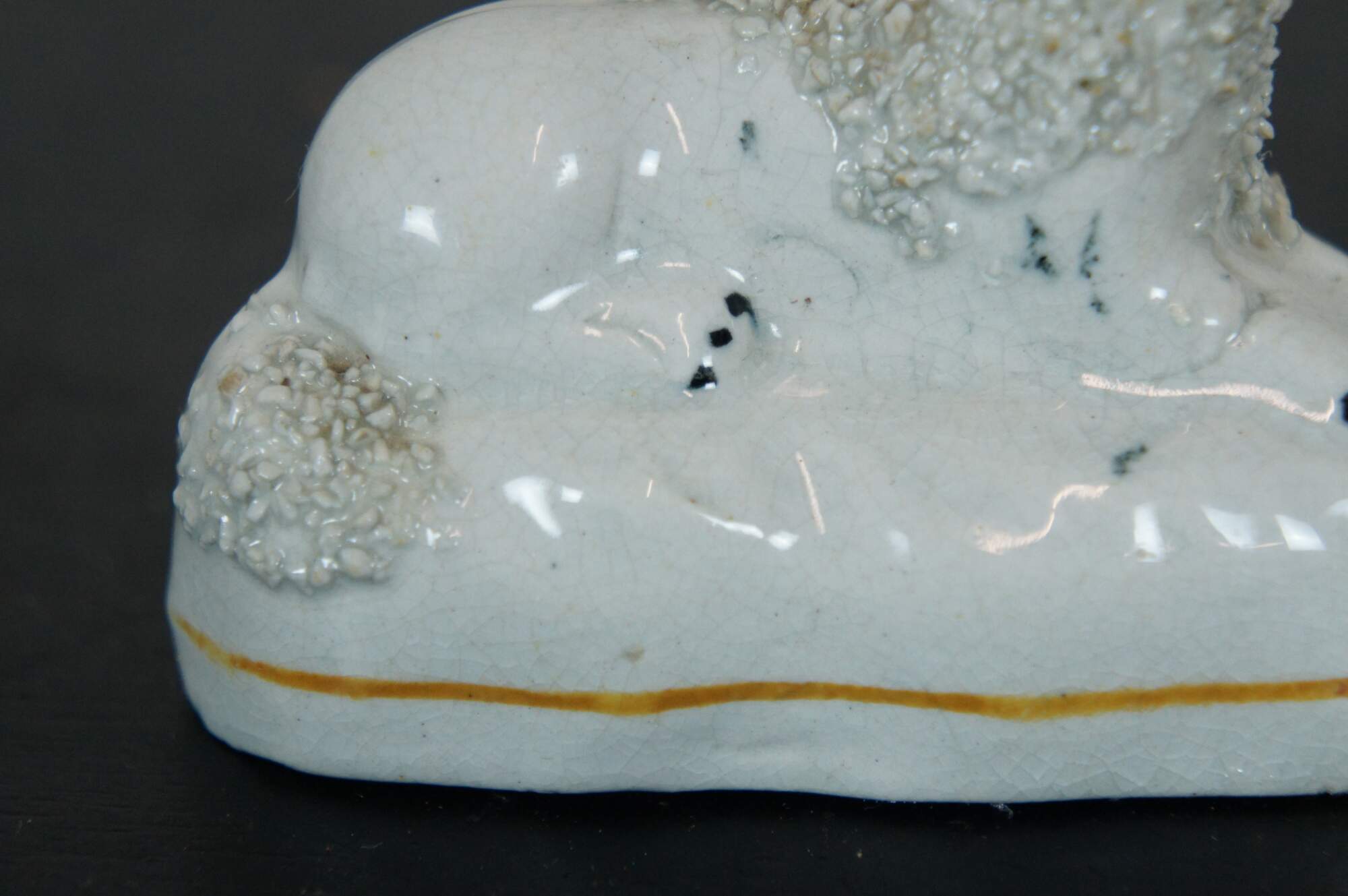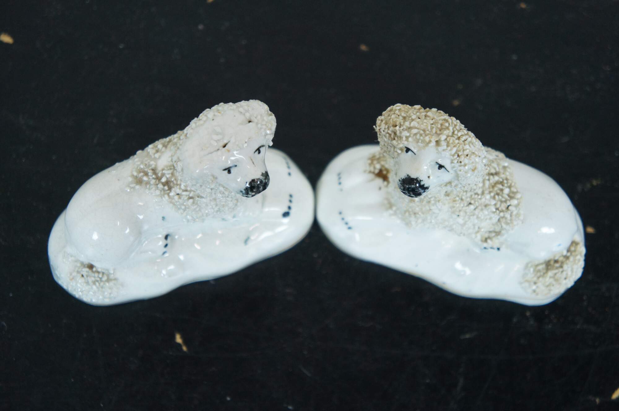 Pair of antique miniature 19th century Staffordshire porcelain figurines in the shape of reclining Lambs with black noses and confetti fur. Great for display or even use as a bookend.