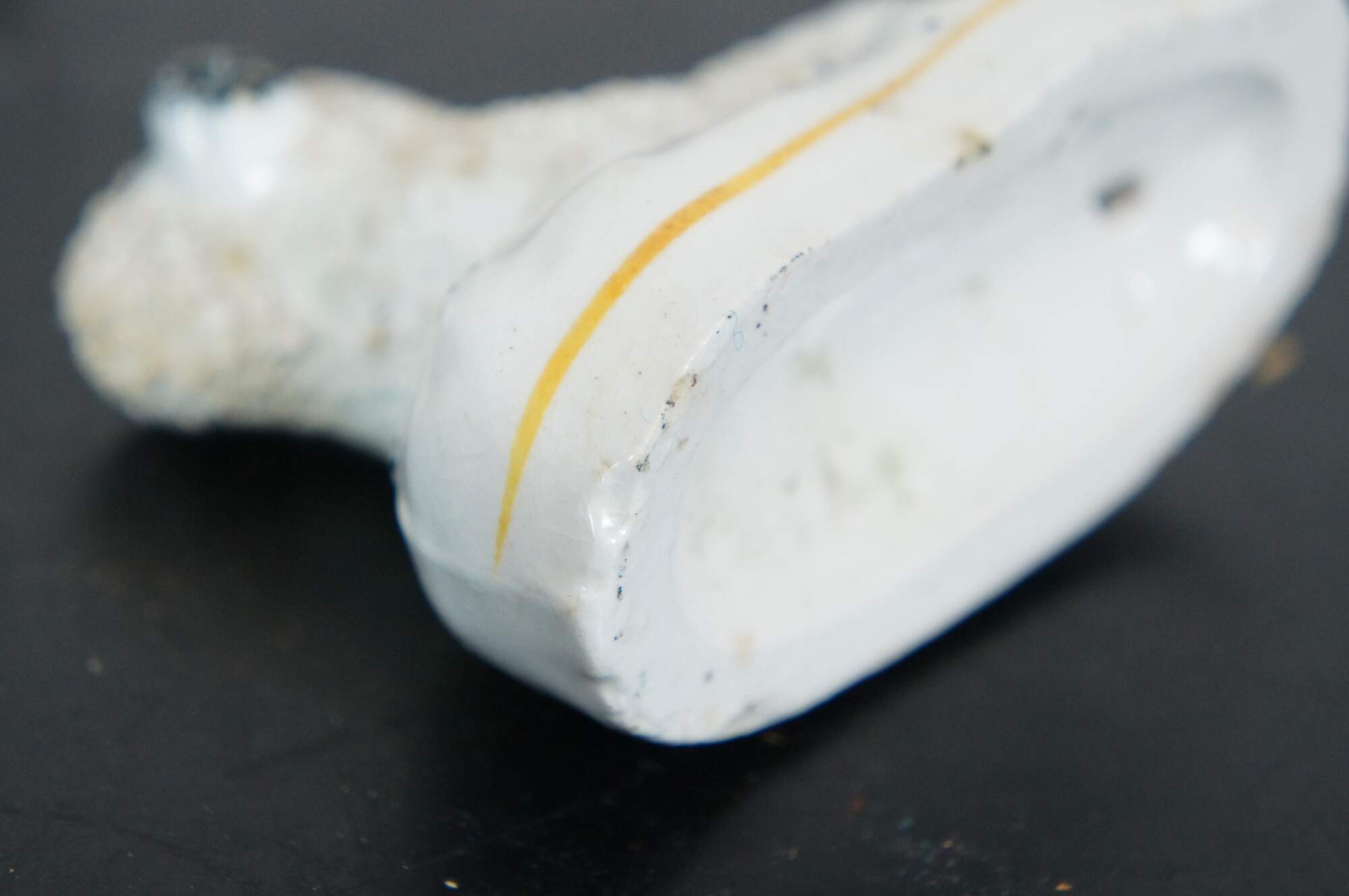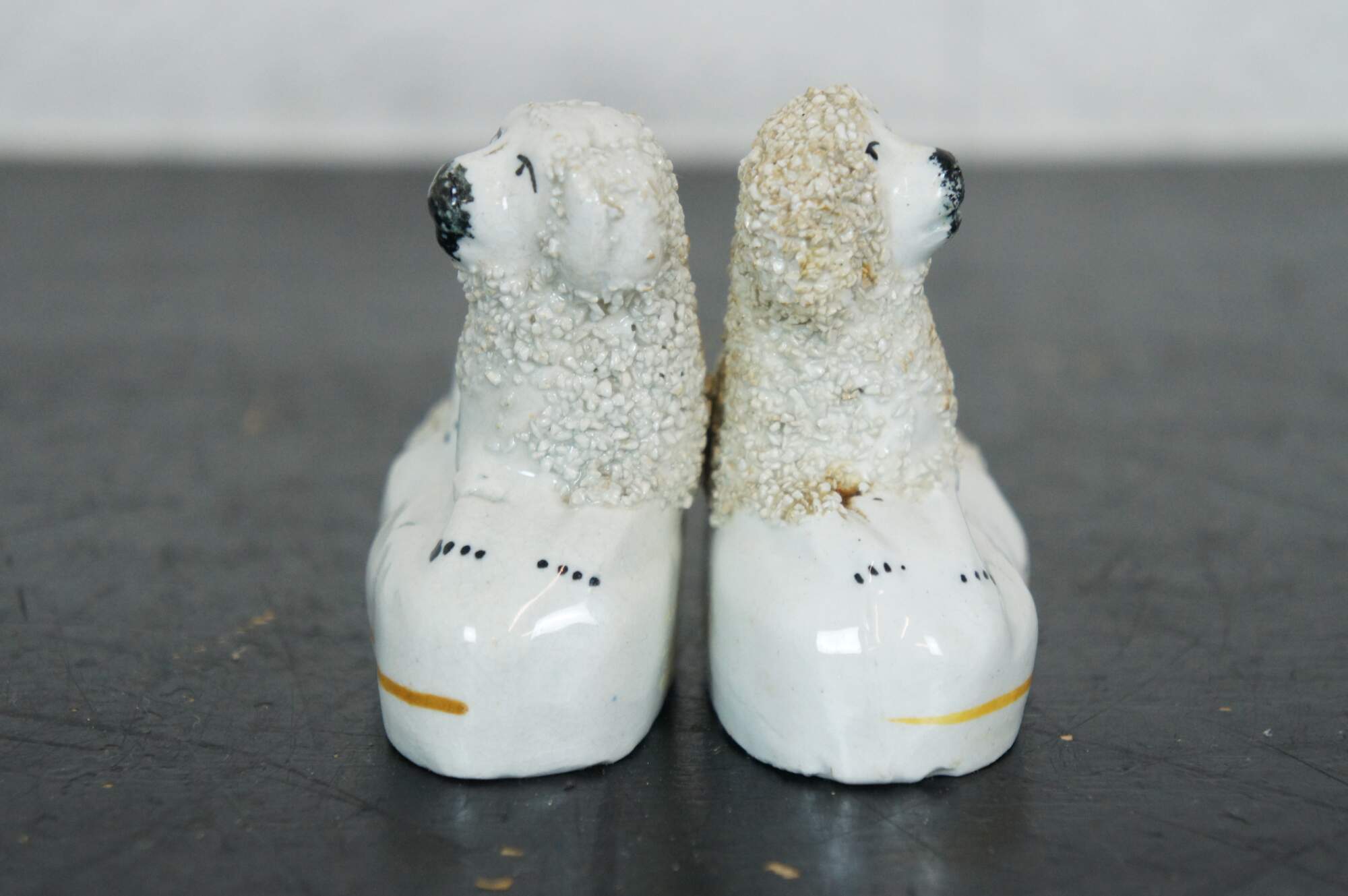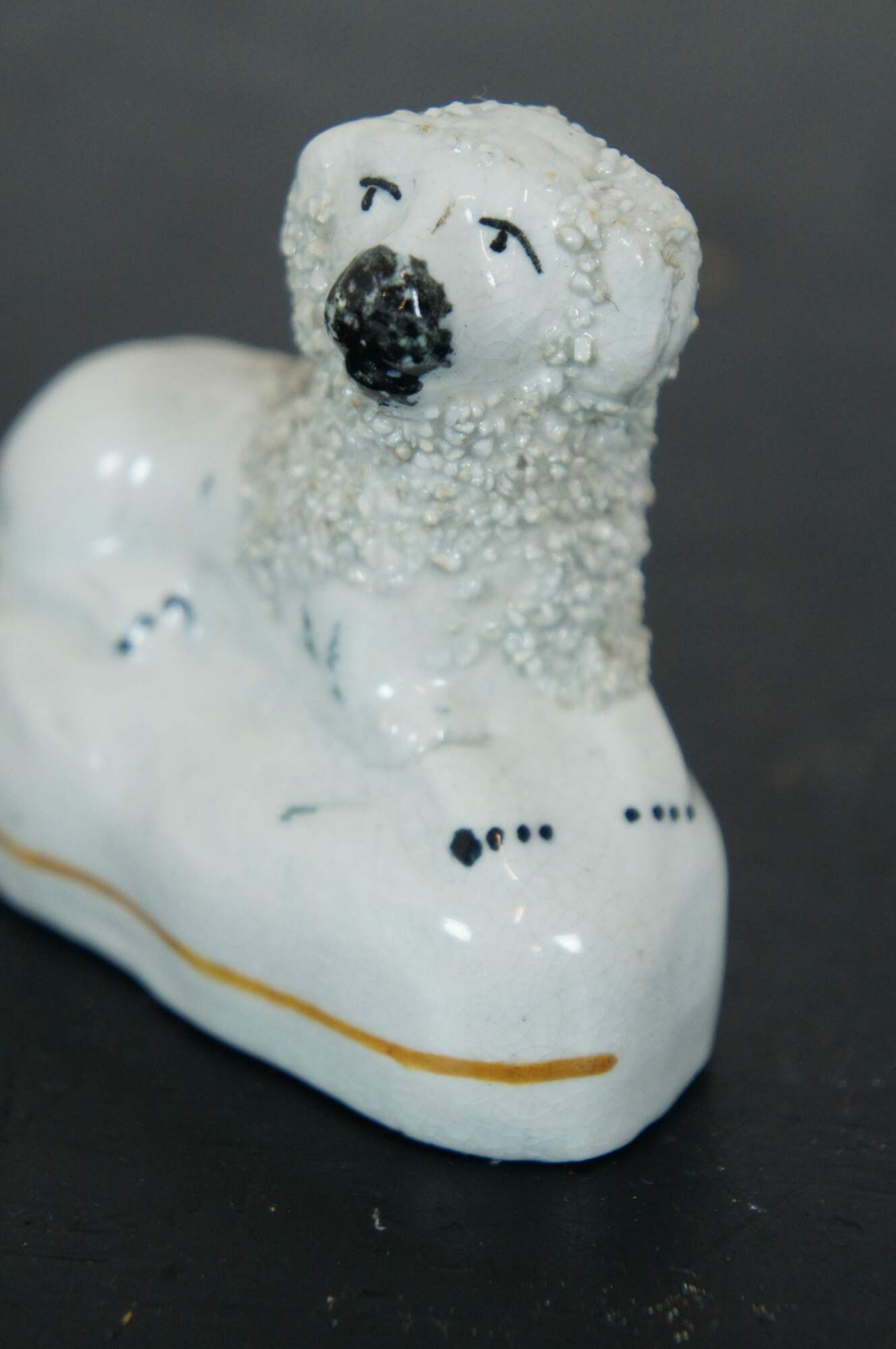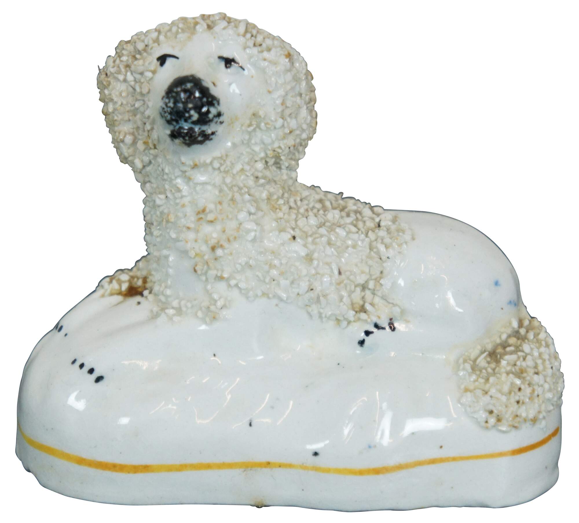 Pair of antique miniature 19th century Staffordshire porcelain figurines in the shape of reclining Lambs with black noses and confetti fur. Great for display or even use as a bookend.