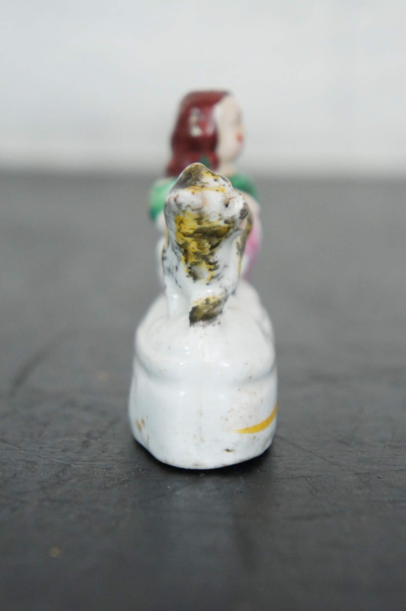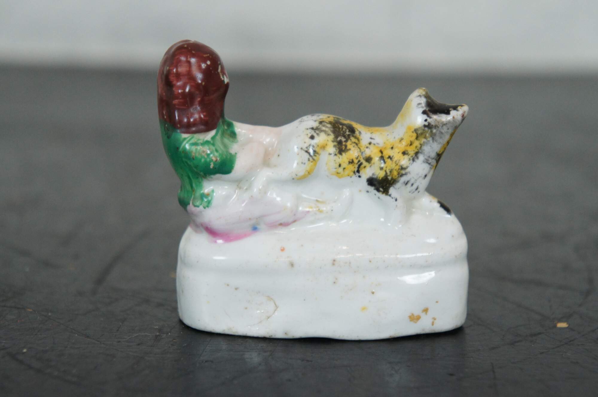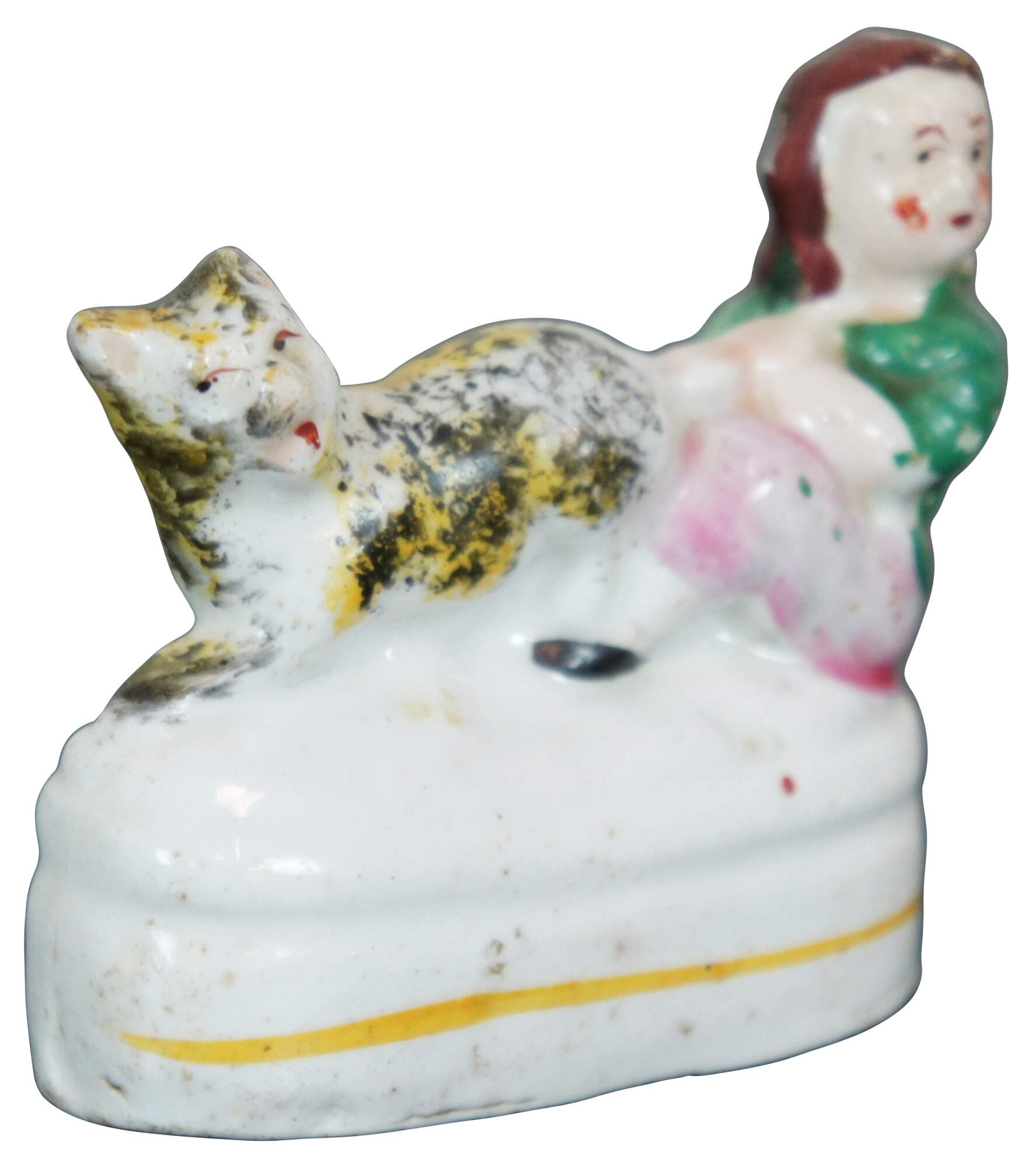 Antique 19th century miniature porcelain figurine in the shape of a child pulling a cat’s tail.