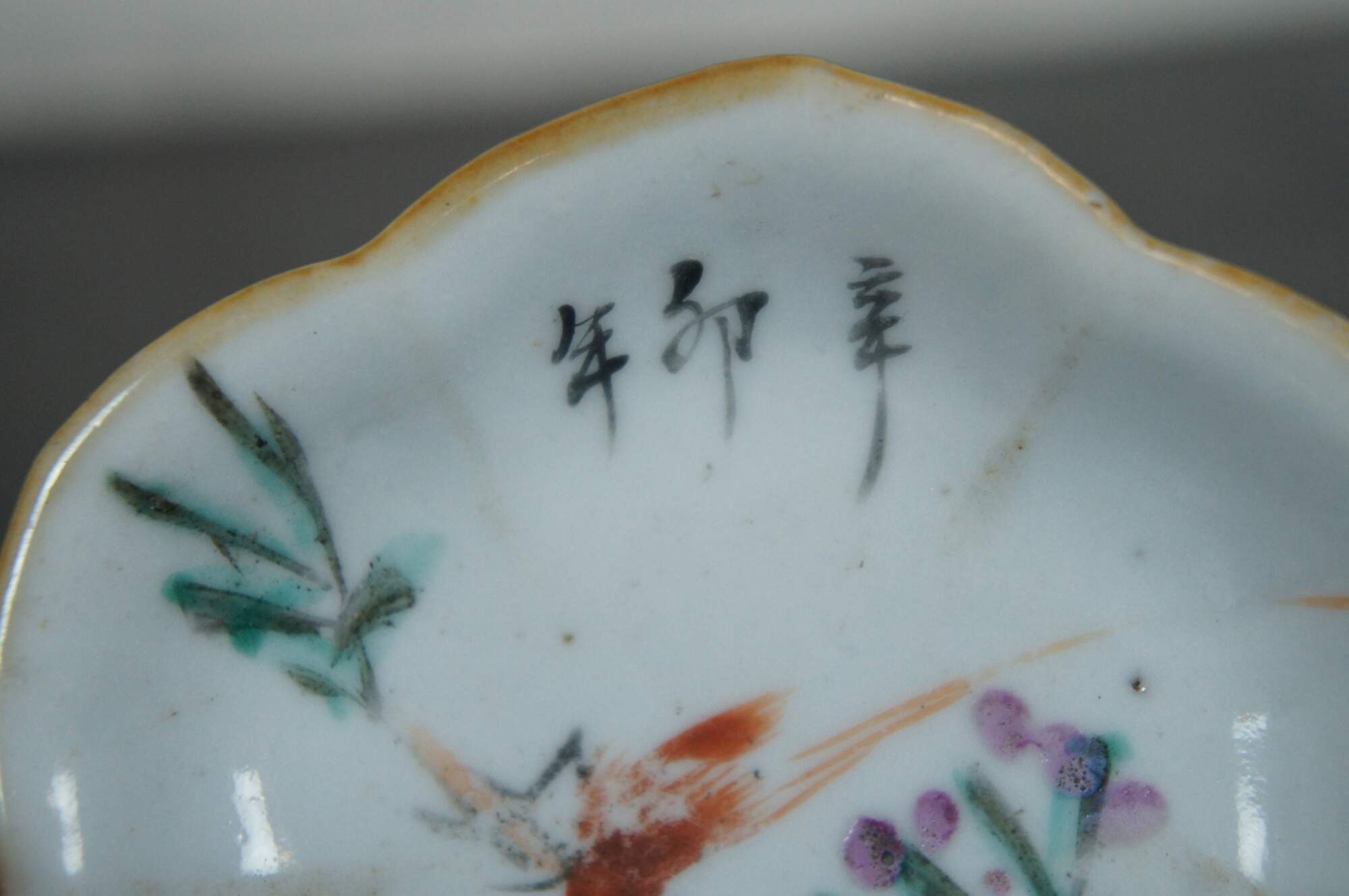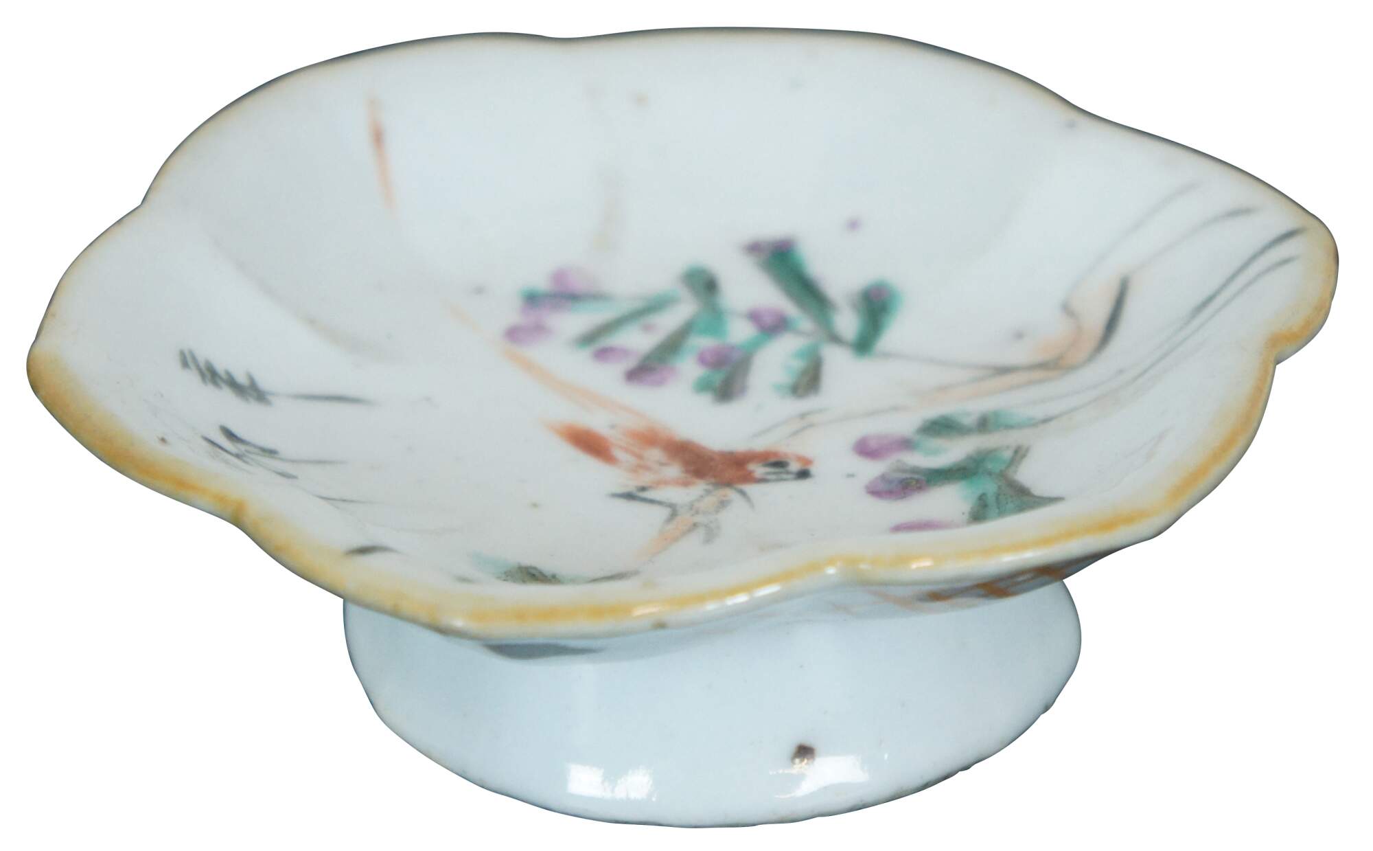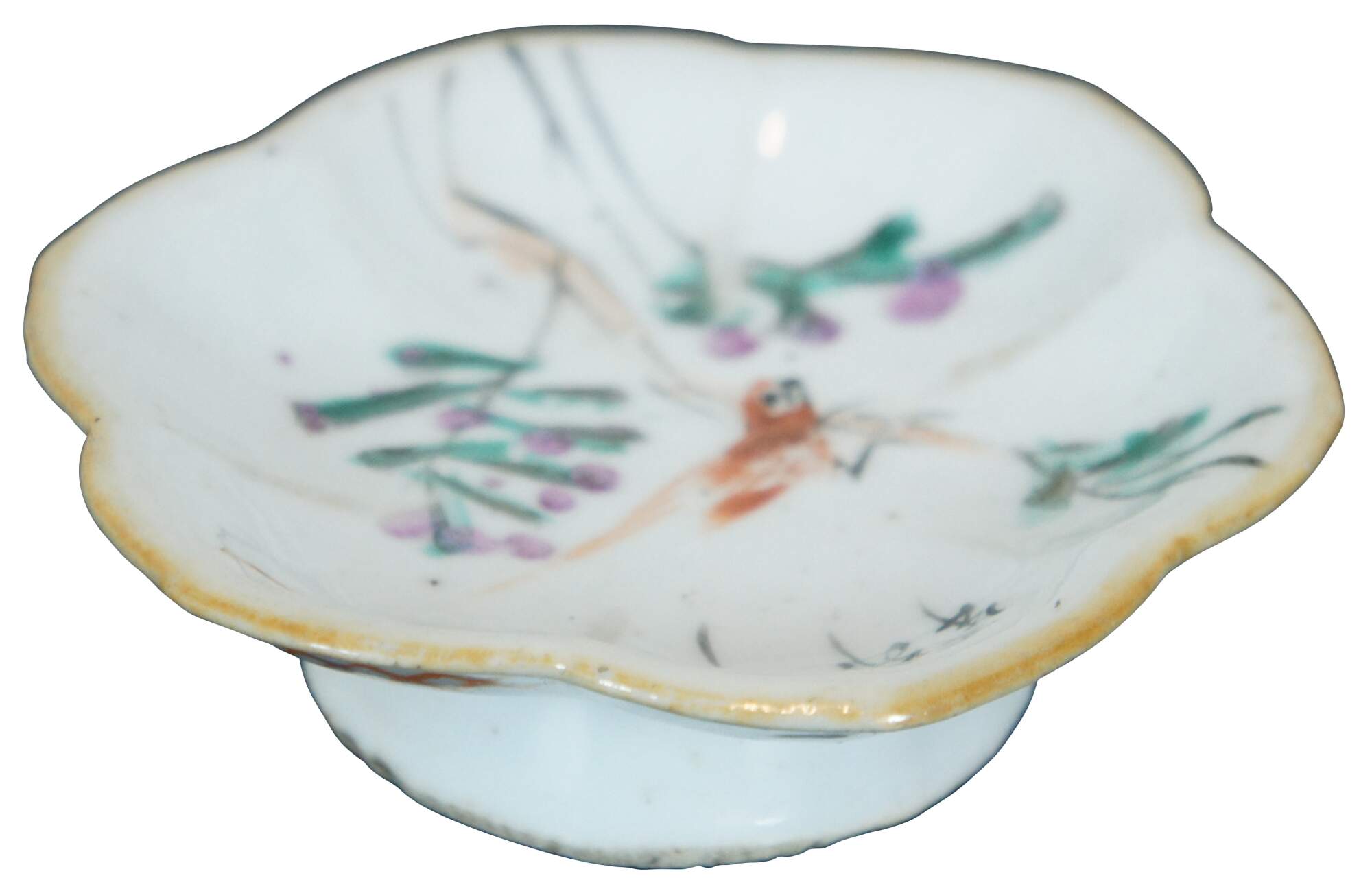 Antique late 19th – early 20th century Chinese export footed porcelain dish with a lotus flower shape, painted with a bird perched on flowering branches.