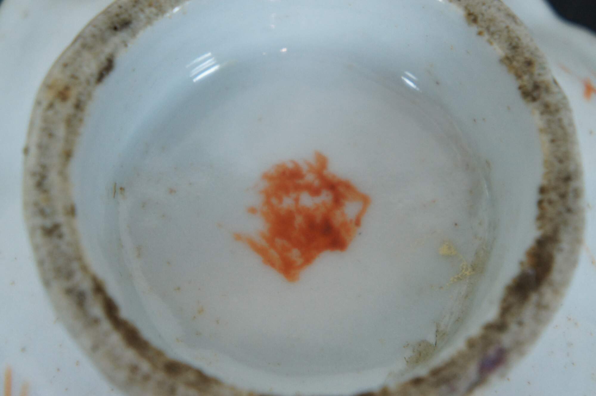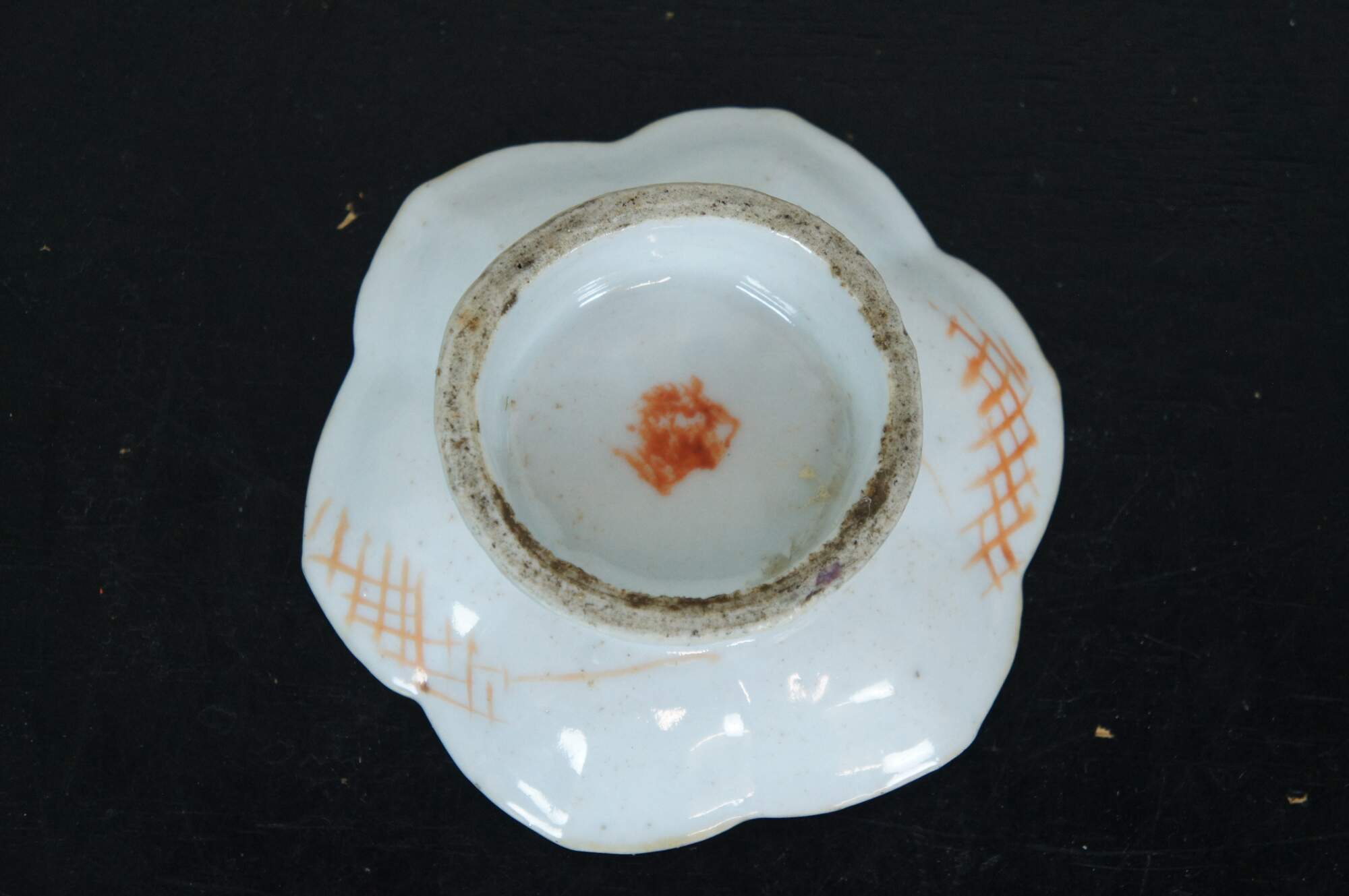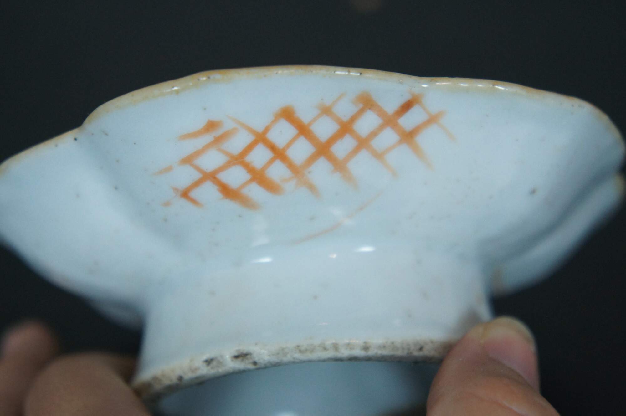 Antique late 19th – early 20th century Chinese export footed porcelain dish with a lotus flower shape, painted with a bird perched on flowering branches.