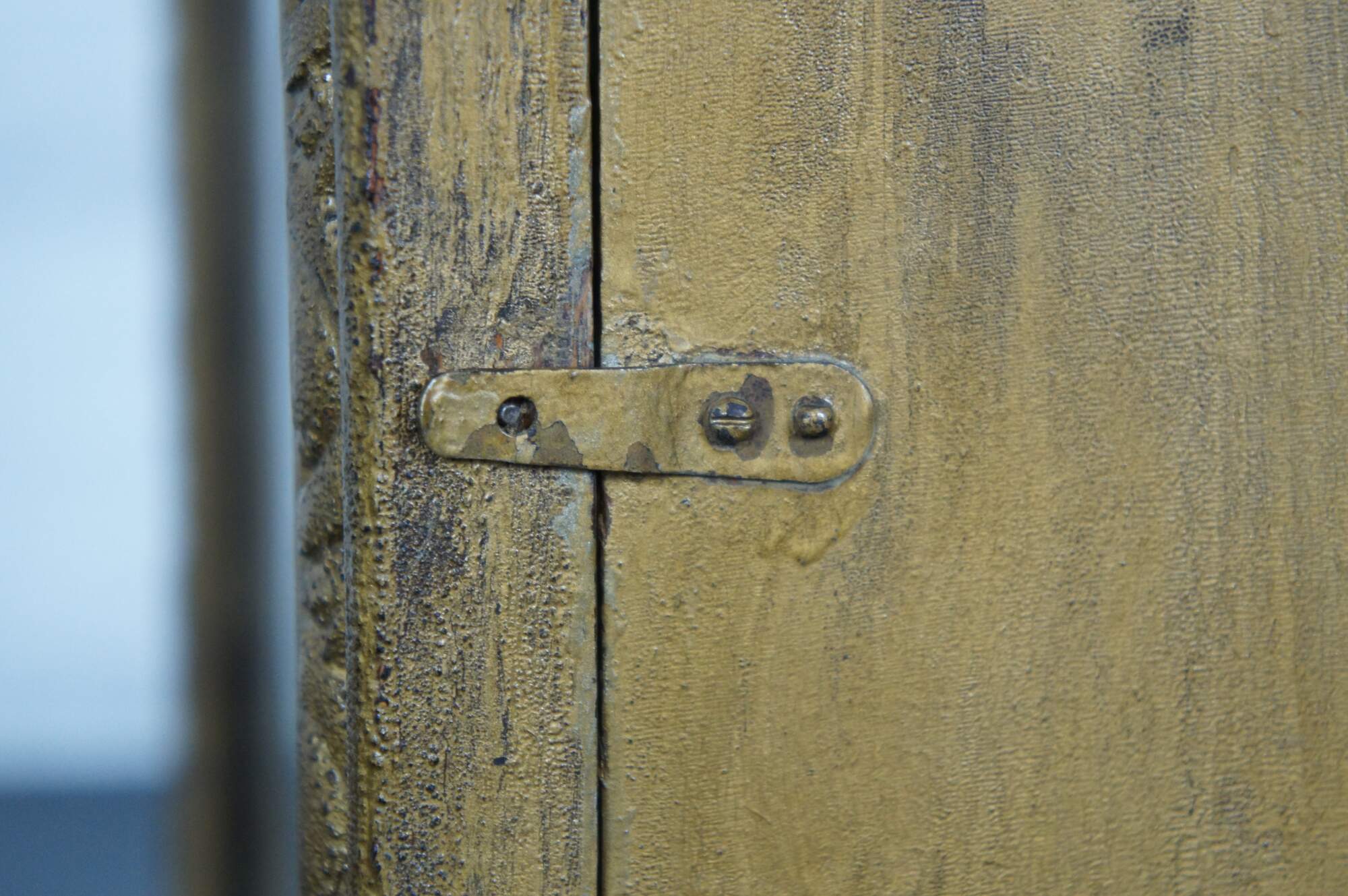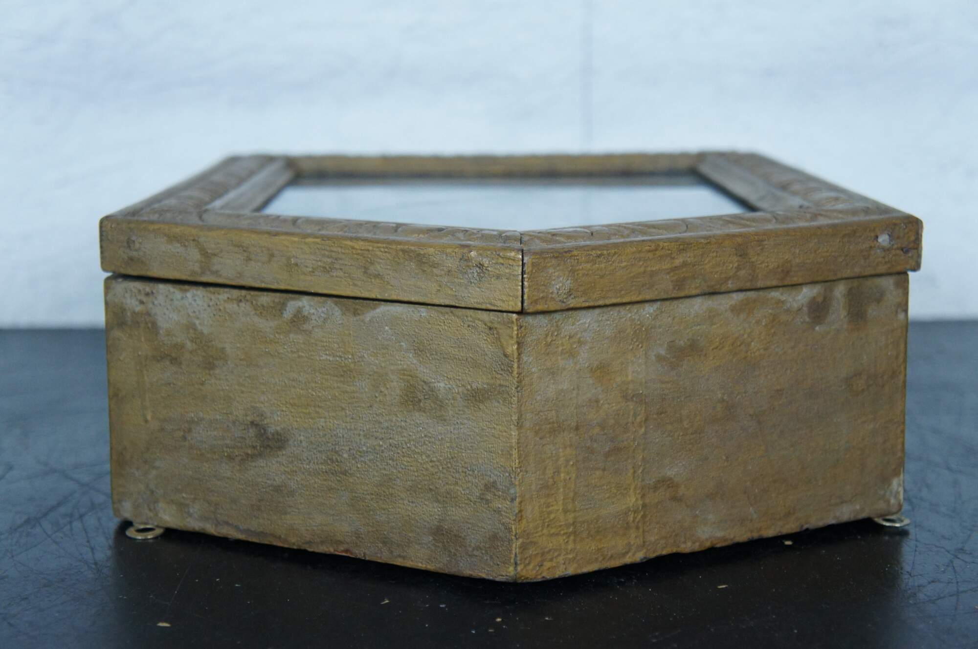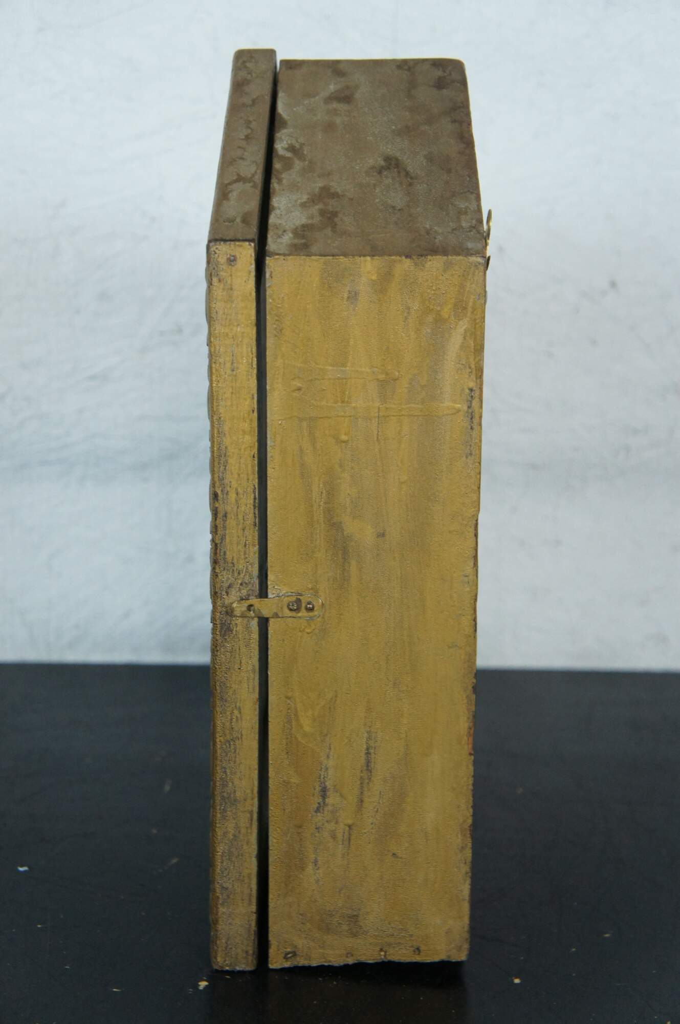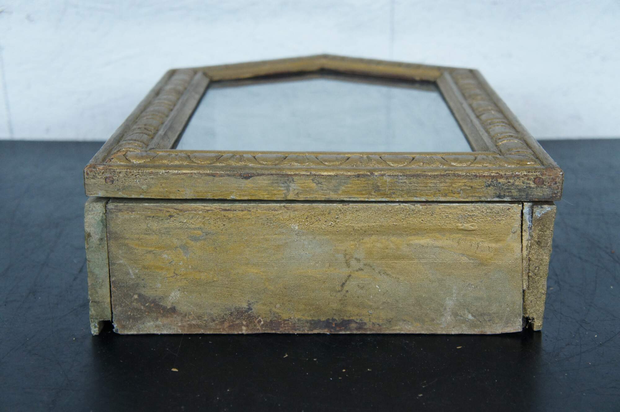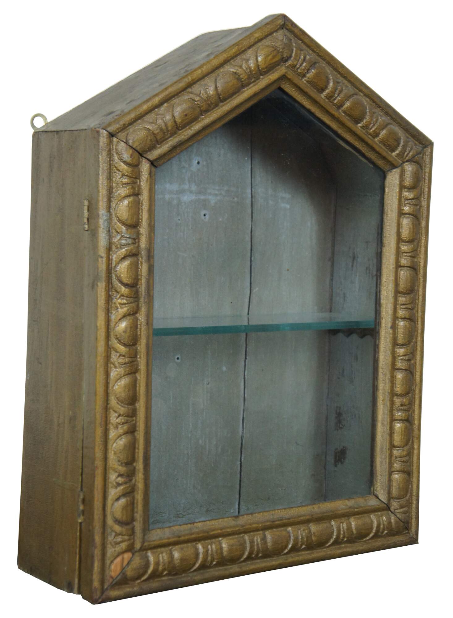 Antique gold painted wood & glass front wall hanging curio or bathroom cabinet with a peaked front and carved details, white painted interior, and one glass shelf inside.