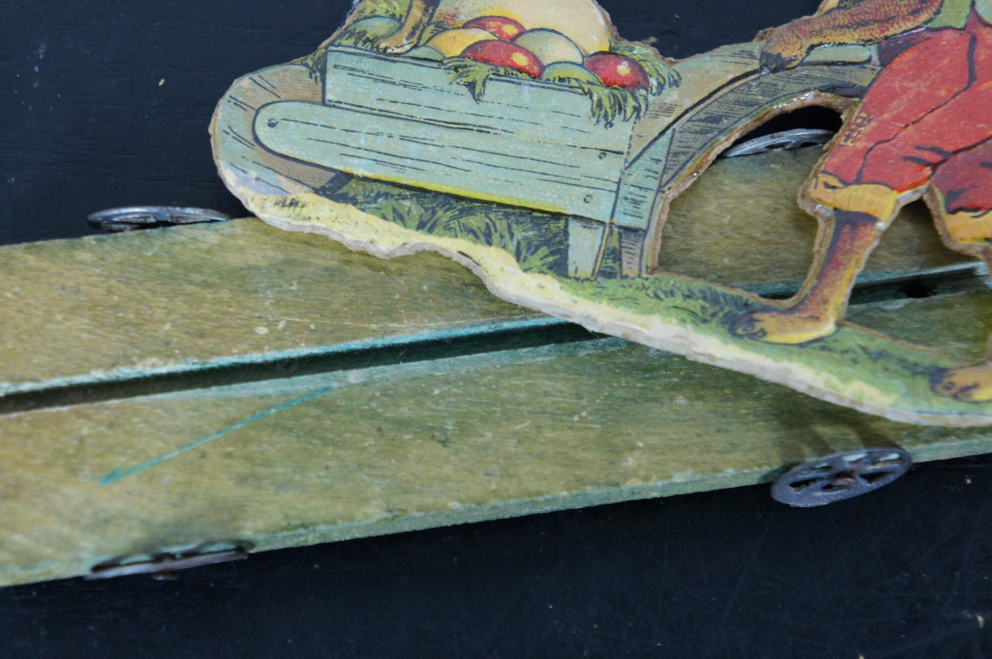 Primitive antique German pull toy featuring a wooden platform with metal wheels, topped with an inset cardboard lithograph print of two anthropomorphic rabbits with a wheelbarrow filled with eggs.
