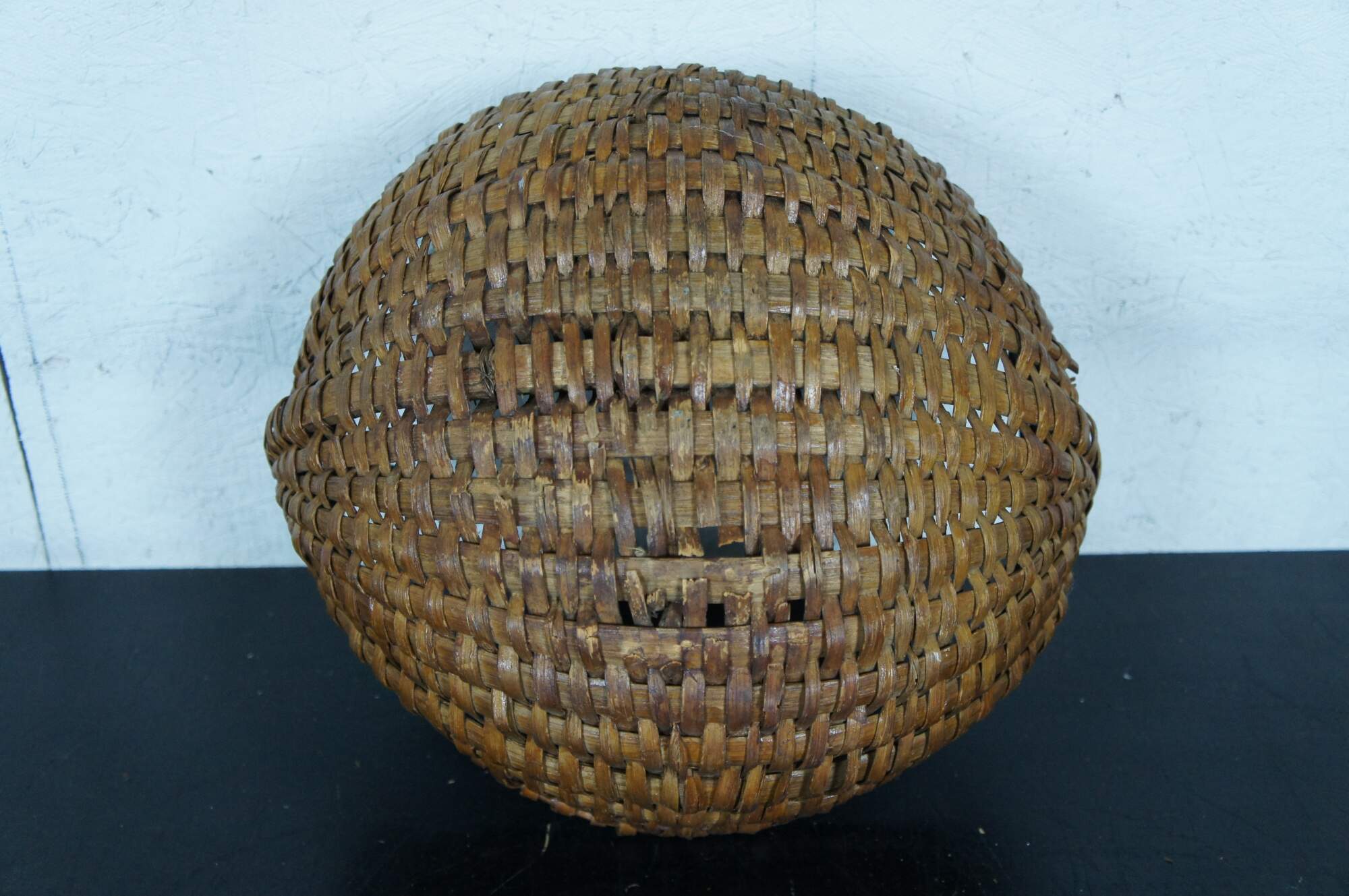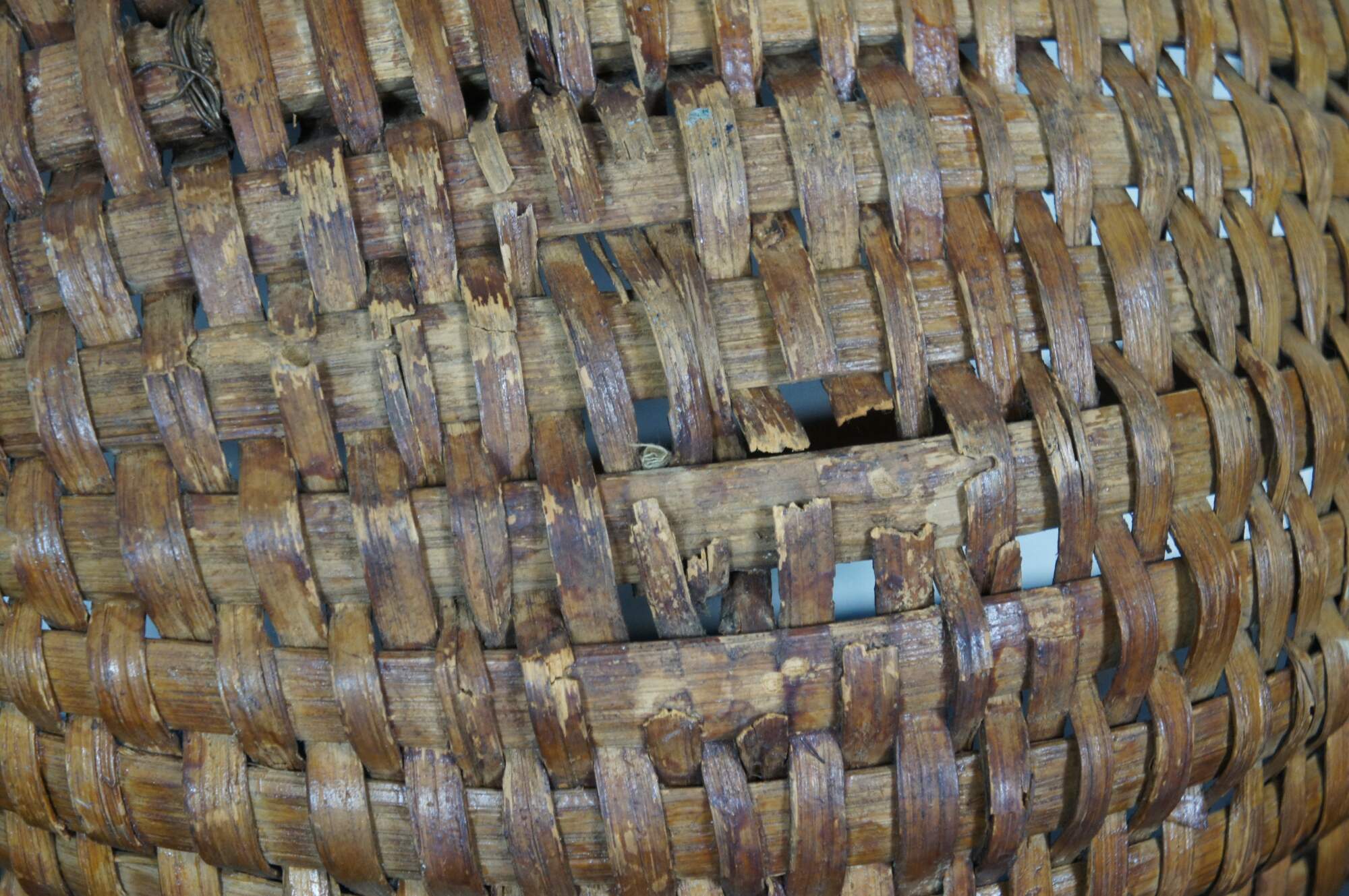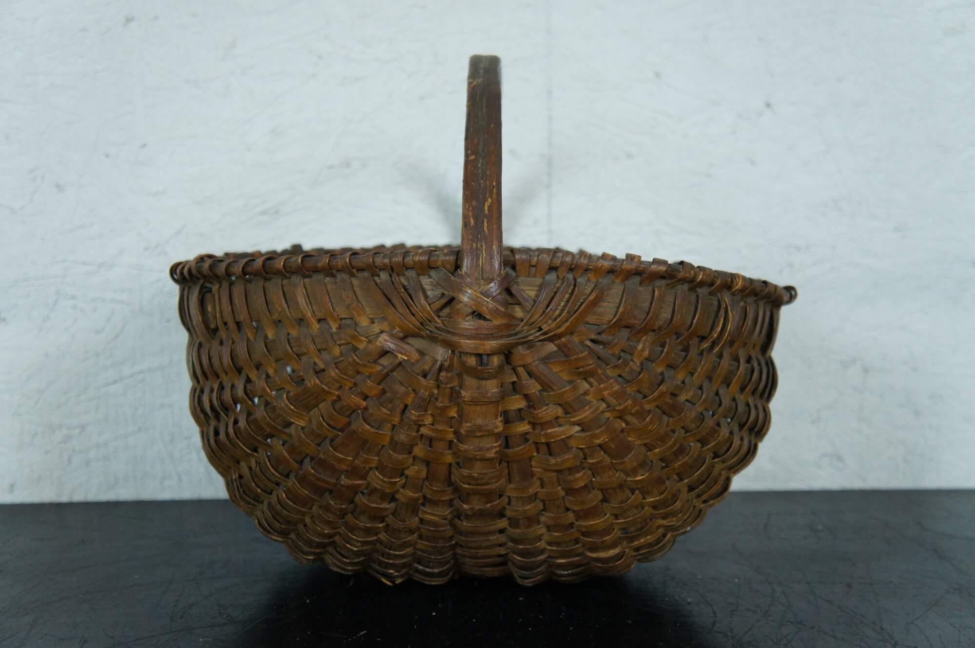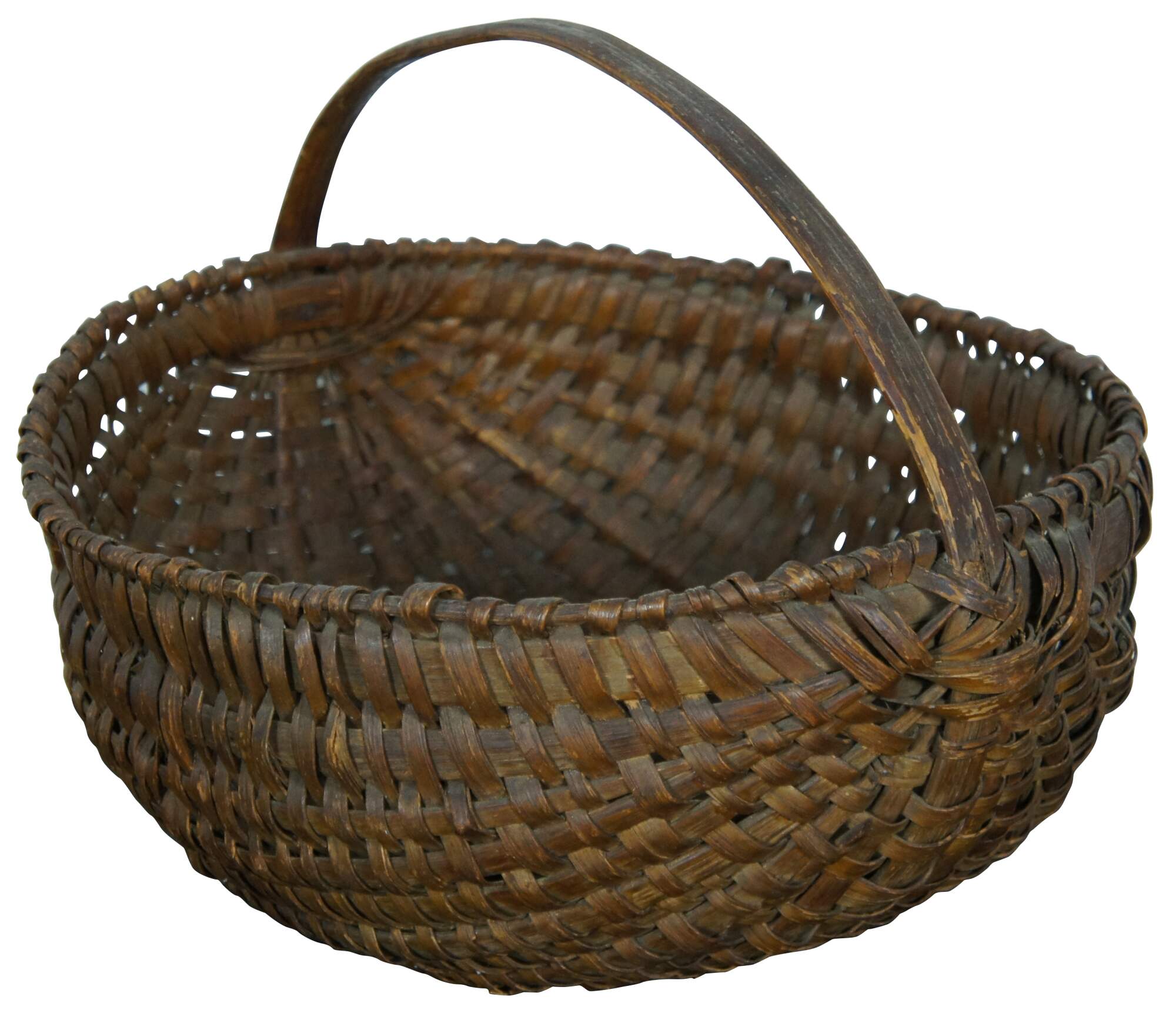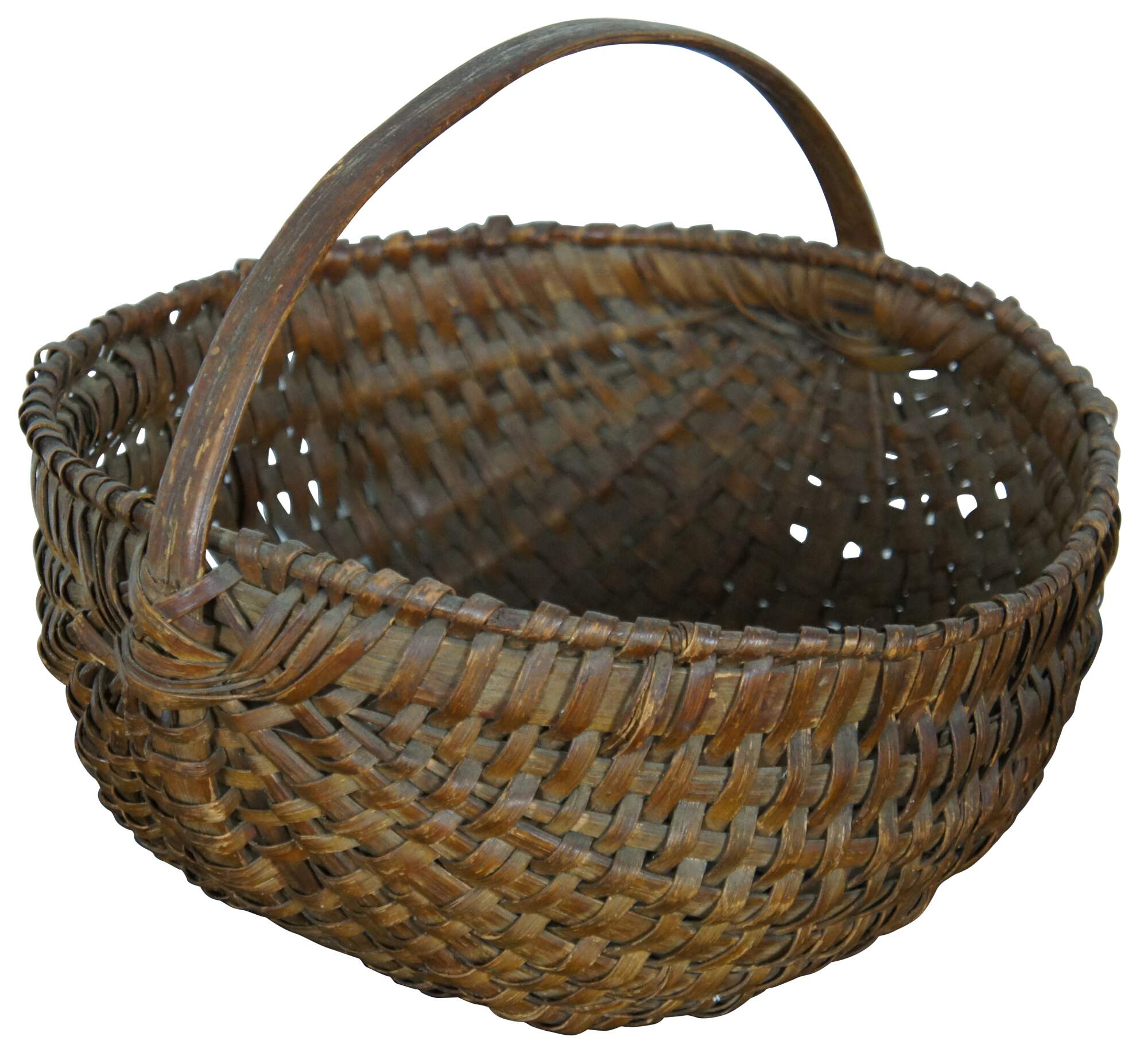 Antique primitive hand woven wicker gathering basket with a round body and fixed handle.