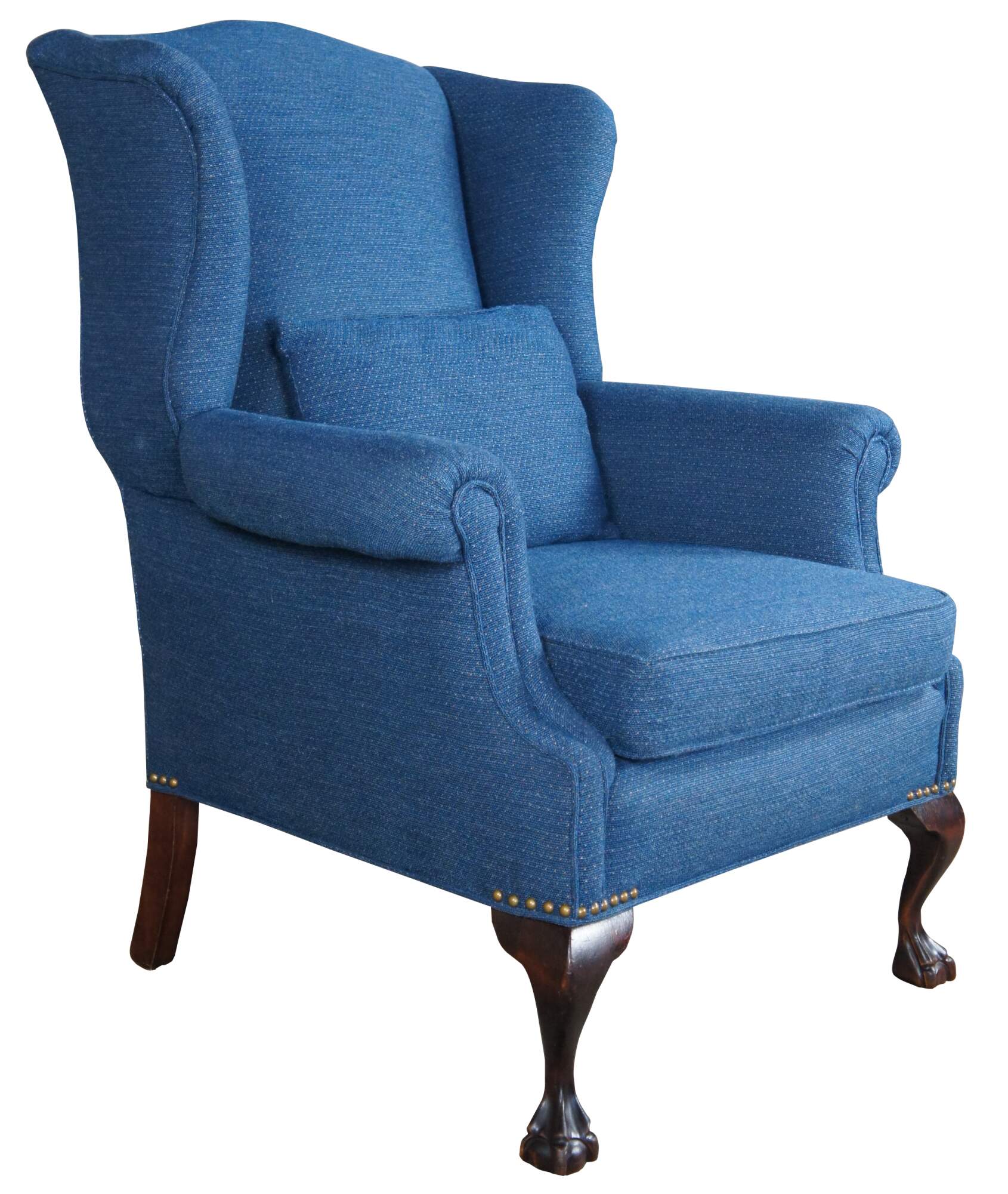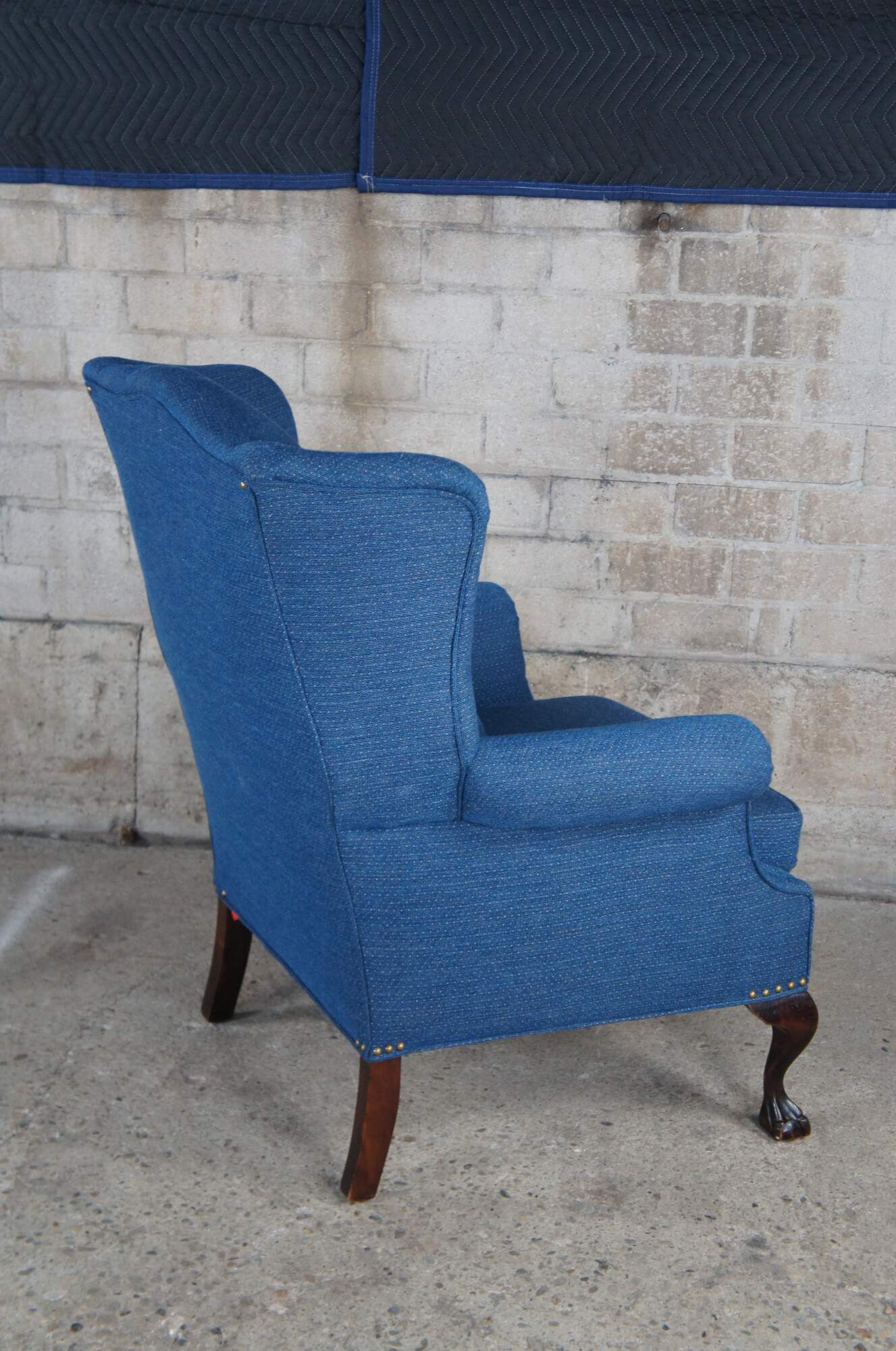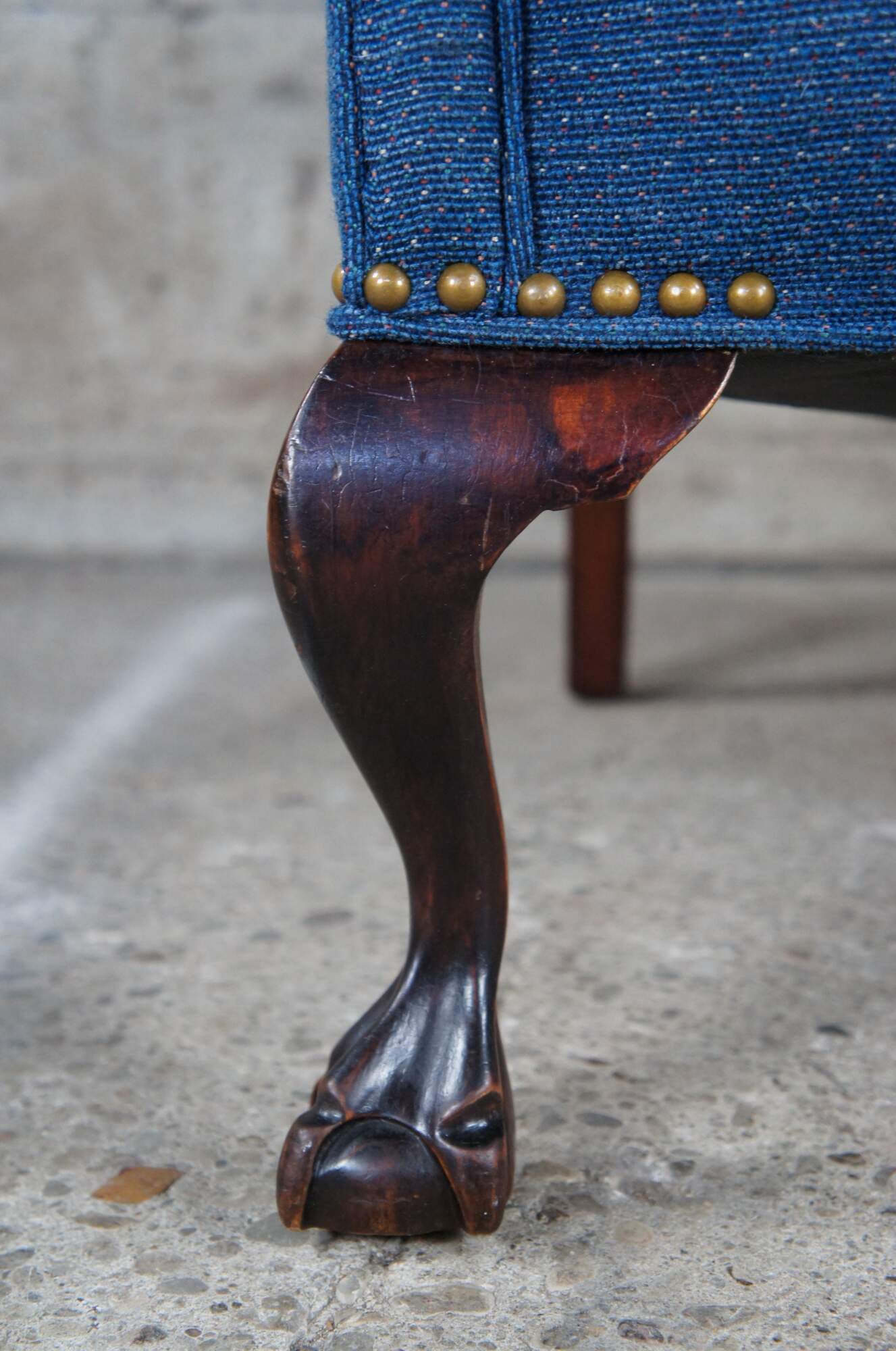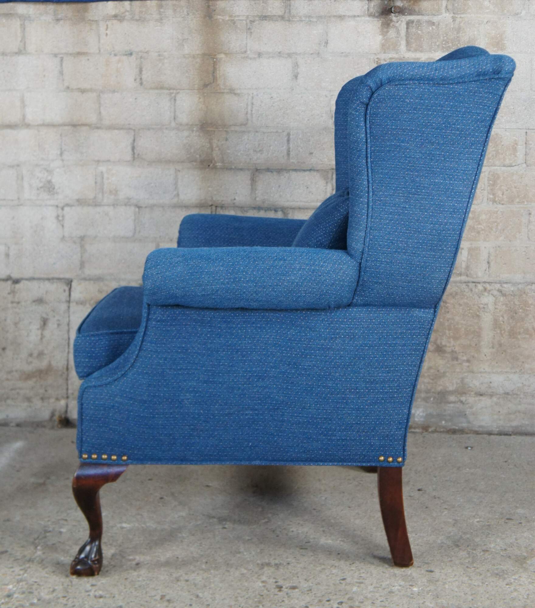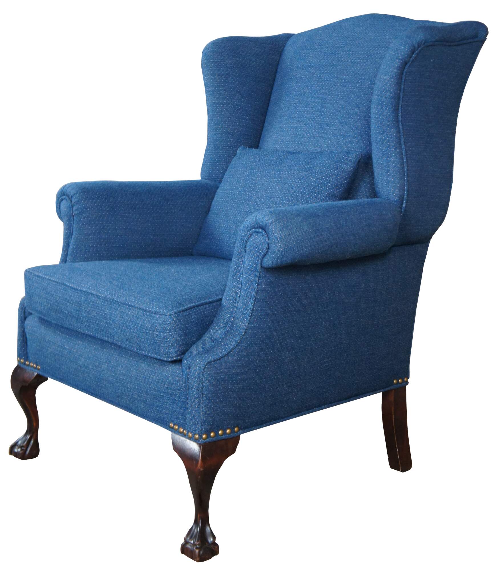 A traditional wingback, circa mid 20th century. Made from mahogany with ball and claw feet. Features a blue upholstery with rolled arms, flared back, bolster pillow and nail head trim.