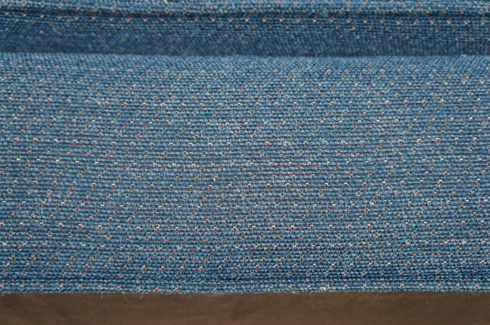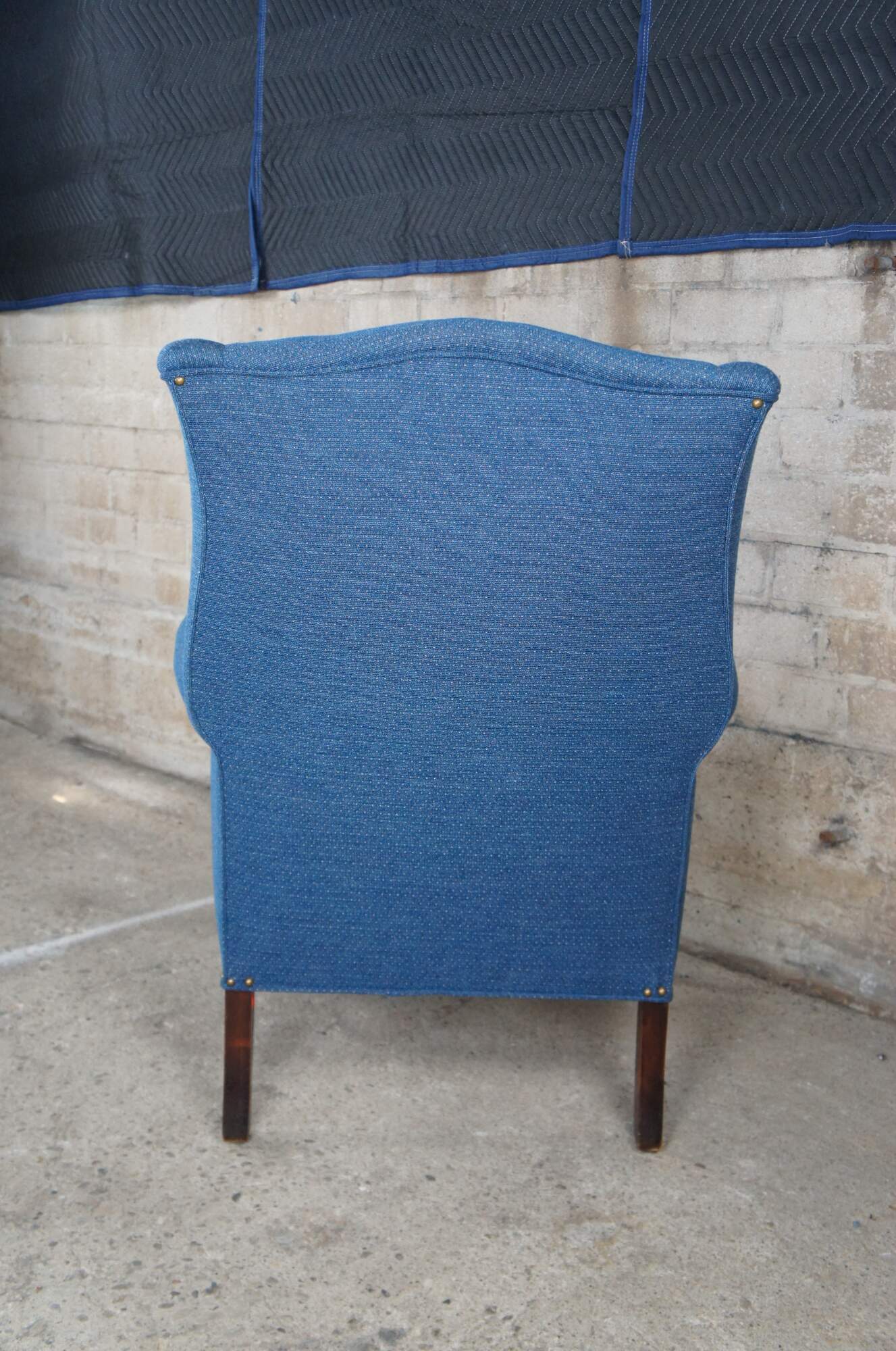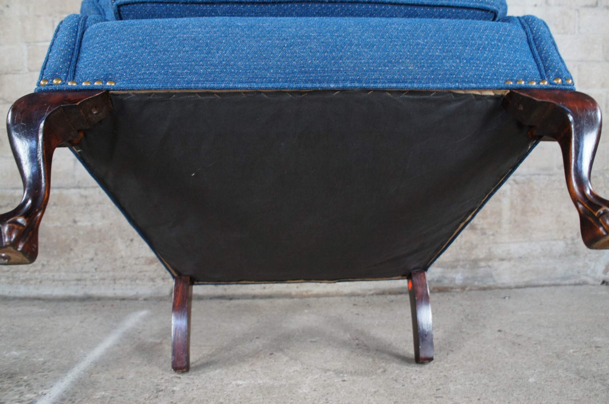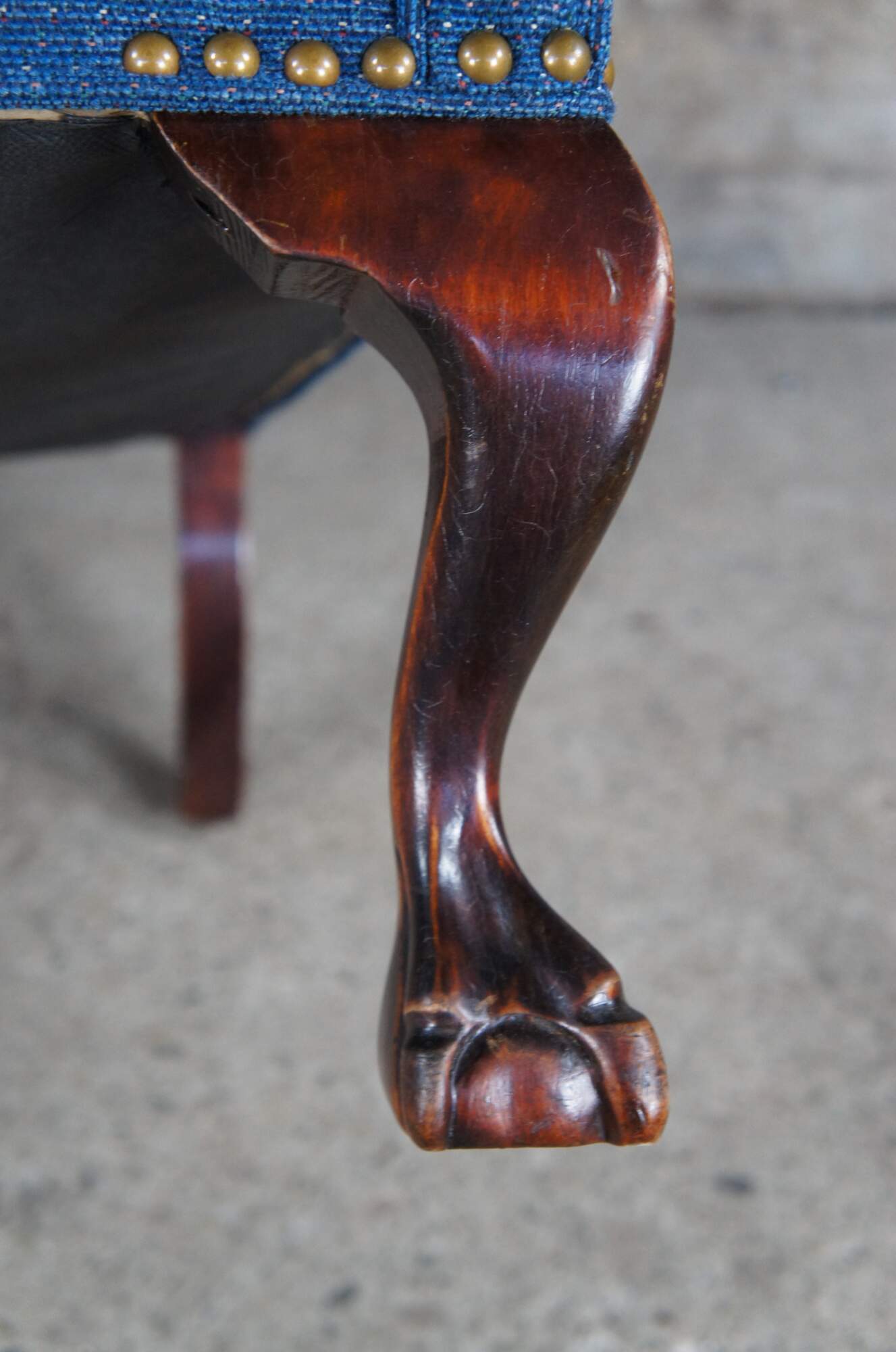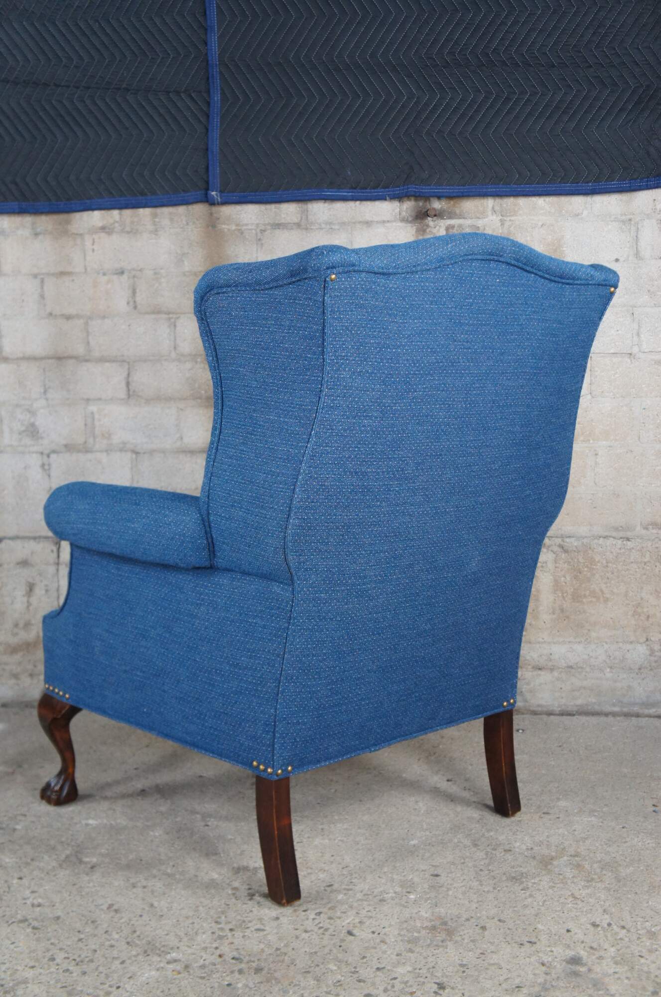 A traditional wingback, circa mid 20th century. Made from mahogany with ball and claw feet. Features a blue upholstery with rolled arms, flared back, bolster pillow and nail head trim.