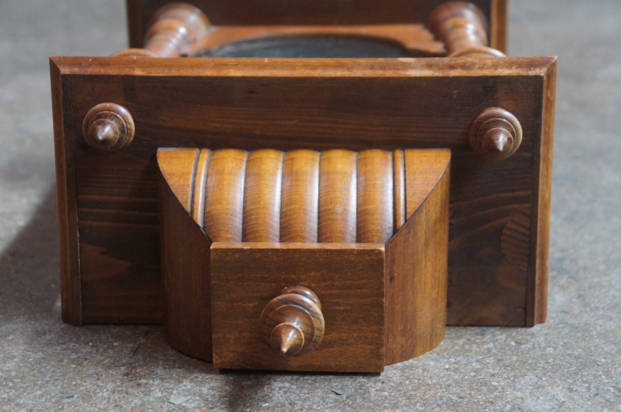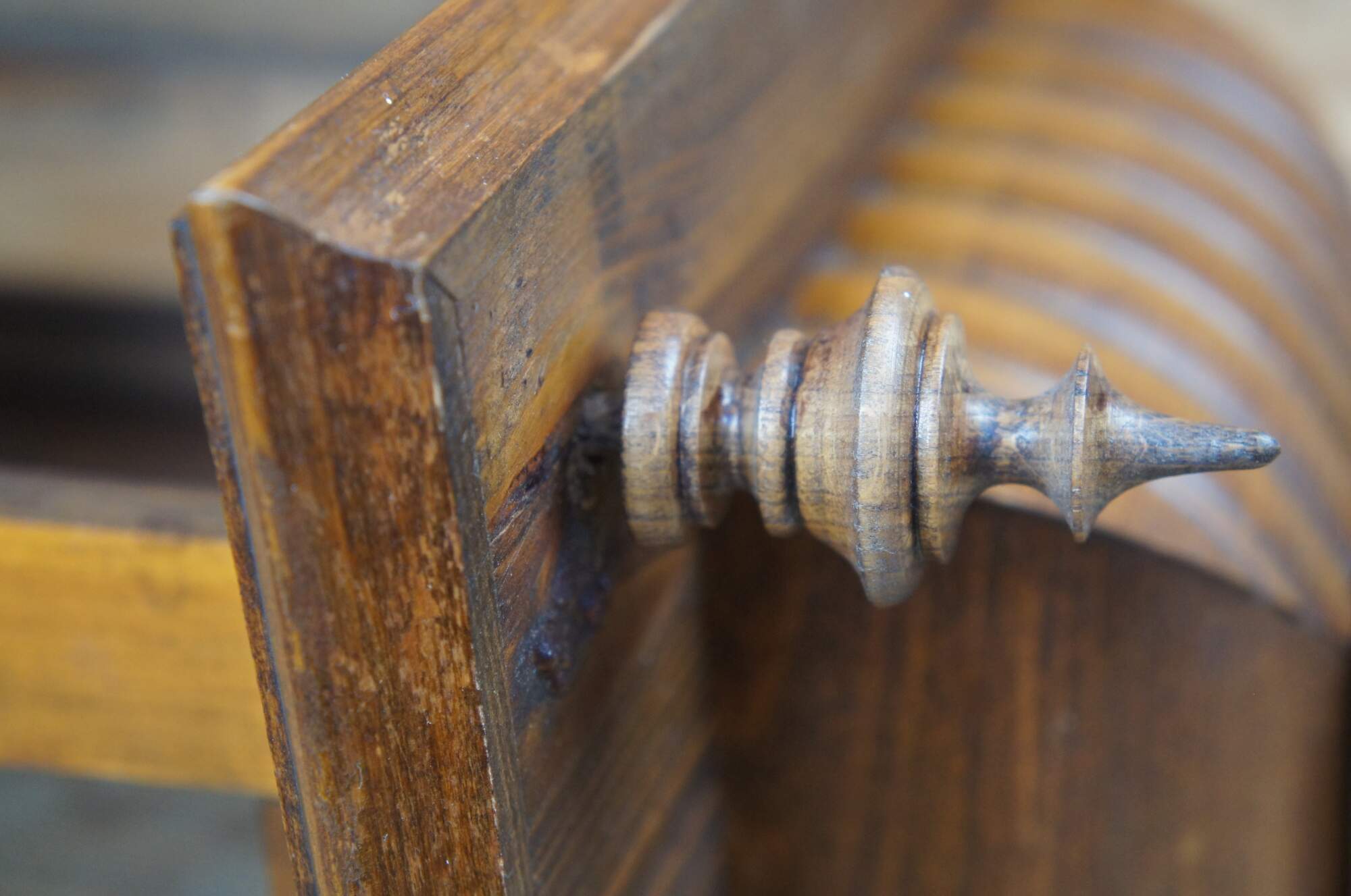 Good antique condition, wear and distressing commensurate with age and use, missing upper finials, working.