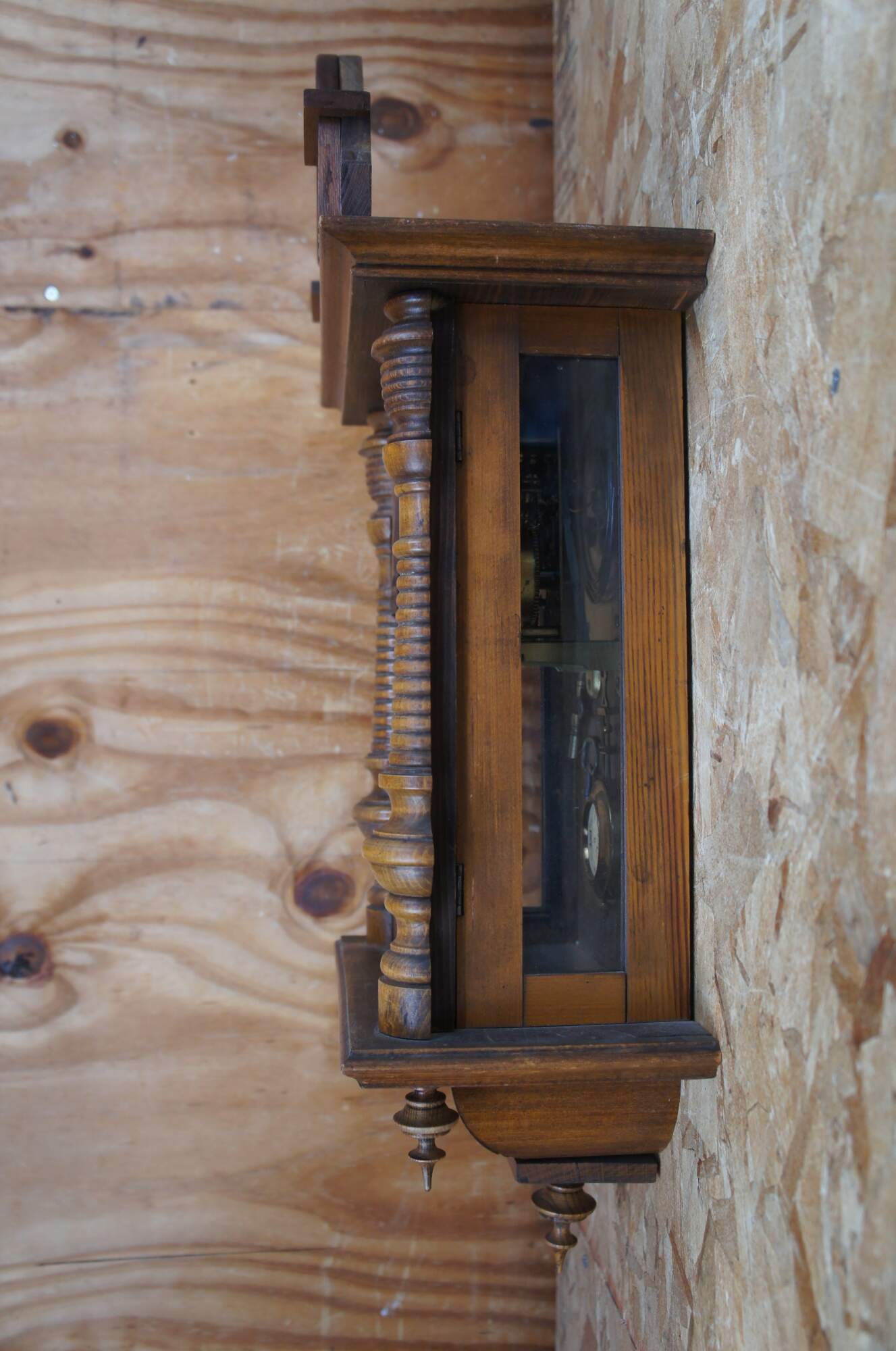 Antique German wall mounted Vienna Regulator clock by Junghans in a walnut case with ribbed / turned accents, drop finials, serpentine and circular crown and roman number face accented with brass.