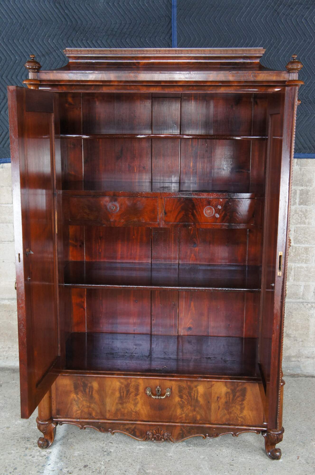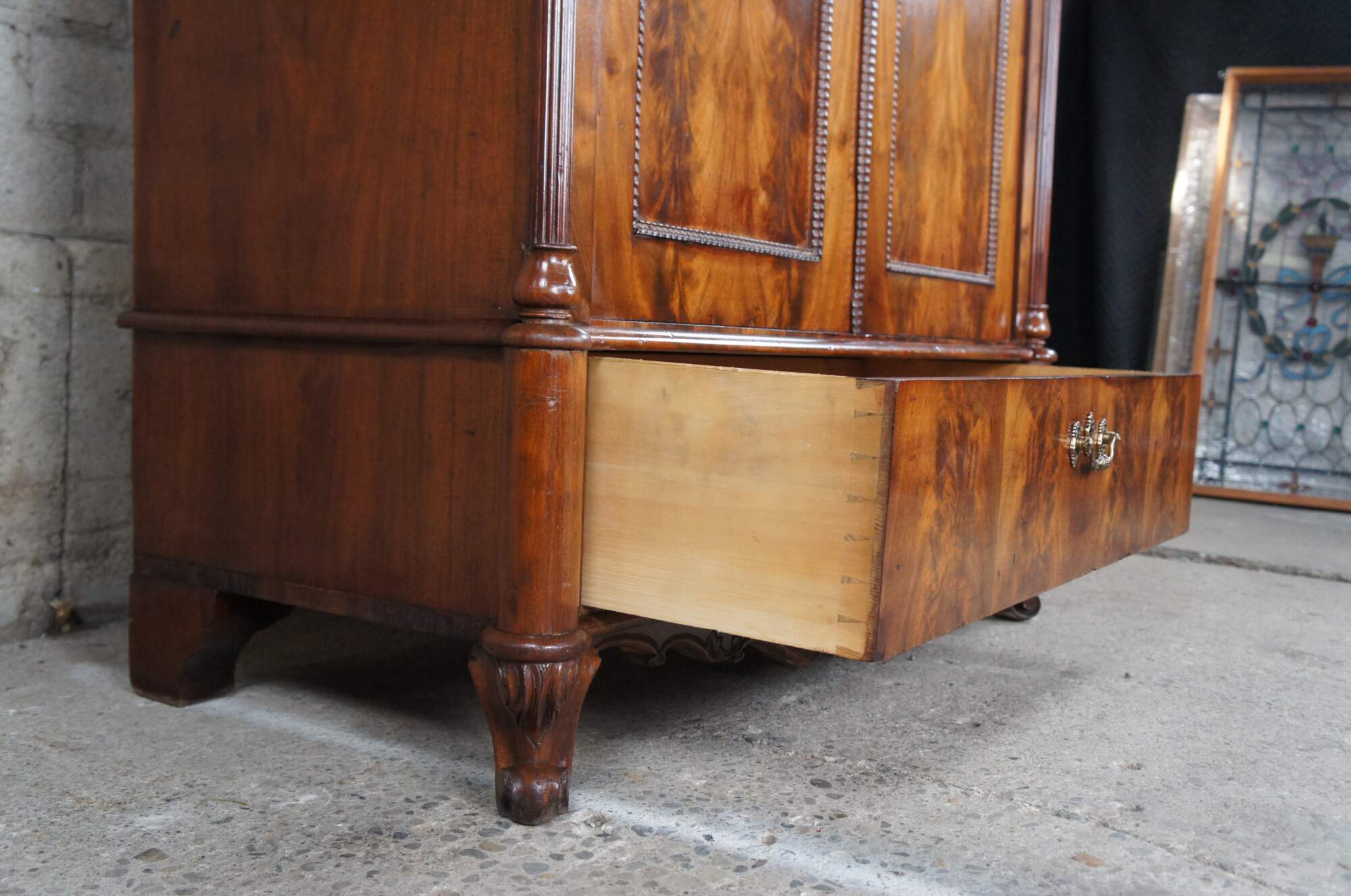 An exquisite American Empire diminutive wardrobe, circa mid 19th century. Made from flame mahogany with double doors over large lower drawer. Features 3/4 cut reeded columns with foliate details, nubby spire finials, ripple trim, brass hardware, serpentine lower apron and cabriole feet. Opens to four shelves and two accessory drawers.