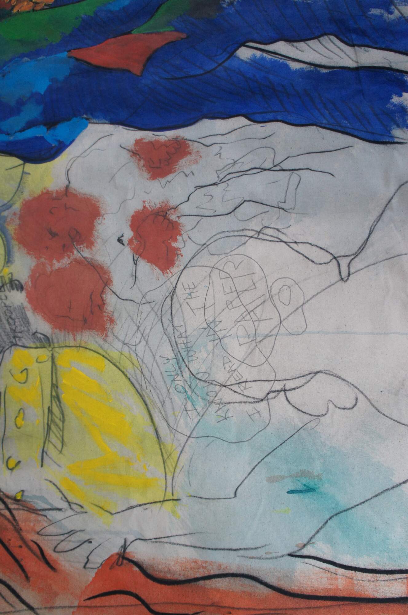 Vintage 1988 David Devaul mixed media expressionist artwork depicting a gunfight in Sparta Kentucky that triggered from a dog dispute. The mural features vibrant abstract acrylic and mixed media.