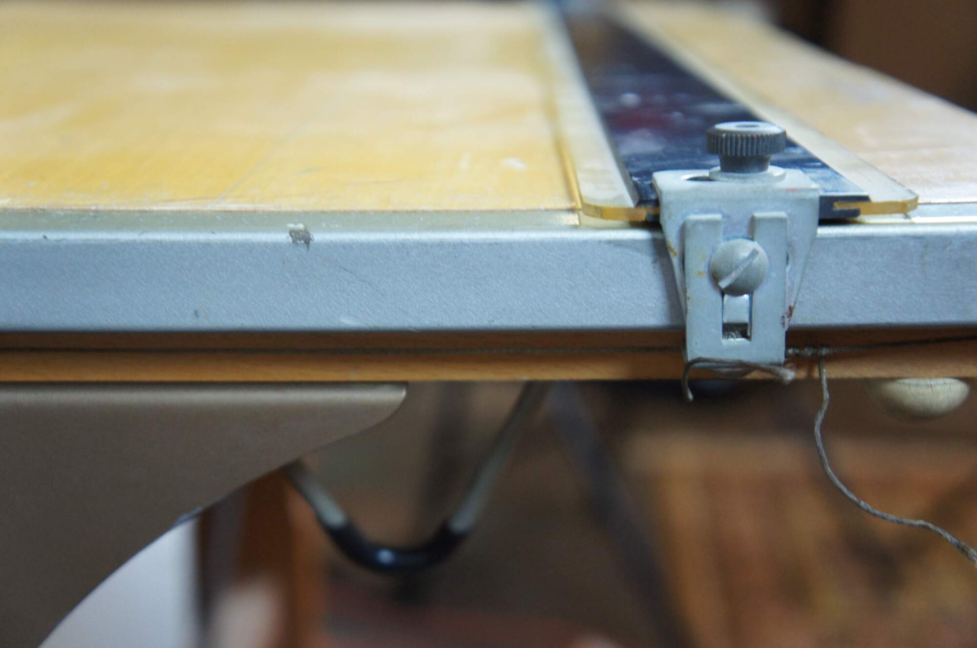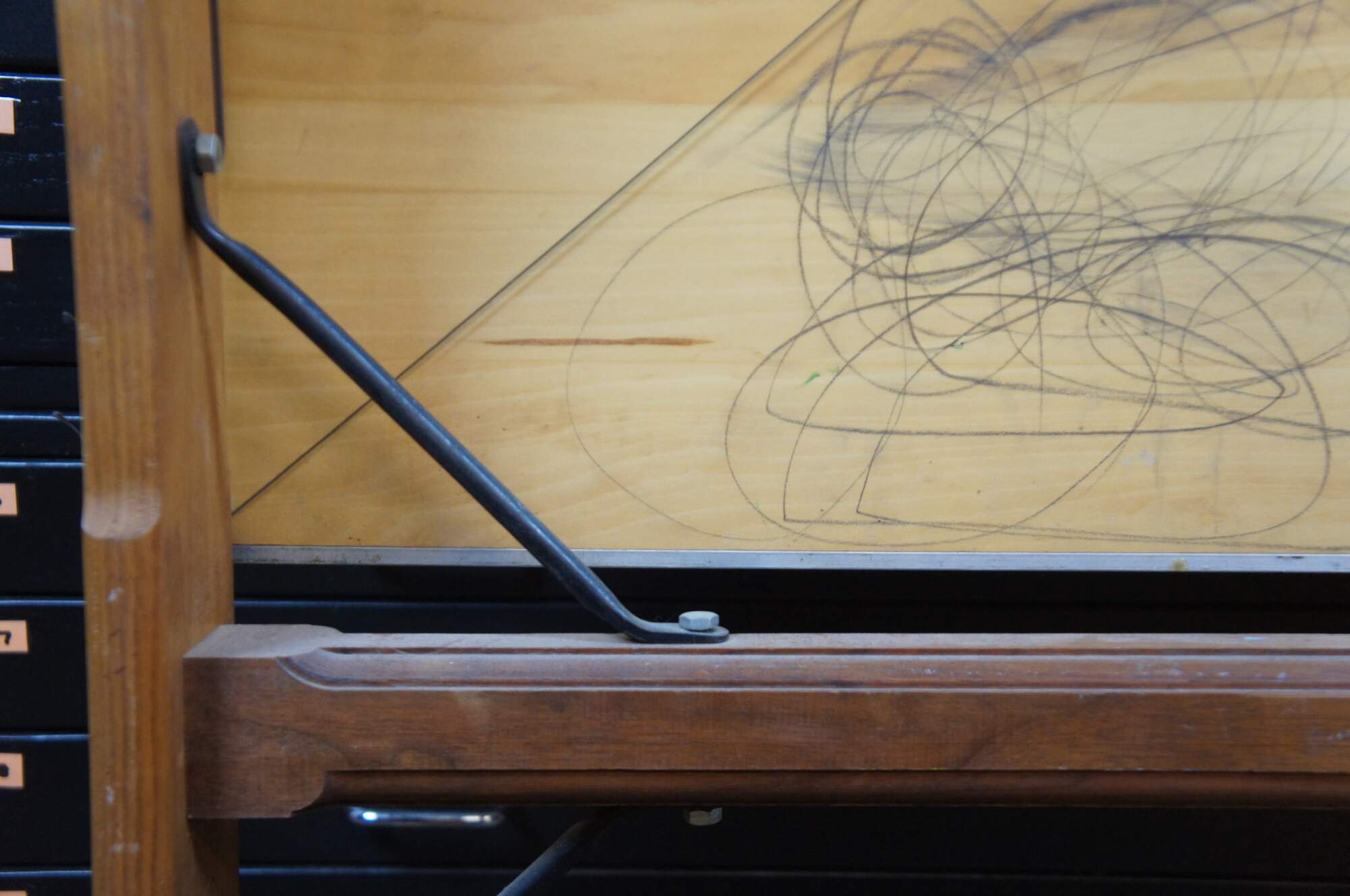 Vintage Mayfield Company Inc. industrial drafting table or architectural desk with wooden trestle legs, surface adjustable from 90 degrees vertical to 90 degrees horizontal, and horizontal straight edge slide. Sheboygan Wisconsin, Equipment for the Modern Drafting Room.