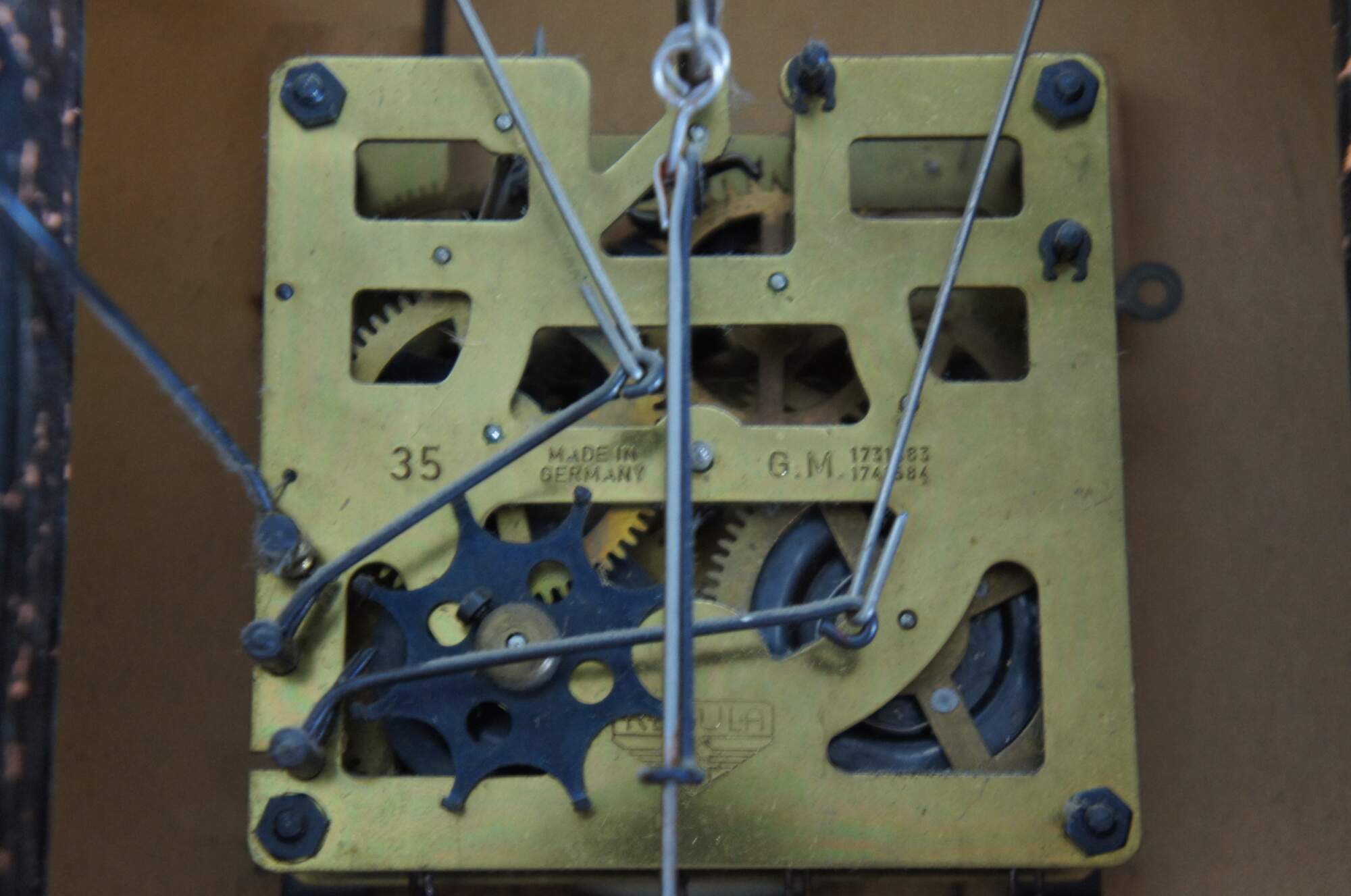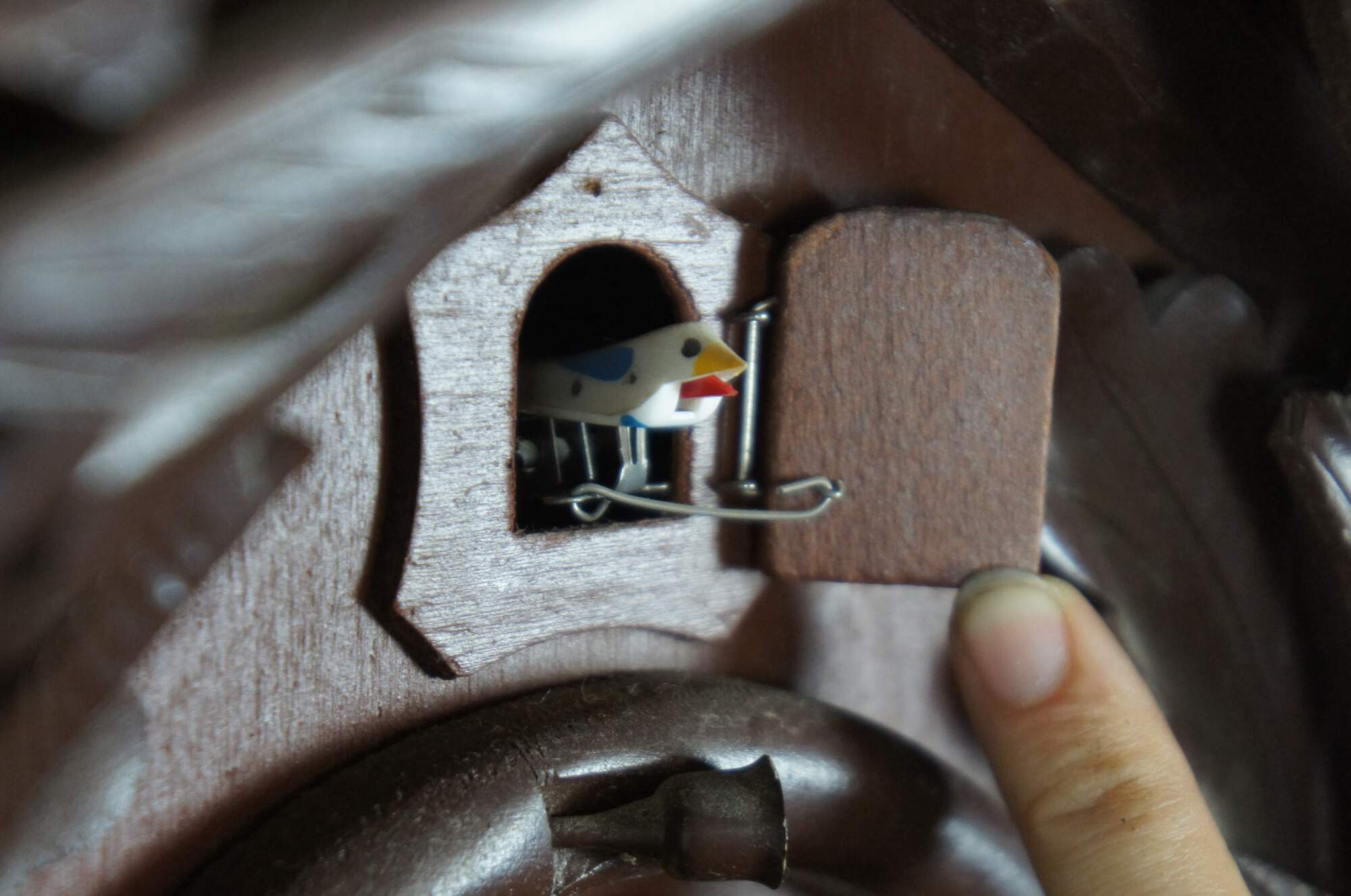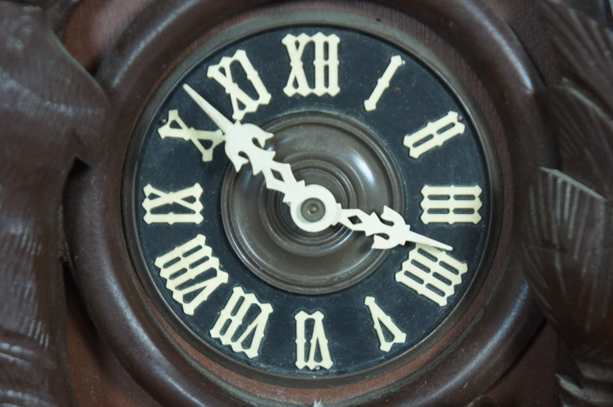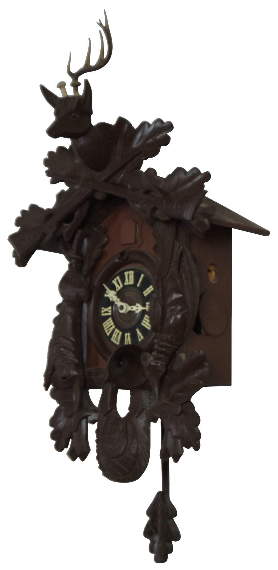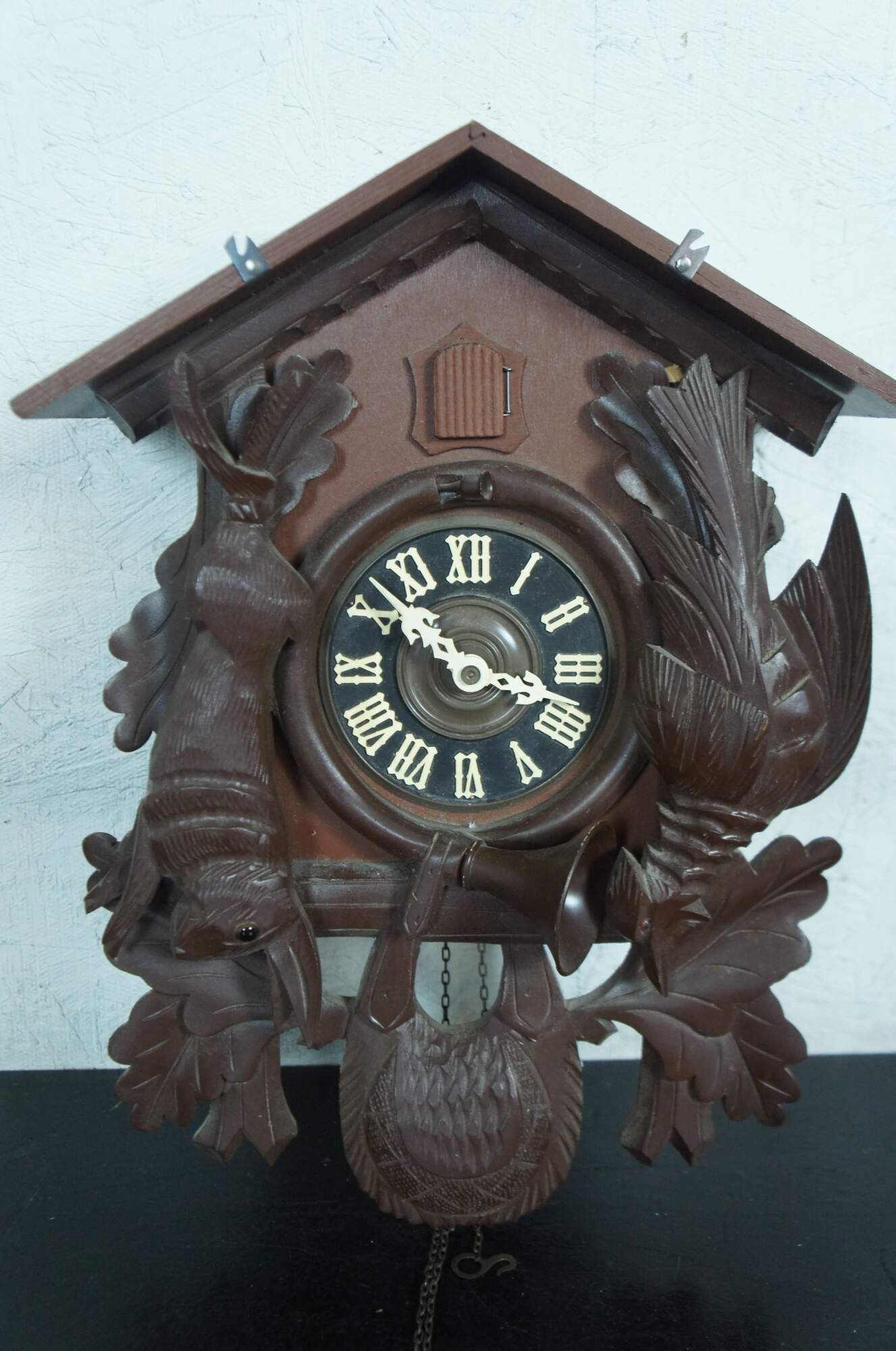 Vintage German Black Forest cuckoo clock with Regula works, decorated in a hunting motif featuring a game bag, forest leaves, rabbit, bird, two guns, deer head, white and blue cuckoo, and a leaf shaped pendulum. Includes two pine cone shaped weights.