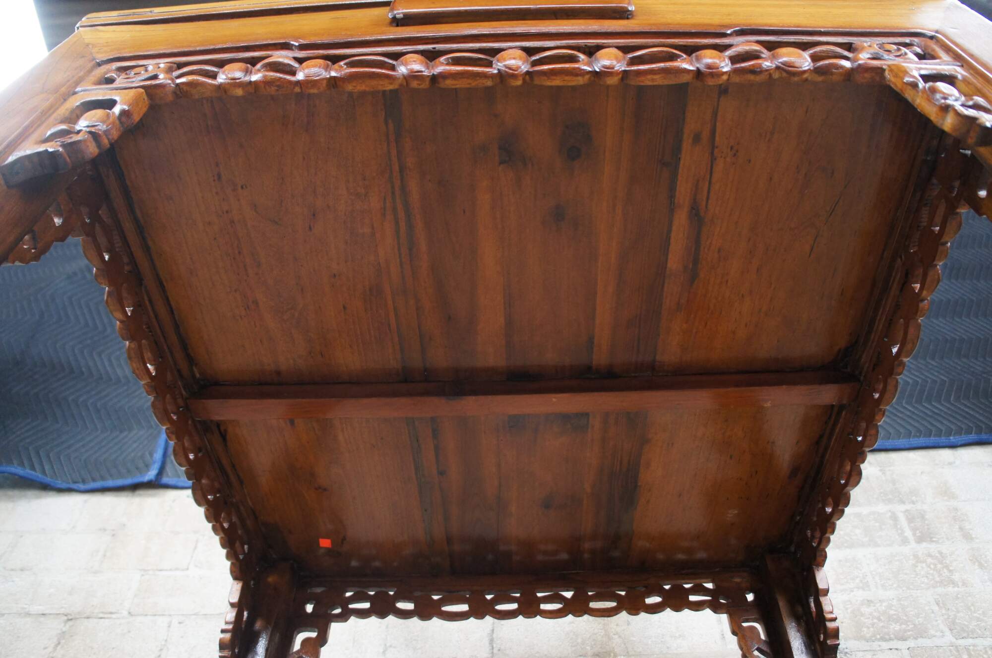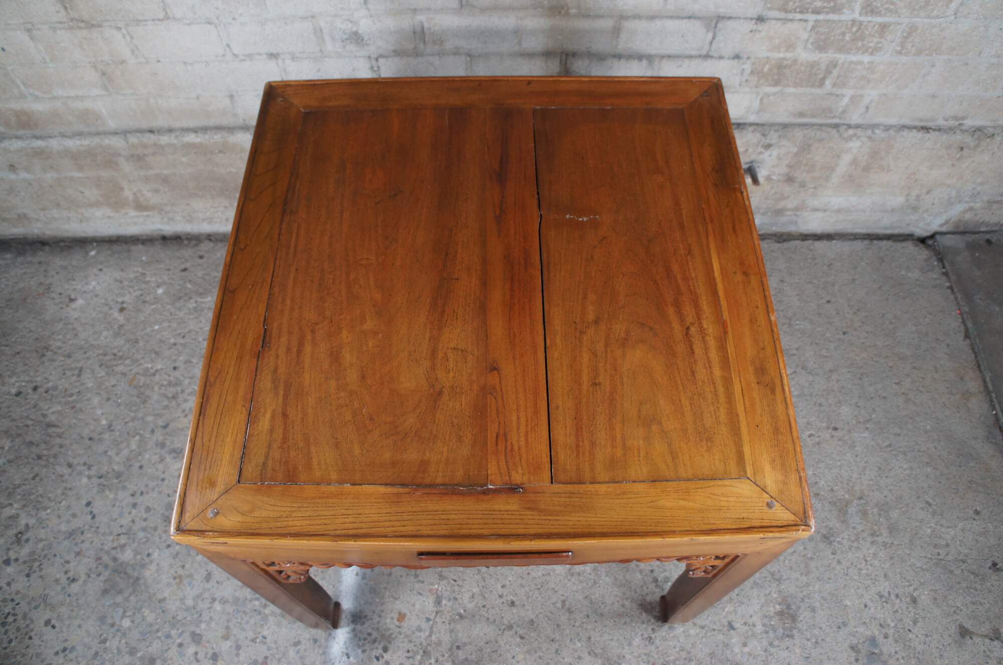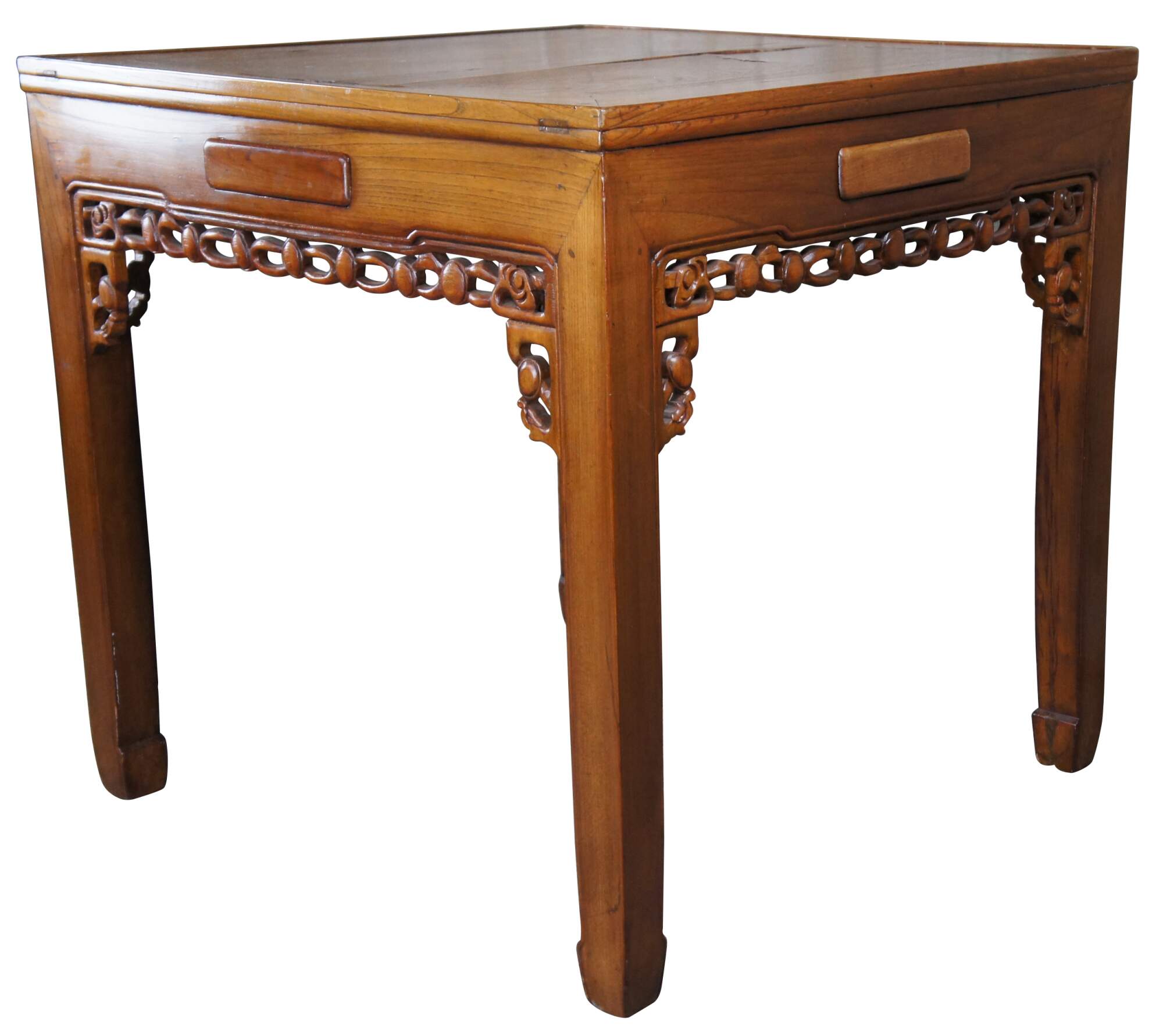 A beautiful Japanese solid elm Mahjong, game or card table. Purchased in Japan during the last quarter of the 20th century. Square form with carved and pierced apron. Features a dovetailed drawer along each side and a glass top.. Built via Mortise and Tenon joinery.