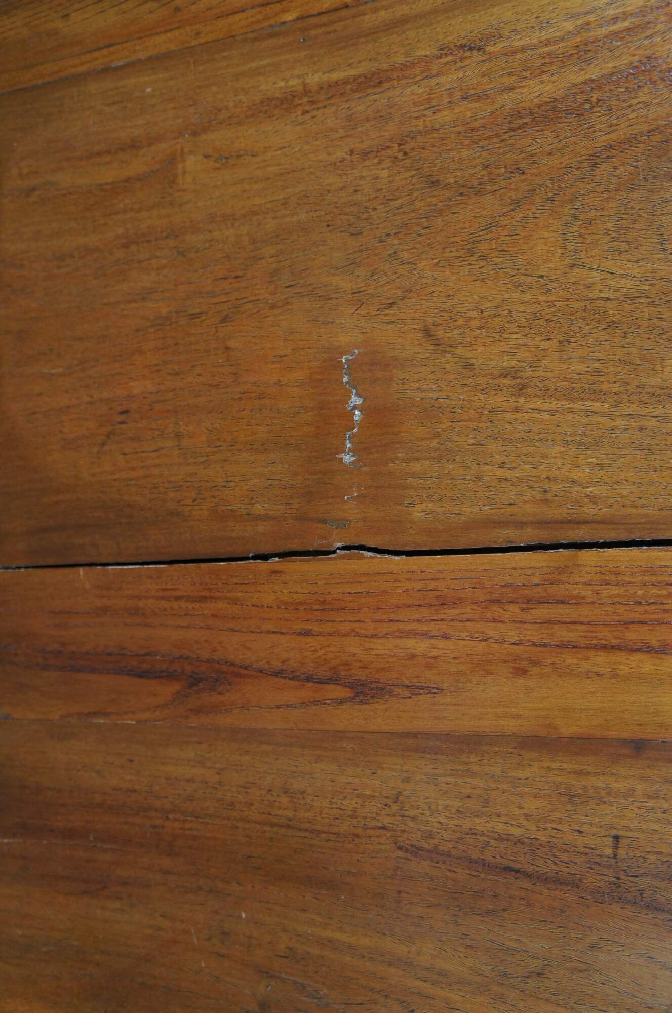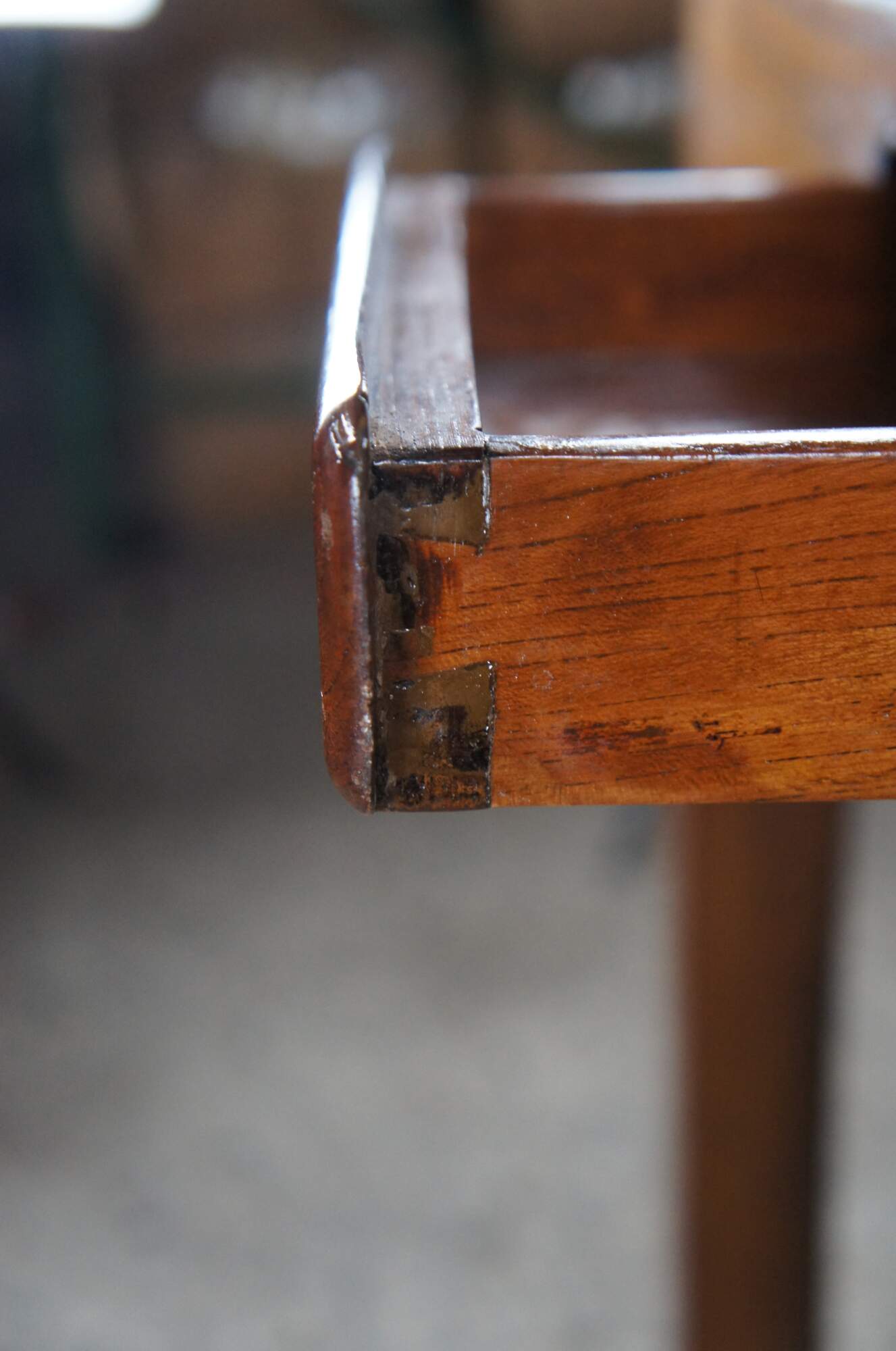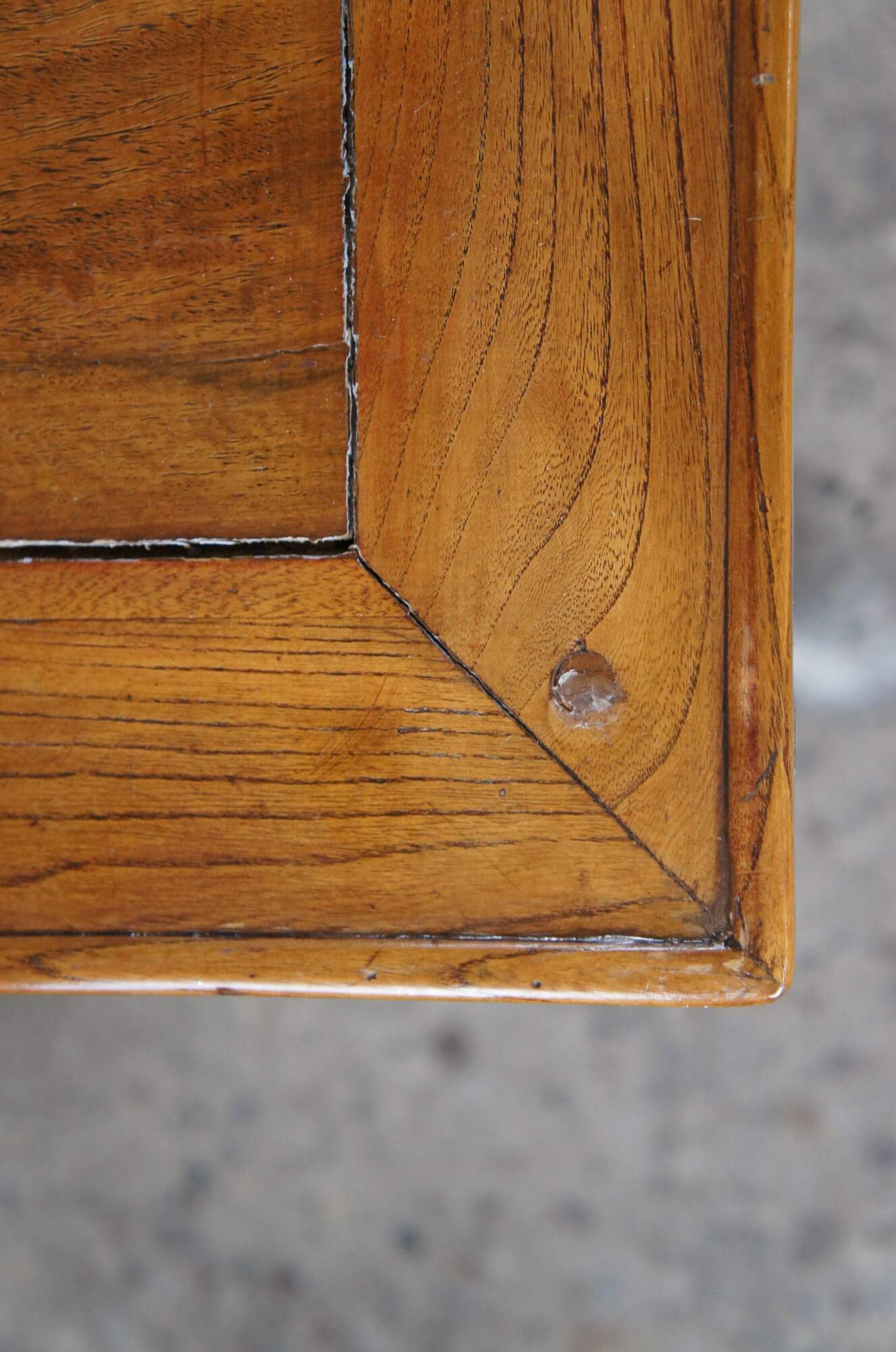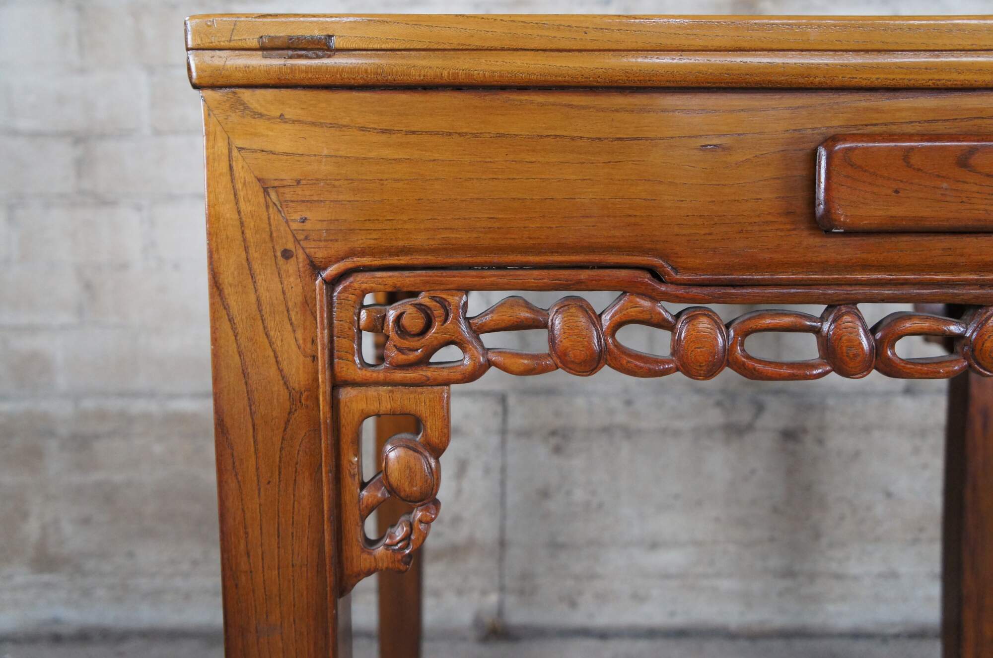 A beautiful Japanese solid elm Mahjong, game or card table. Purchased in Japan during the last quarter of the 20th century. Square form with carved and pierced apron. Features a dovetailed drawer along each side and a glass top.. Built via Mortise and Tenon joinery.